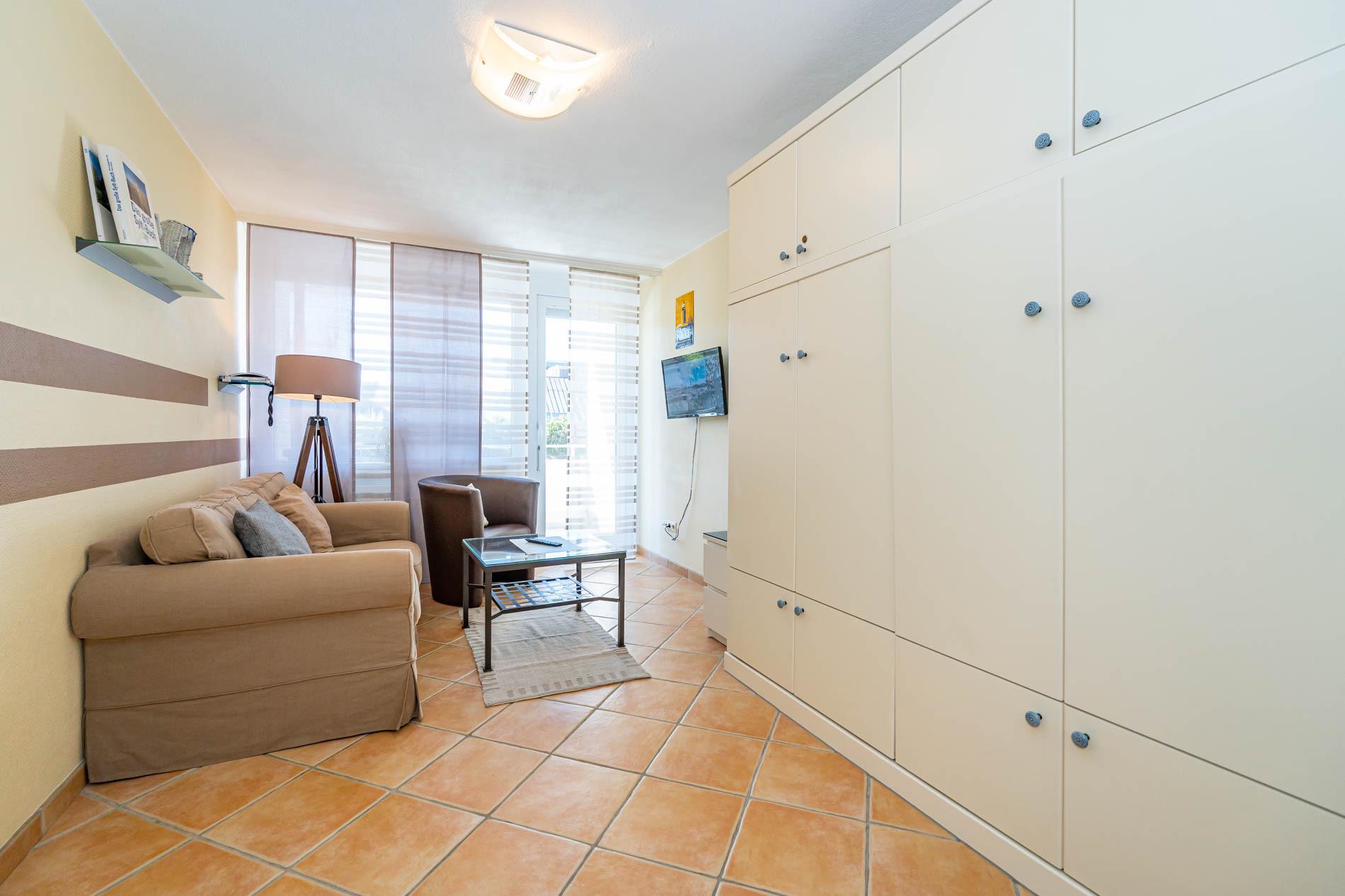 Der Wohn-/Schlafraum besteht aus einer gemütlichen Couch, einem Sessel, einem separaten komfortablen Essplatz, Doppelschrankbett (Betten sind einzeln ausklappbar), Kabel-Flachbild-TV, Radio/CD.
