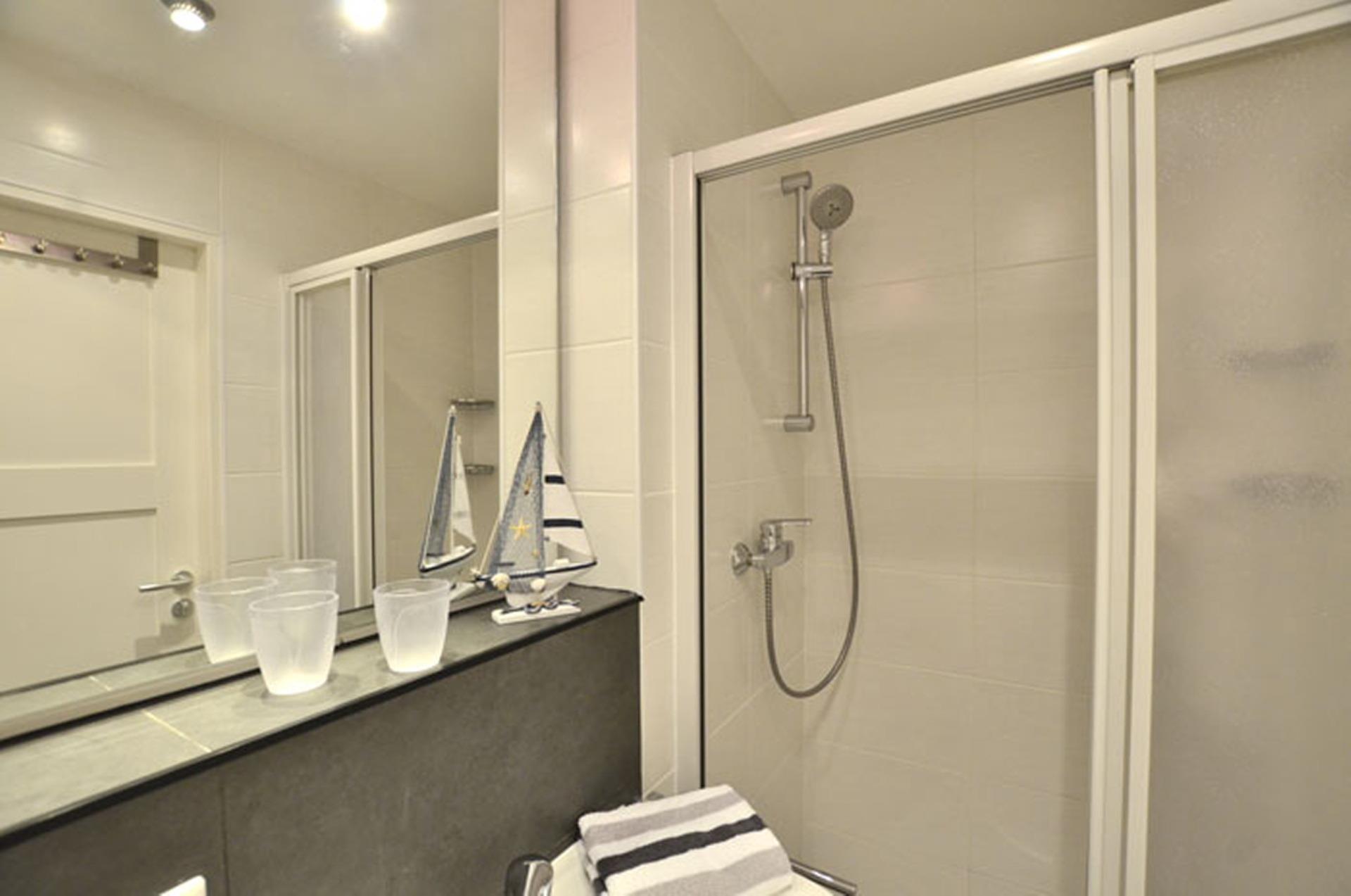 Im neuen, hochwertigen Bad befindet sich eine superflache Duschanlage, ein WC, ein Waschtisch, ein Handtuchtrockner und ein Fön.