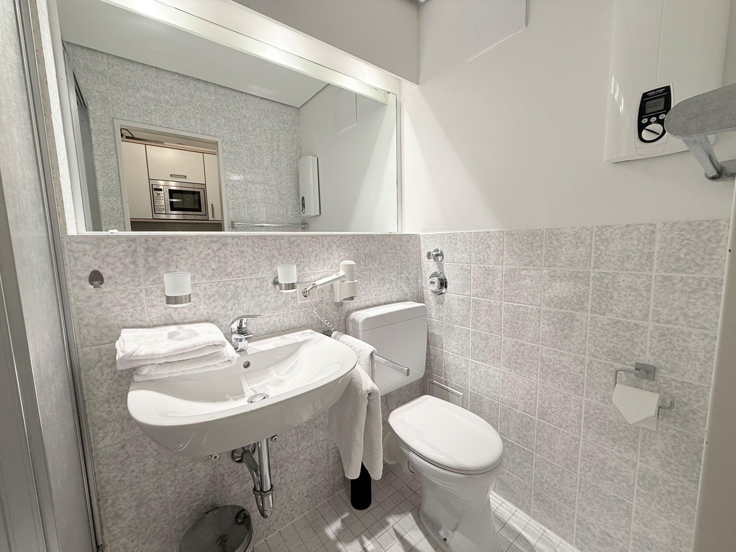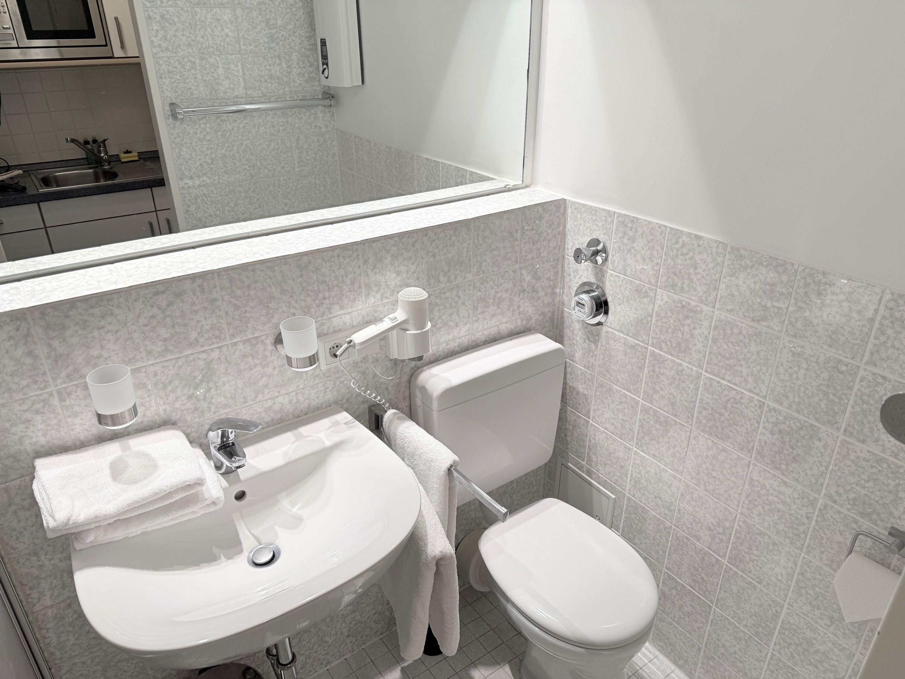 Im Bad befinden sich eine Dusche, ein WC und ein Waschtisch.