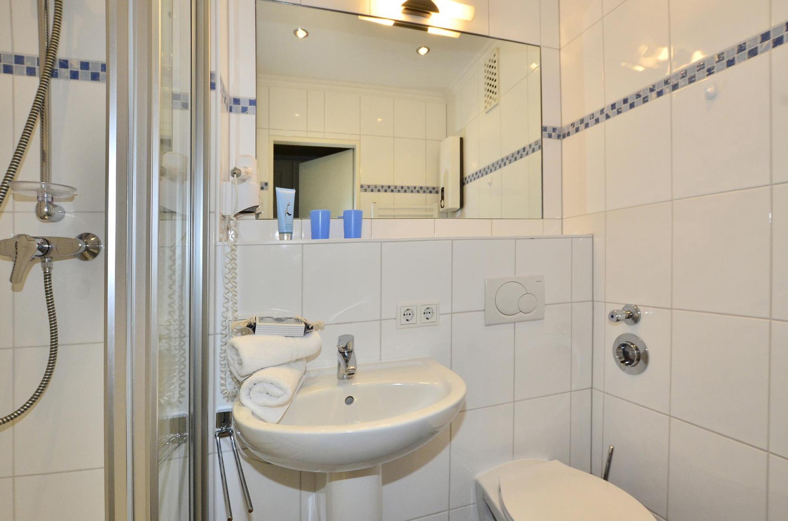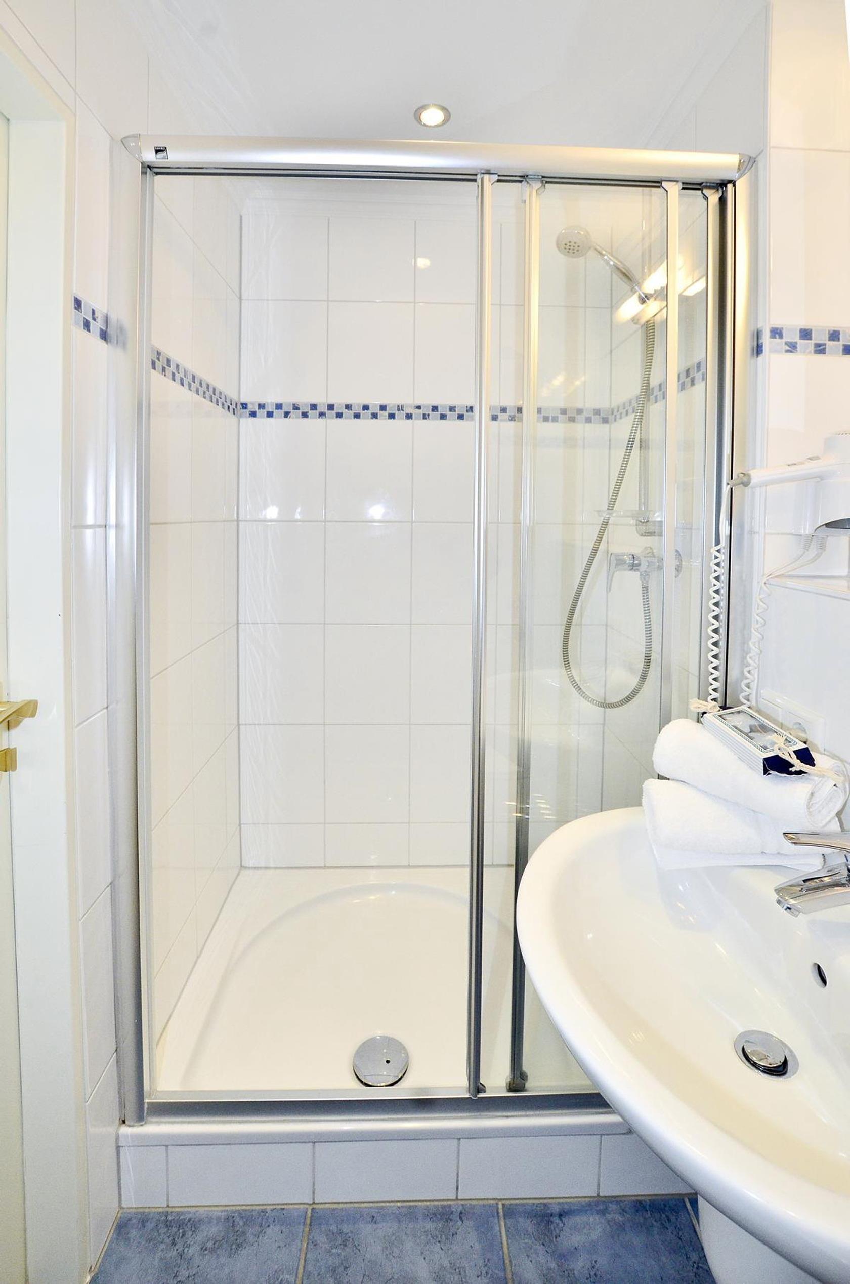 Im Bad befinden sich eine superflache Duschanlage, ein WC, ein Waschtisch und ein Fön.