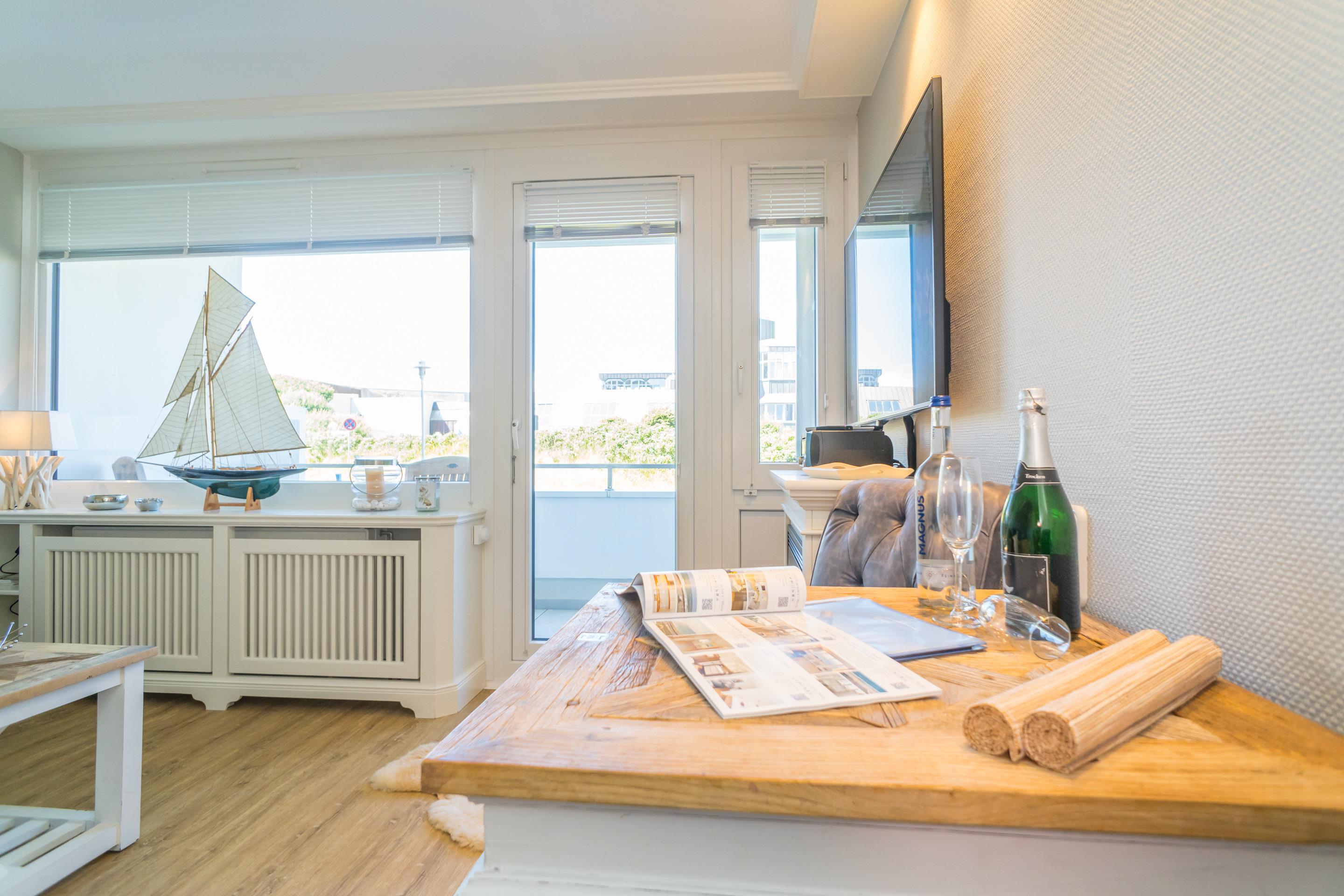 Das lichtdurchflutete, kombinierte Wohn-/Schlafzimmer mit edlem Designfußboden verfügt über einen großen Flat-TV. Ein gemütliches 2-er Sofa und ein Sessel versprechen Wohlfühlurlaub von Anfang an.