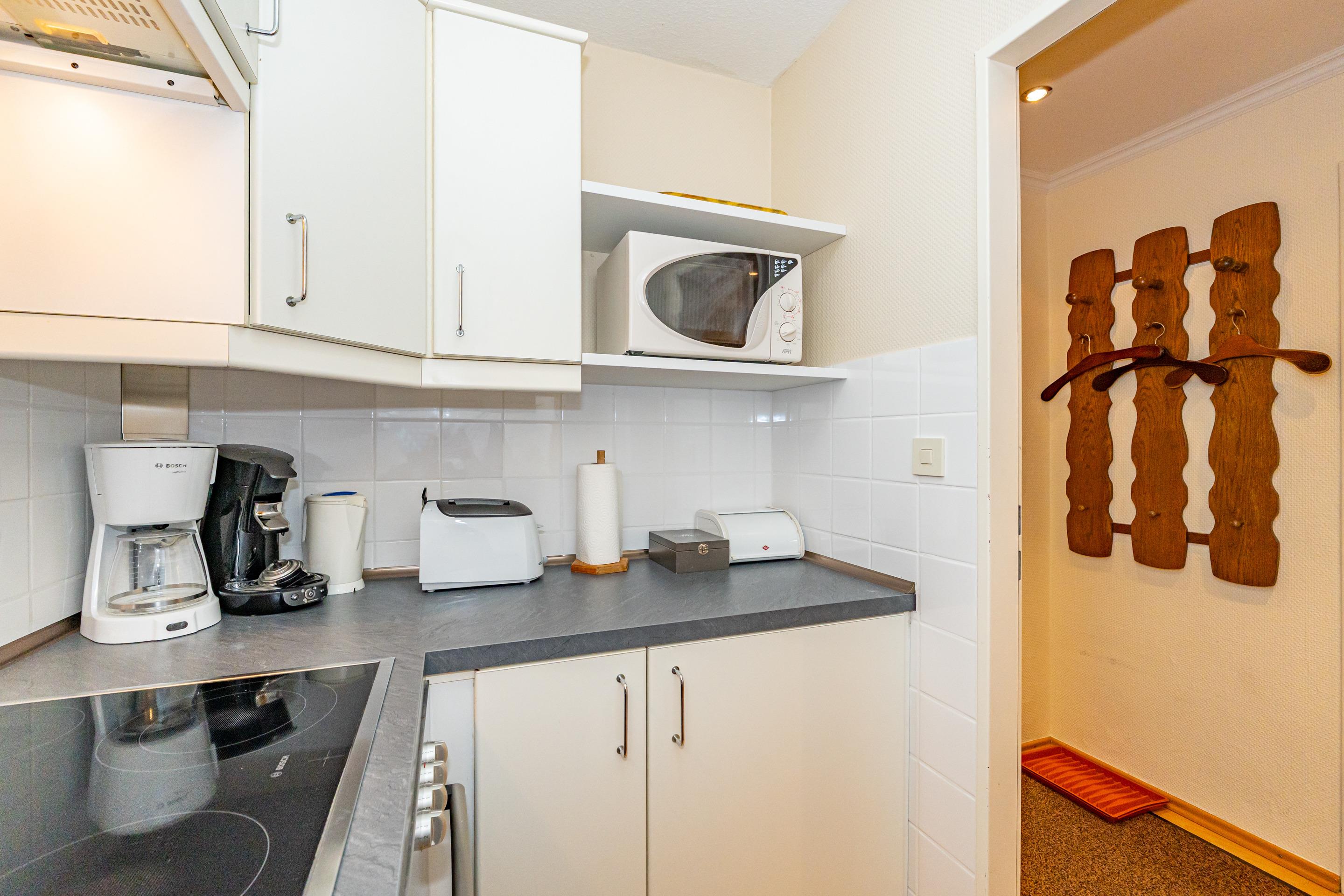 Die separate Küche hat einen Herd mit 4-Kochplatten und Backofen, Mikrowelle (mit Grillfunktion), Kühlschrank mit 2 3*-Tiefkühlfächern. Kaffeemaschine, Wasserkocher und Toaster gehören zur Grundausstattung.