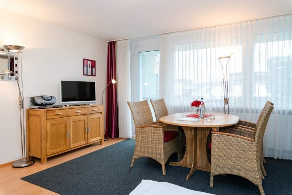 Großzügige 1-Zimmer-Ferienwohnung (ca. 40 qm) in der 1. Etage zur Seeseite mit Westloggia (Nachmittagssonne, mit Balkonmöbeln und Auflagen) für max. 3 Personen.