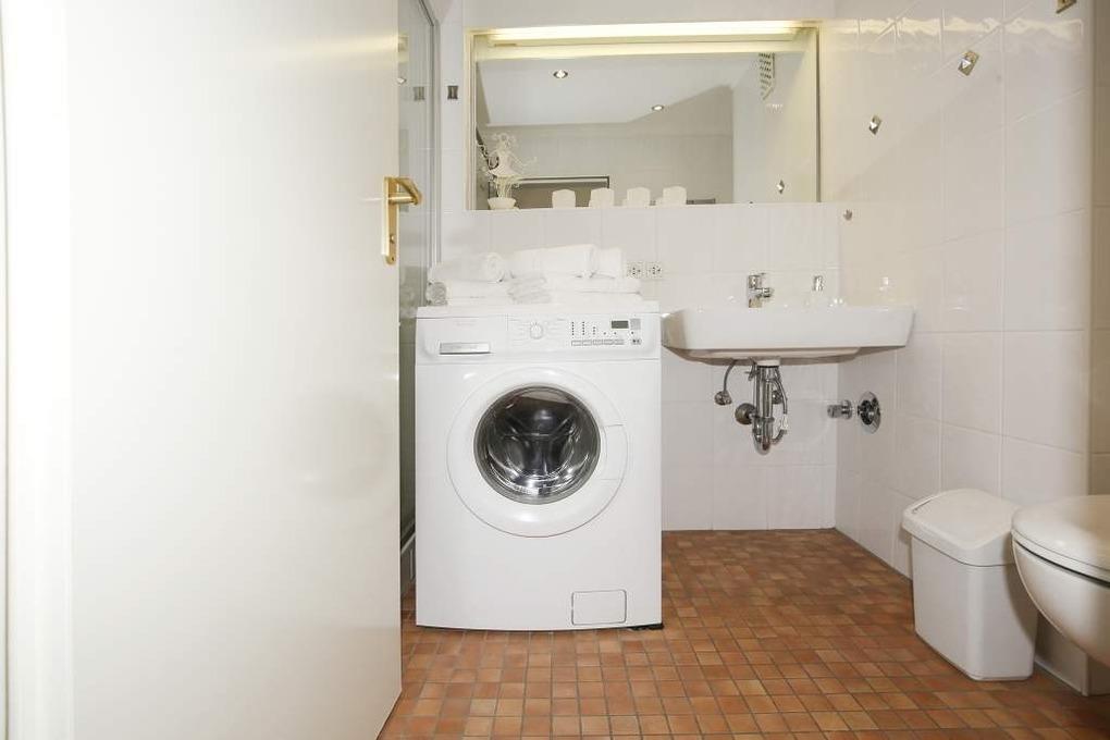 Im Bad befinden sich eine Dusche mit großer Regen- und Handdusche, ein WC, ein Waschtisch und ein Waschtrockner.