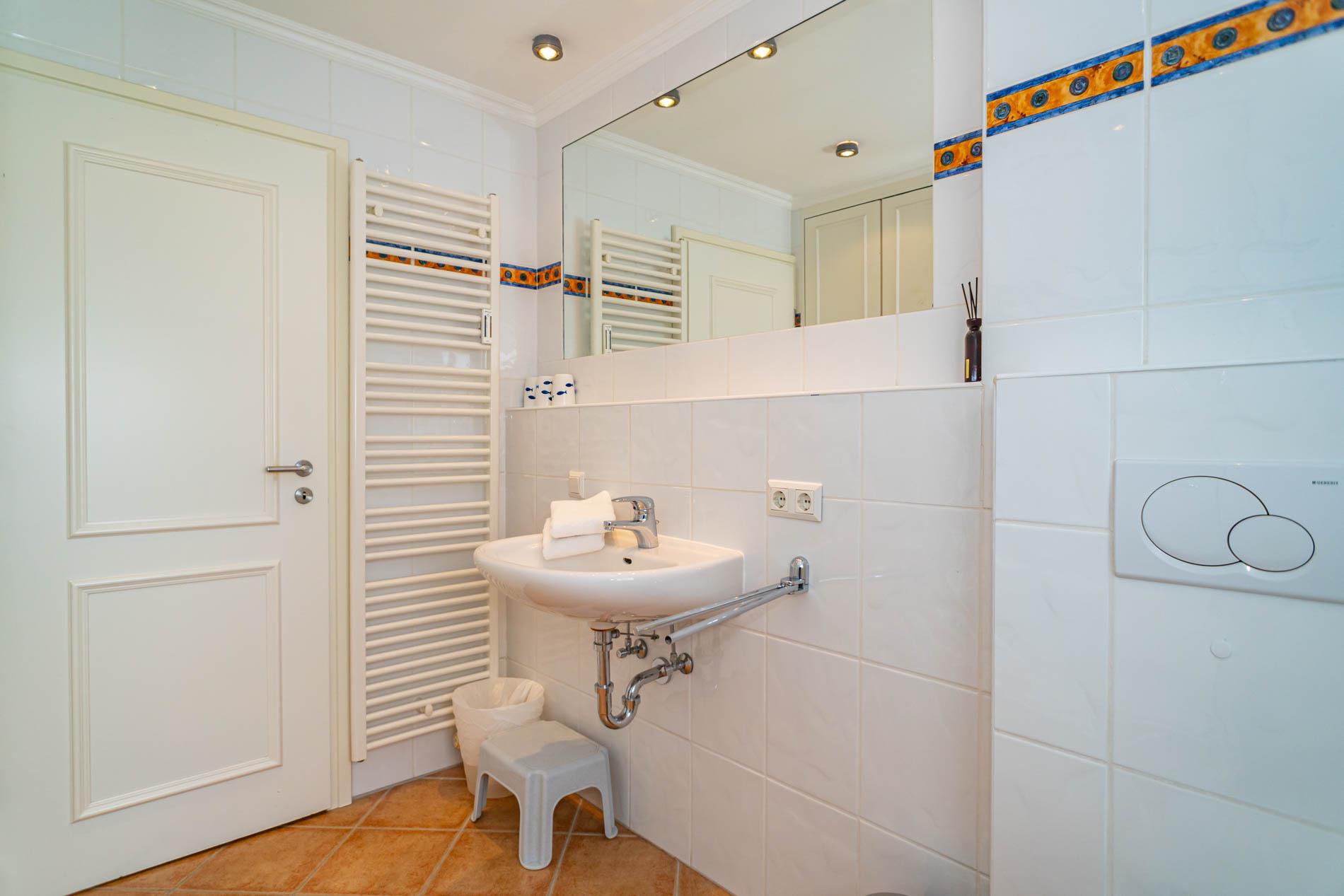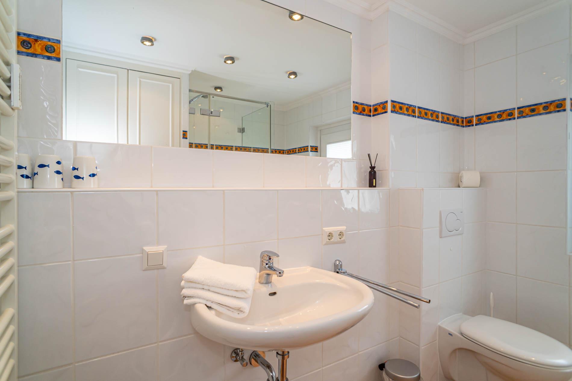 Im modernen Bad befinden sich eine Dusche, ein WC, ein Waschtisch und ein Fenster. Außerdem ein Fön.