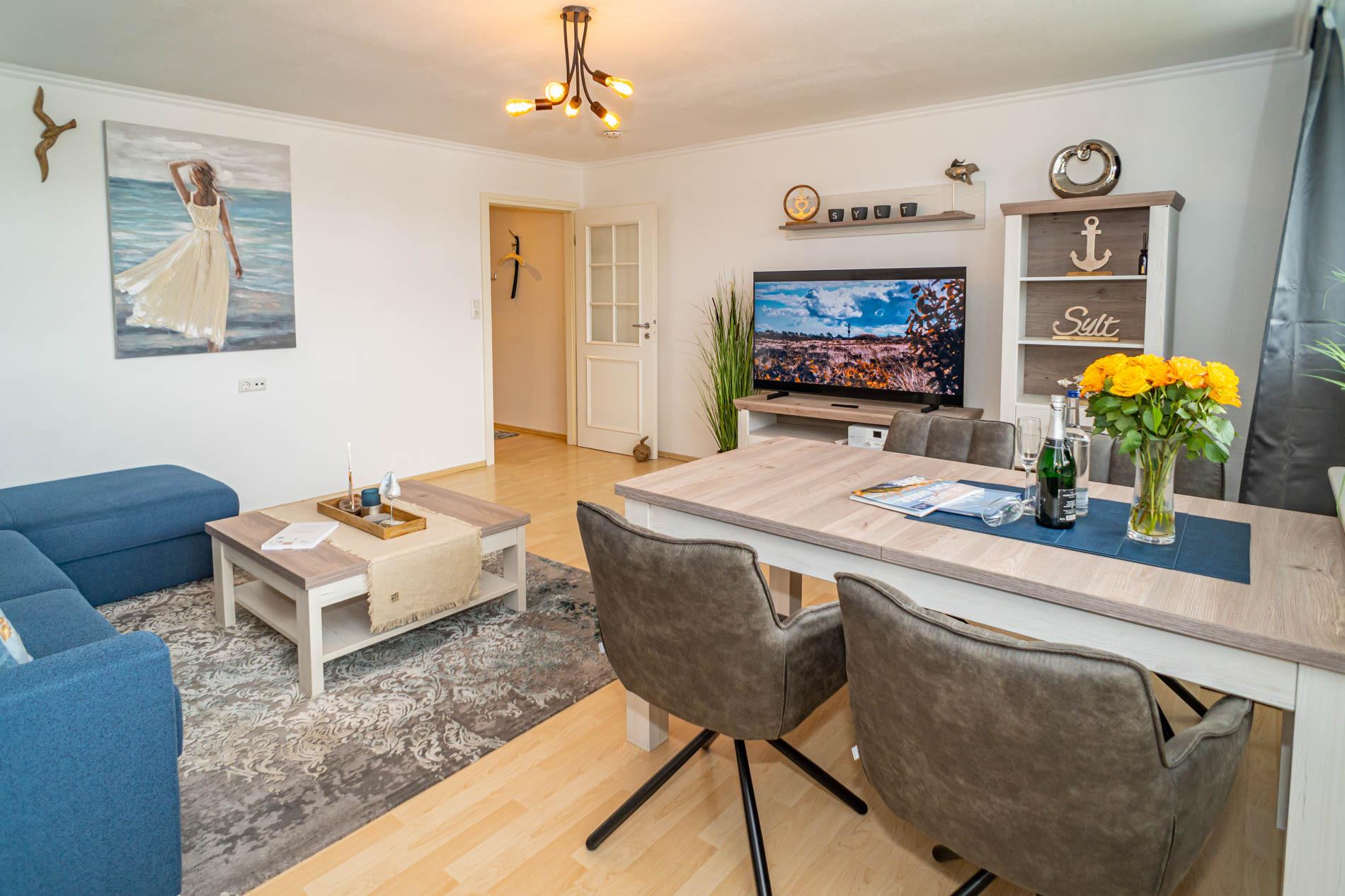 Der Wohnraum besteht aus einer gemütlichen Eckcouch mit Bettfunktion (Lattenrost) und einer Liegefläche von 1,70 x 2,00 Meter, einem Essplatz mit bequemen Stühlen für vier Personen, Kabel-Flachbild-TV in der Größe 65 Zoll, Radio mit CD-Spieler und Bluetooth. Außerdem finden Sie eine gute Ausstattung an Leselektüren und Gesellschaftsspielen vor.