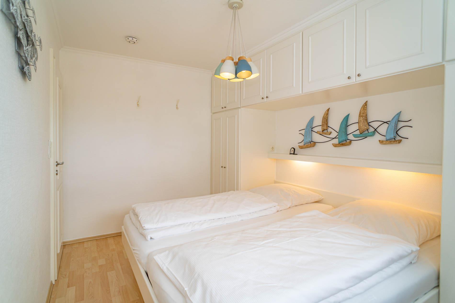 Das Schlafzimmer hat ein Doppelbett in der Größe 2,00 x 2,00 Meter mit zwei Einzelmatratzen.