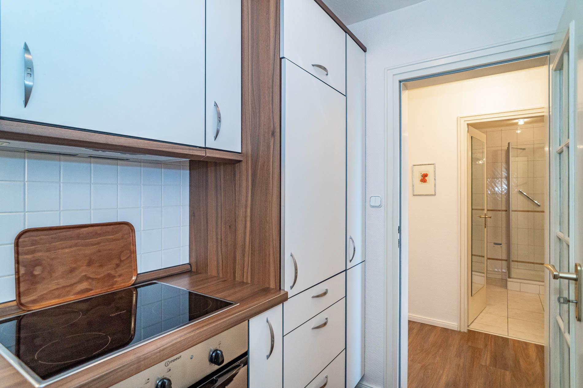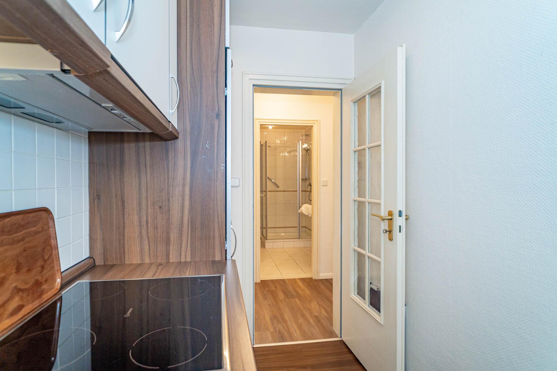 Vom Vorflur mit Garderobe gelangt man in das Wohnzimmer (mit Austritt zum Balkon), in die Küche und in das moderne Duschbad/WC.