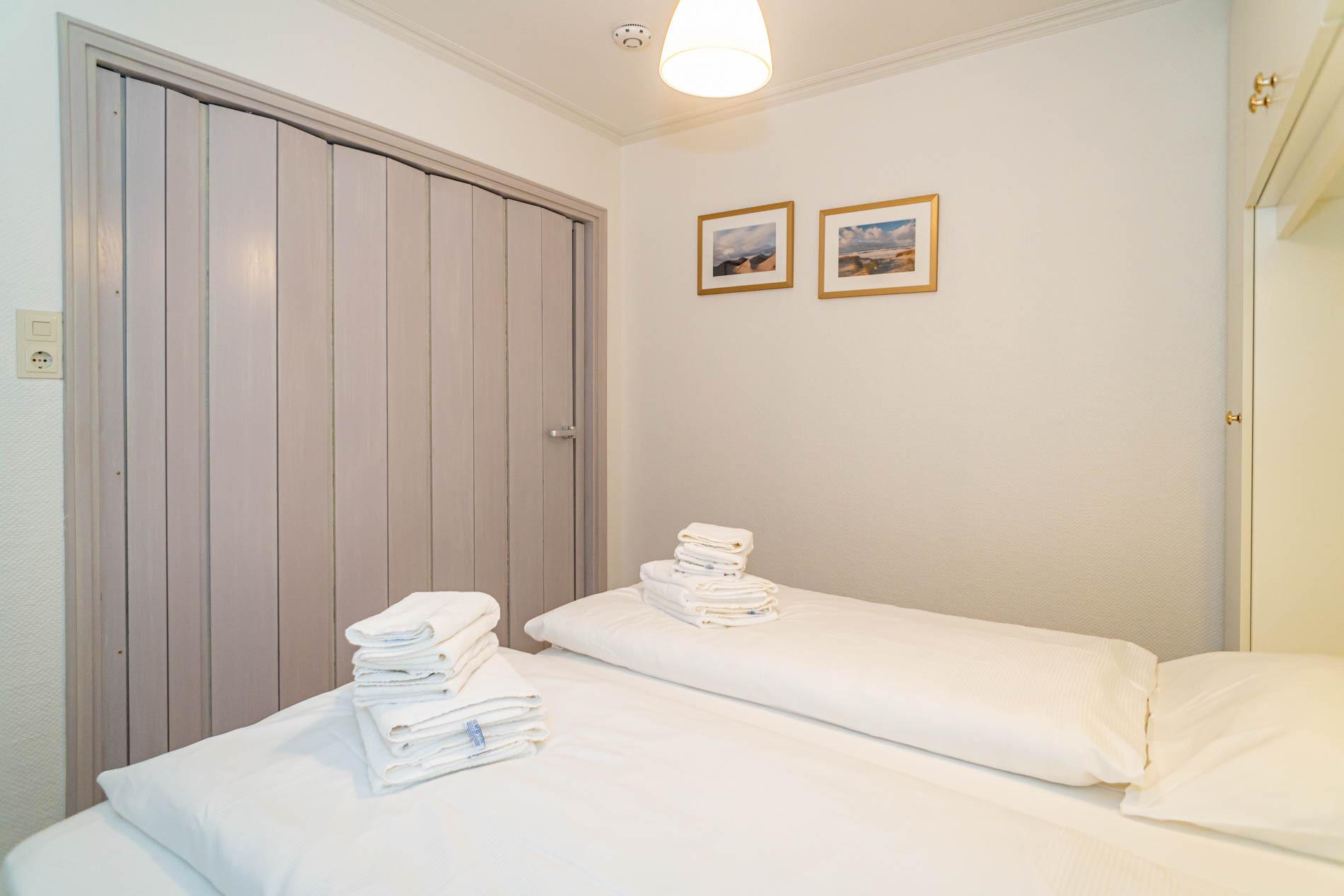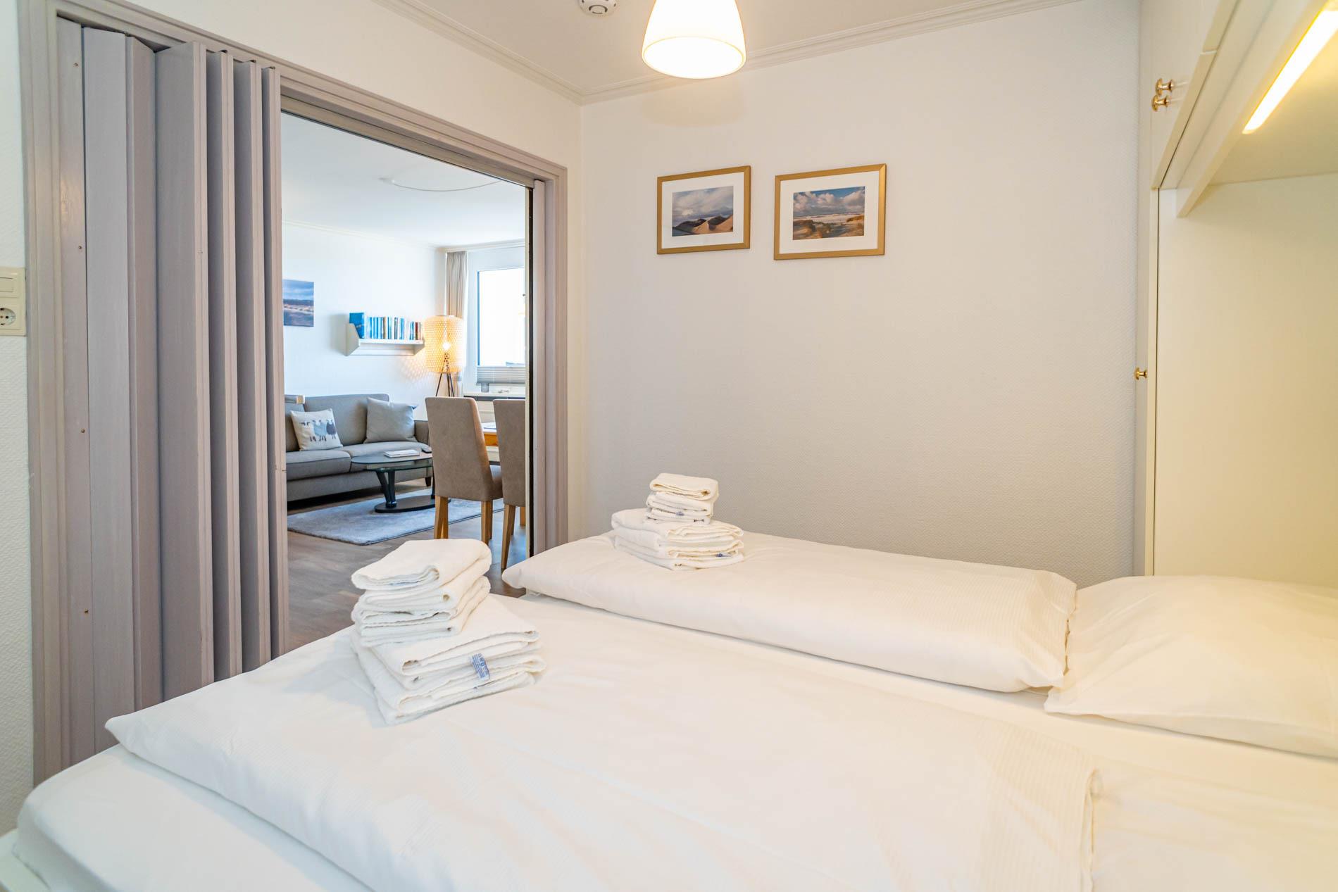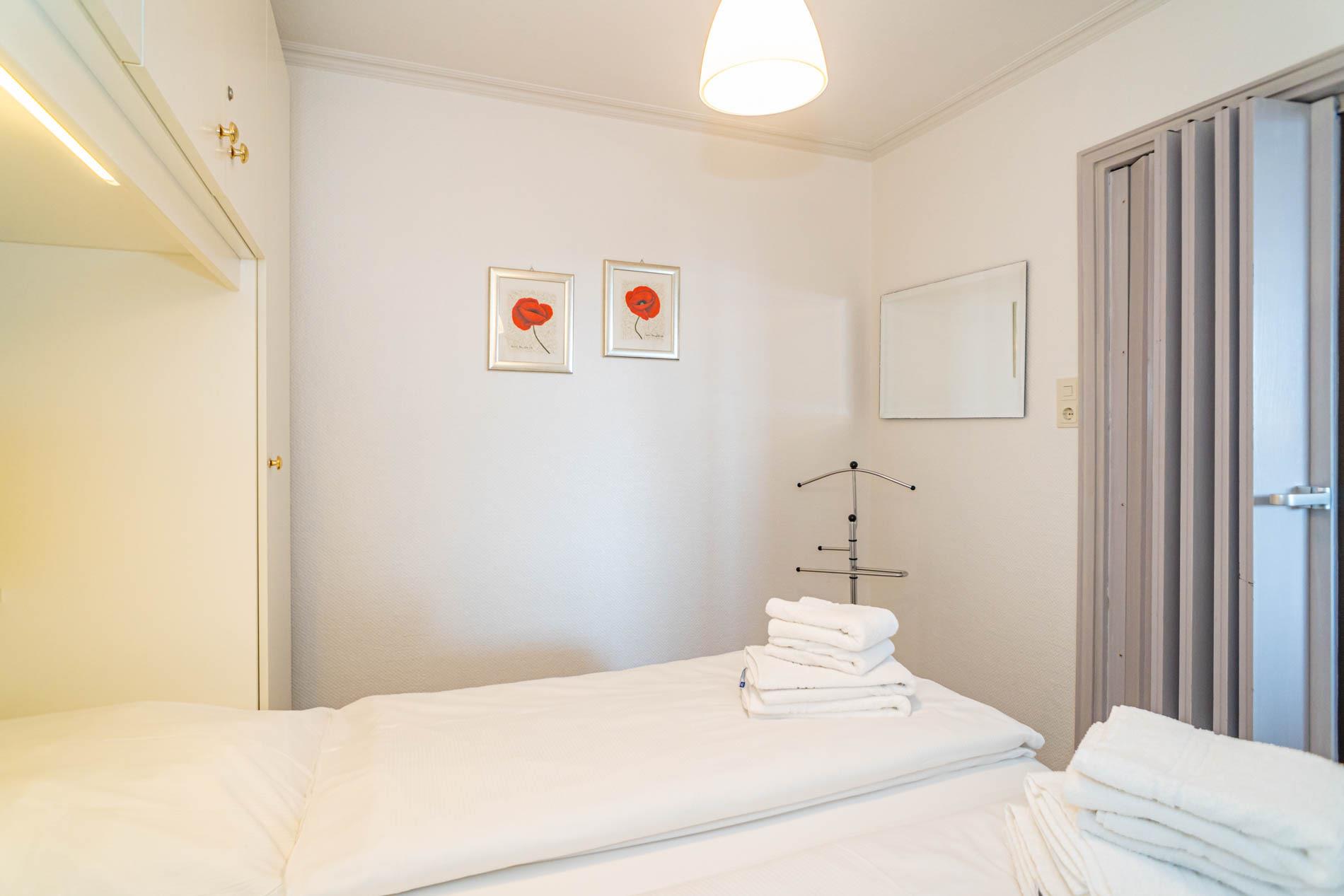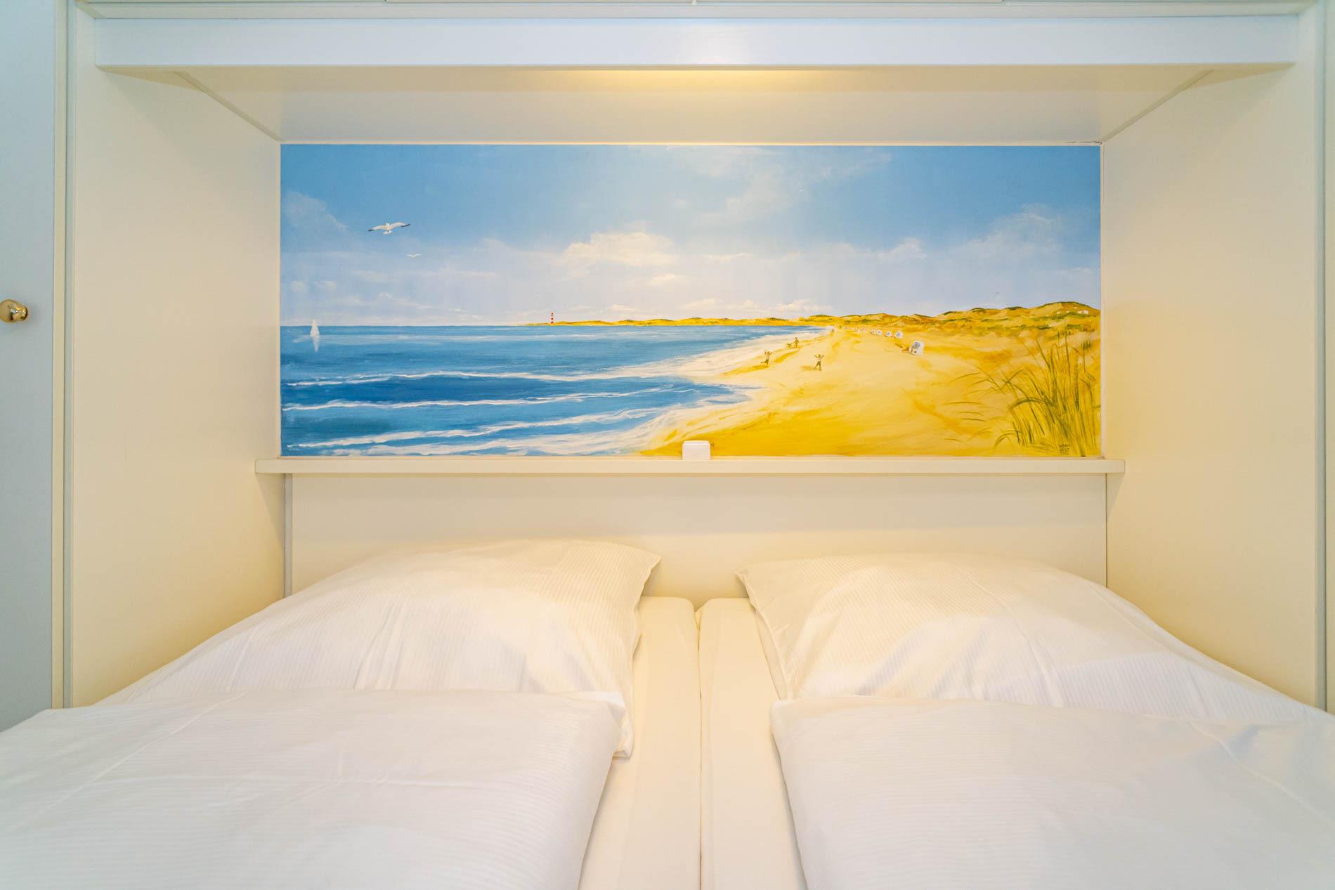 Die Schlafnische (durch eine Holz-Falttür vom Wohnzimmer abgetrennt) hat ein Doppelbett mit zwei Einzelmatratzen (0,90 x 2,00 m).