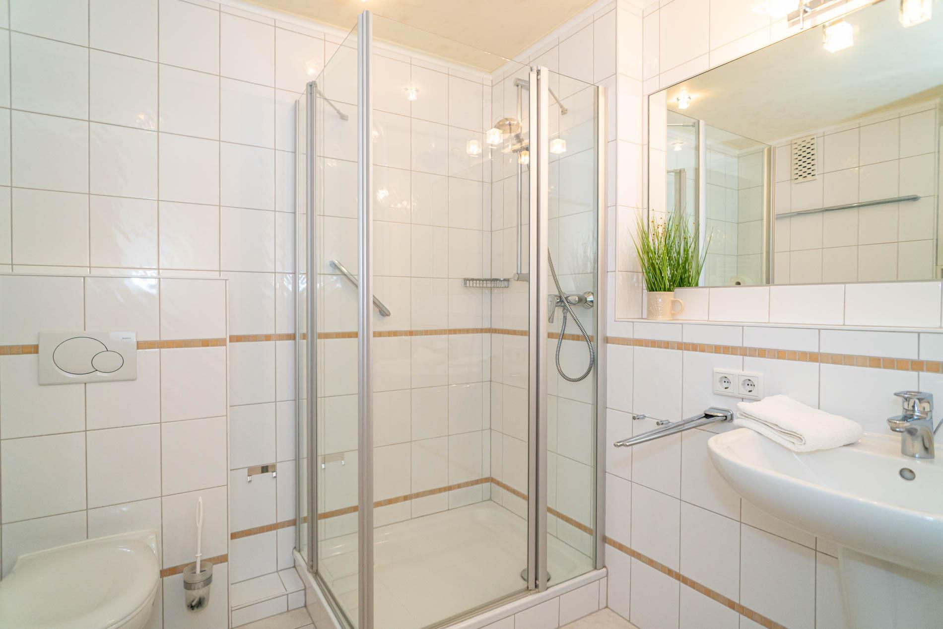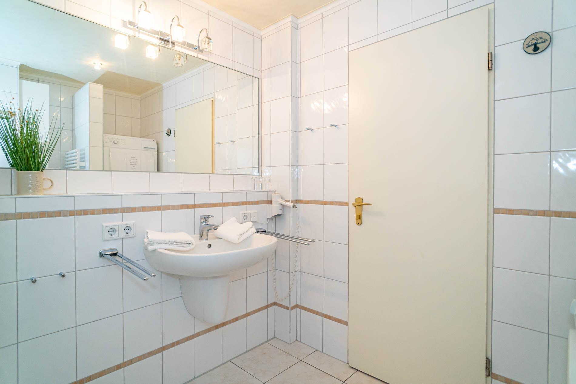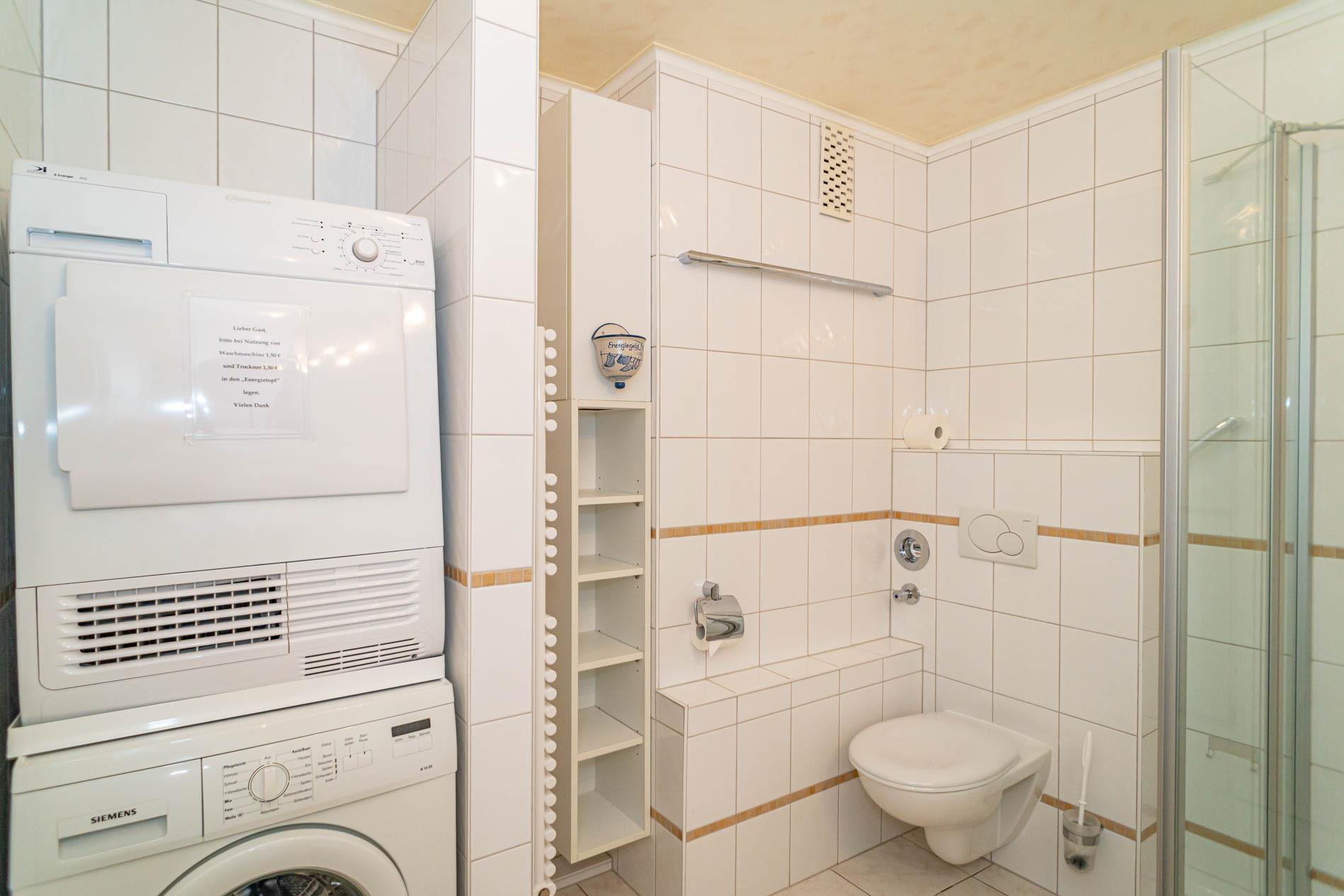 Im neuen Bad befinden sich eine Dusche, ein WC, ein Waschtisch und ein Fön. Waschmaschine und Trockner im Appartement vorhanden (gegen Entgelt)