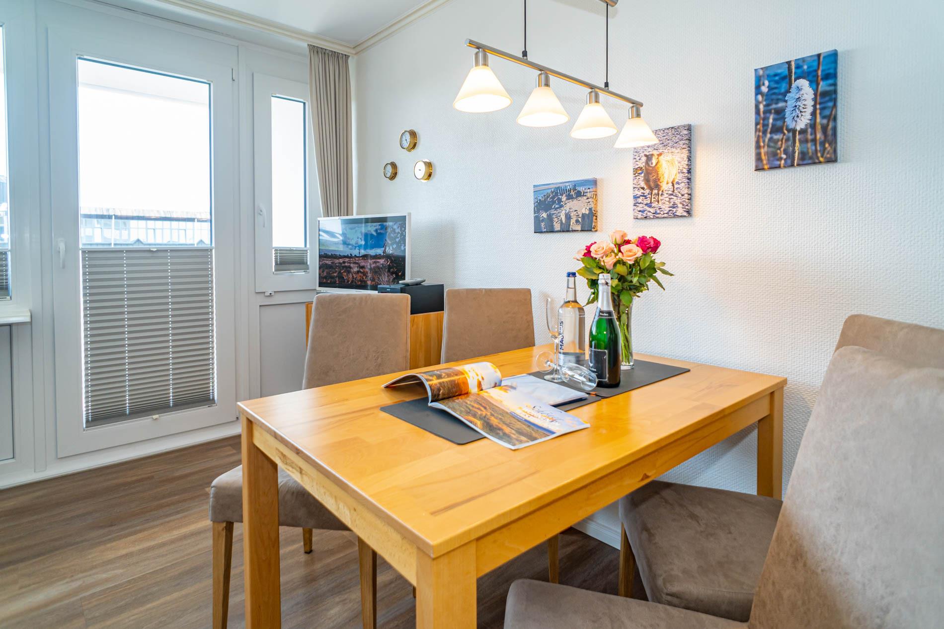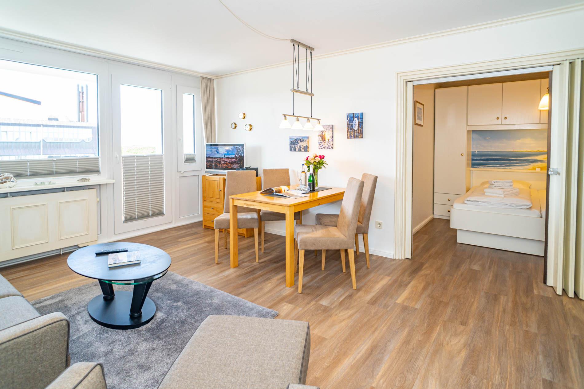 Der Wohnraum besteht aus einer gemütlichen Sitzgarnitur (Zweisitzer und 2 Sessel), einem Essplatz,[nbsp] Flachbild-TV, DVD.