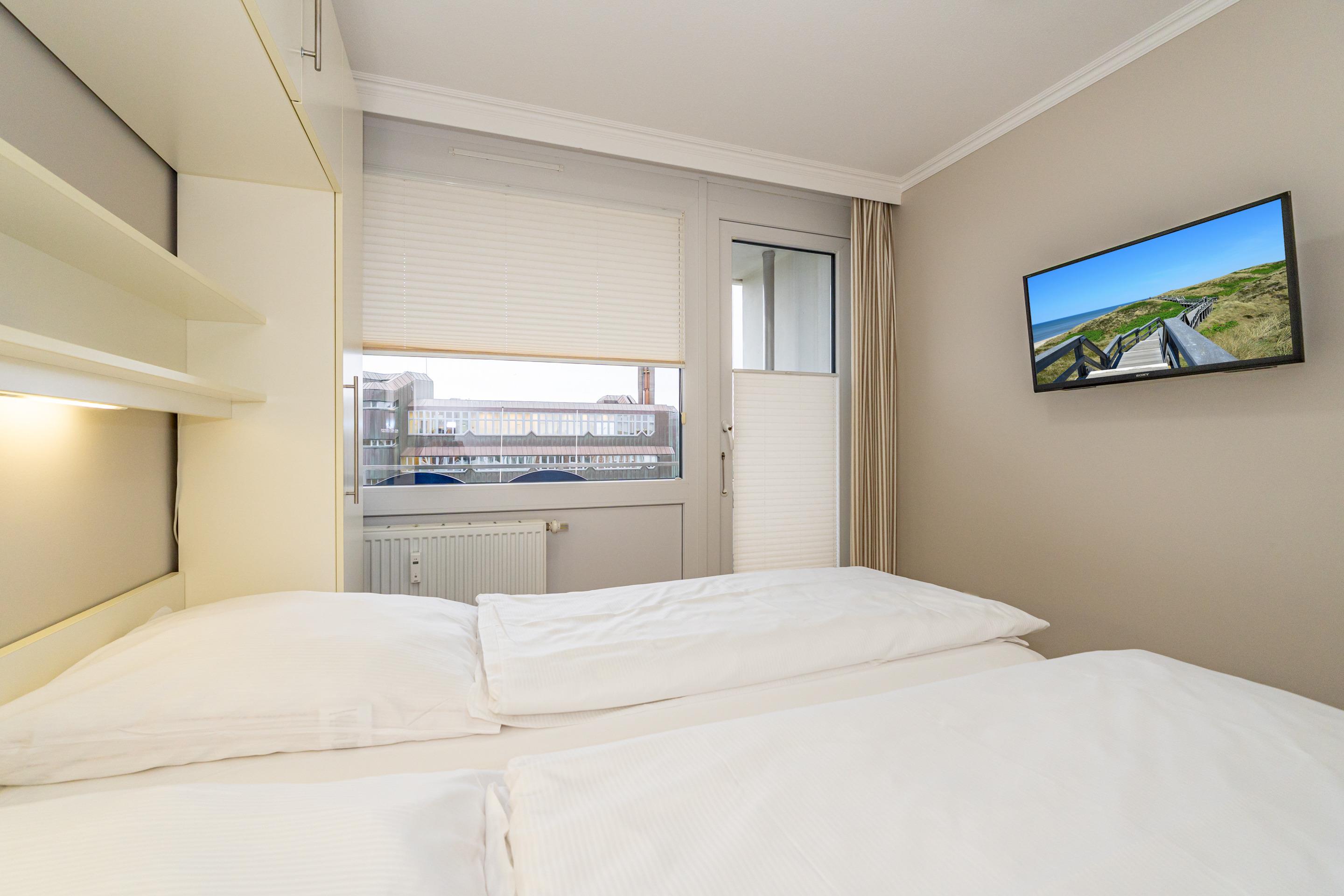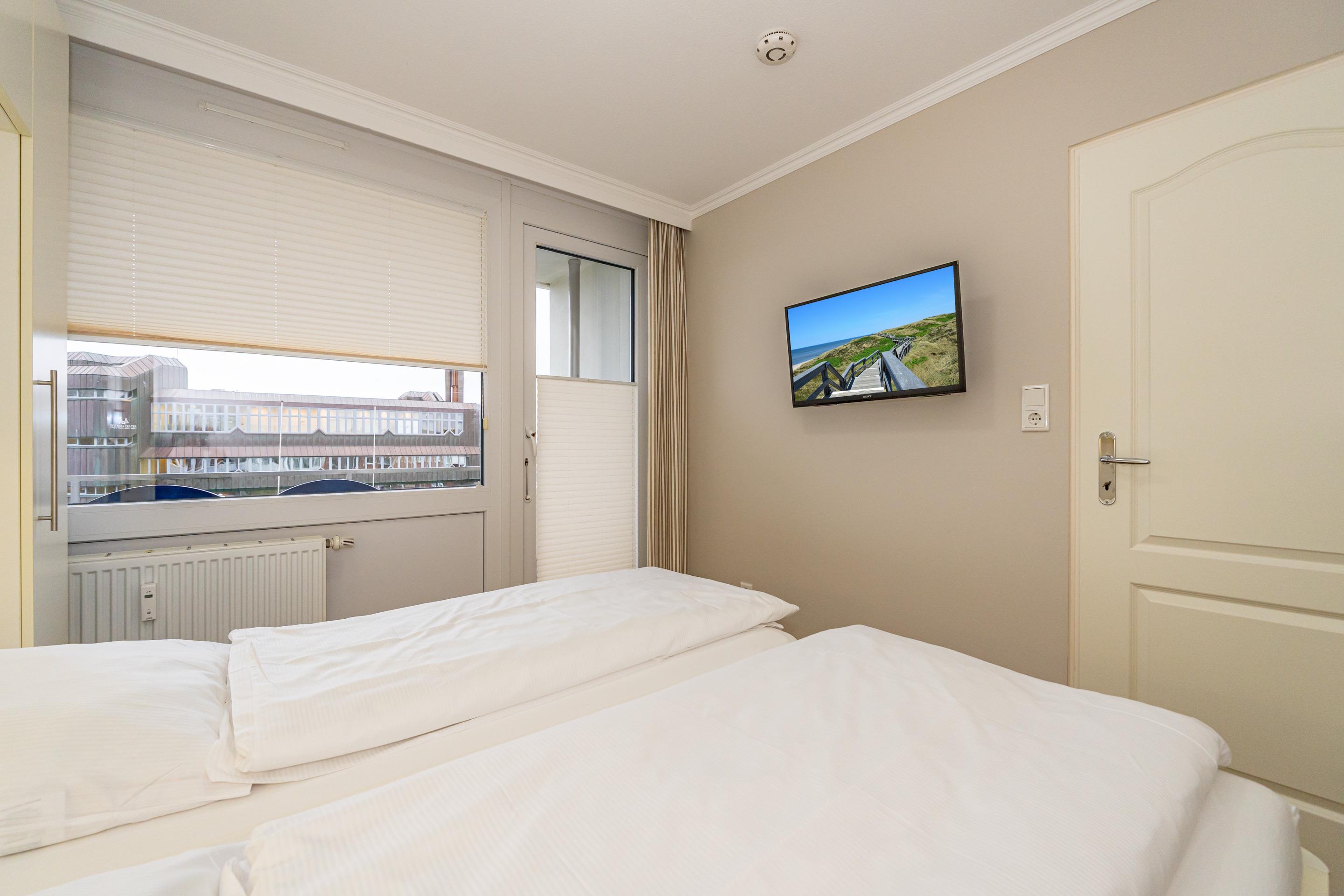 Das helle Schlafzimmer hat ein Doppelbett mit zwei Einzelmatratzen und ein Flachbild-TV.