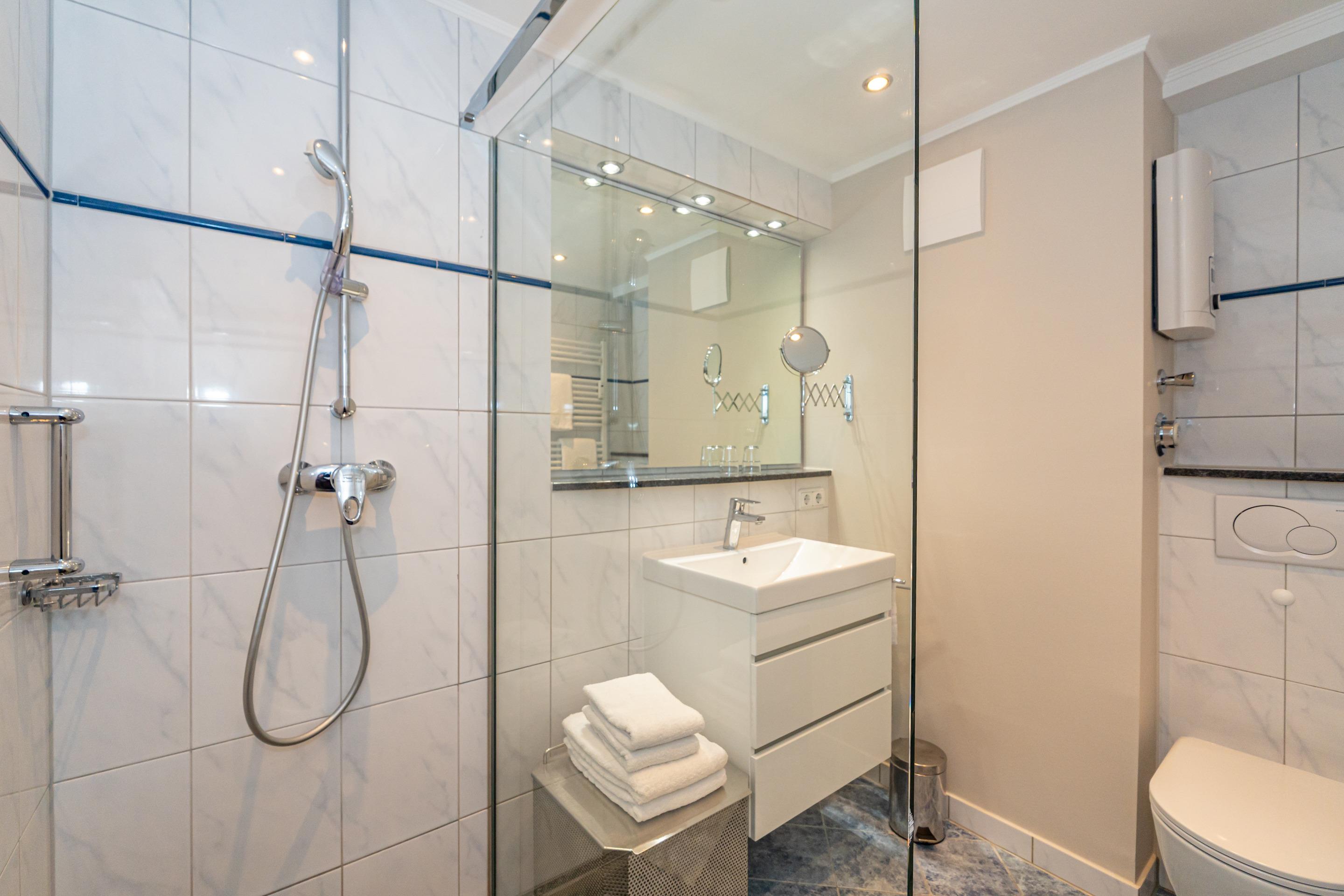 Im neuen Bad befinden sich eine Runddusche, ein WC, ein Waschtisch und ein Handtuchtrockner.
