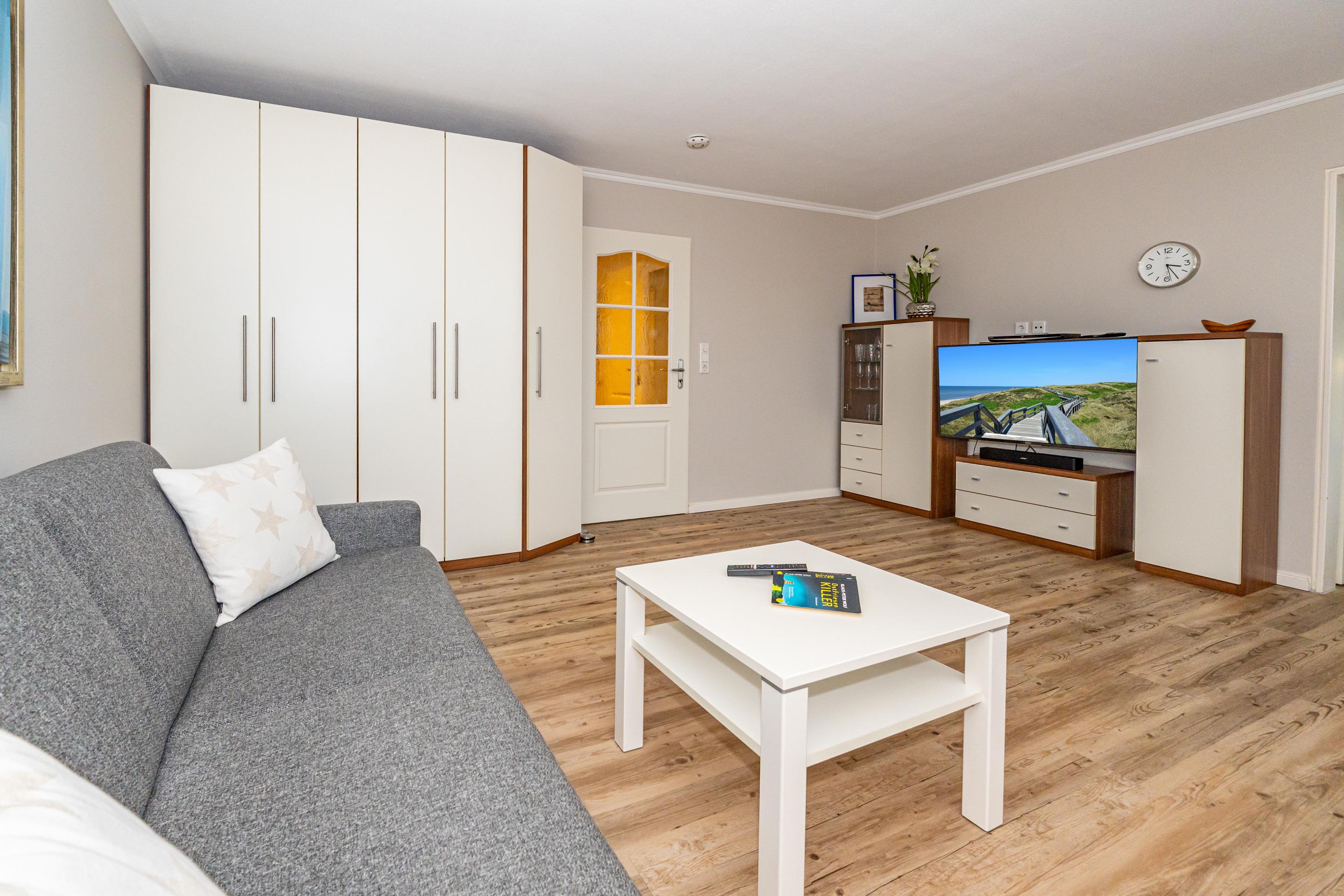 Der Wohnraum, komplett mit neuem Designerboden in Holzoptik ausgelegt, besteht aus einer bequemen Sitzgarnitur (Schlafcouch 1,40 x 1,90 m, ein Sessel), einem Essplatz, Kabel-Flachbild-TV, HiFi-Anlage, Blue Ray-Player.