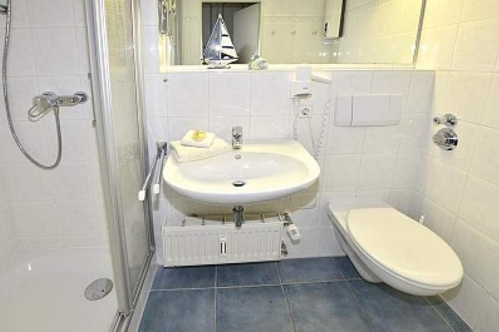 Das Bad hat eine Dusche, ein WC, einen Waschtisch und einen festinstallierten Fön.