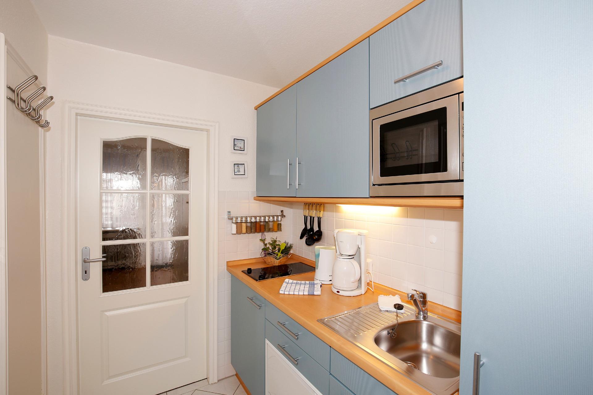 Die ansprechende[nbsp][nbsp]Küchenzeile hat einen kleinen Geschirrspüler, ein Cerankochfeld, eine Bratmikrowelle und einen Kühlschrank mit 3*-Gefrierfach. Kaffeemaschine, Wasserkocher und Toaster gehören zur Grundausstattung.