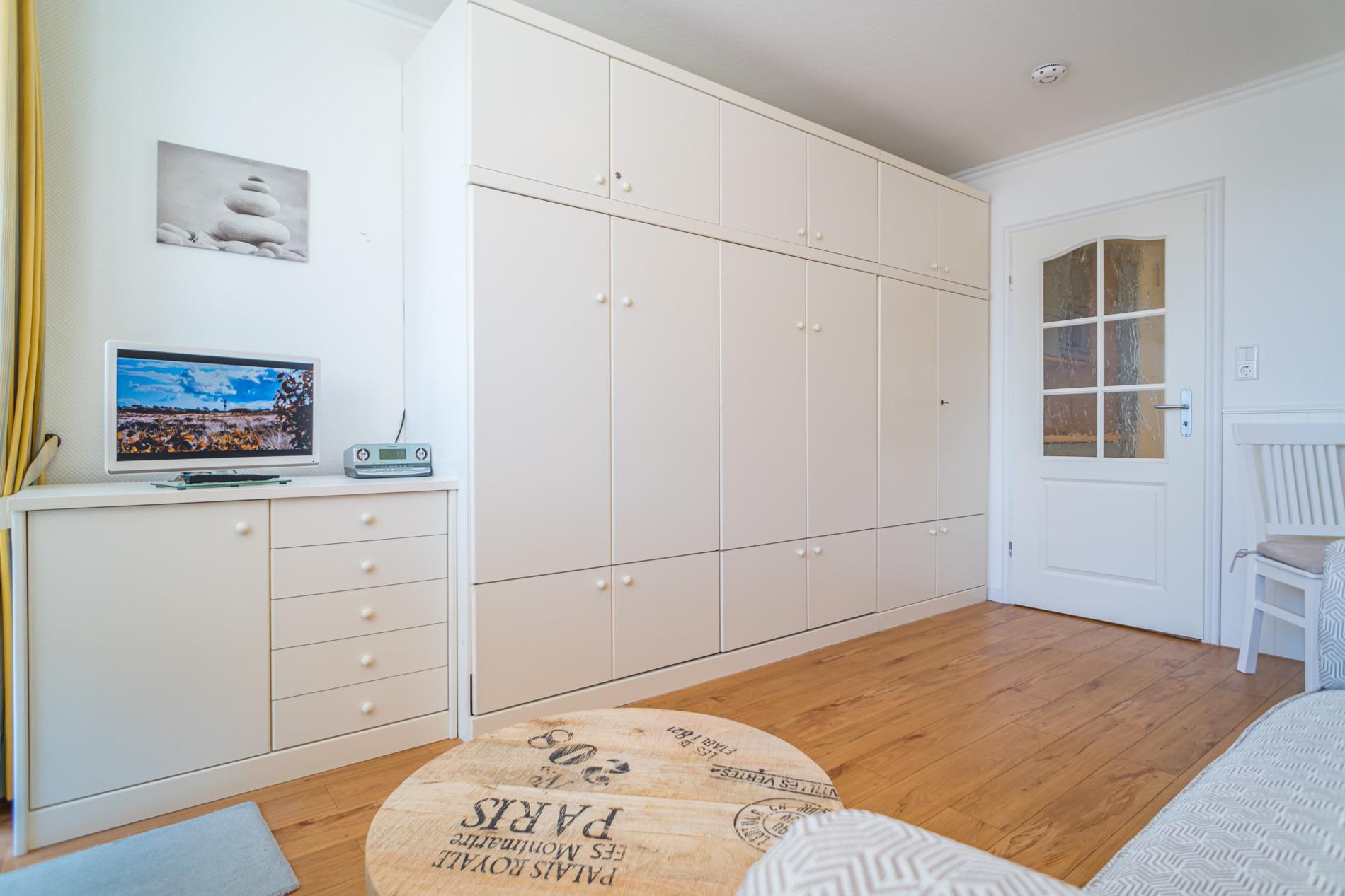 Der Wohn-/Schlafraum besteht aus einer Zweisitzer Couch, einem Essplatz, Doppelschrankbett (einzeln ausklappbar), einem Kabel-Flachbild-TV, Radio-CD.