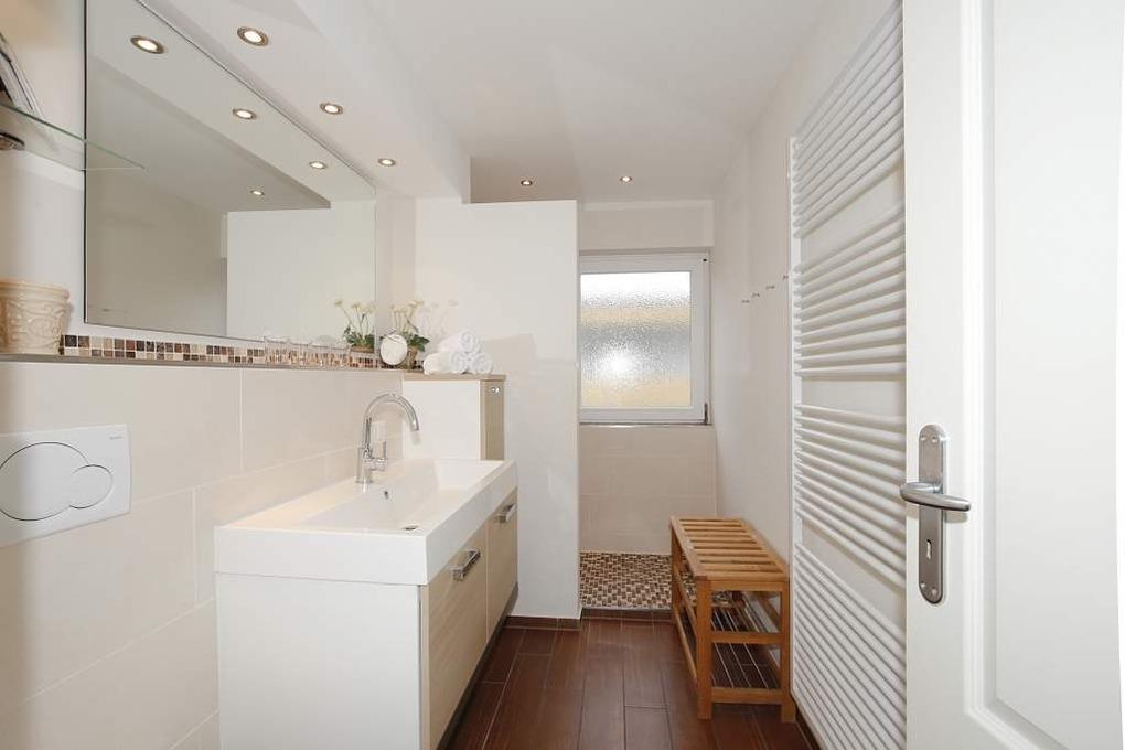 Im neuen großzügigen Bad befinden sich eine große, sehr flache Dusche, ein WC, ein Waschtisch, ein Handtuchtrockner und ein Fön.