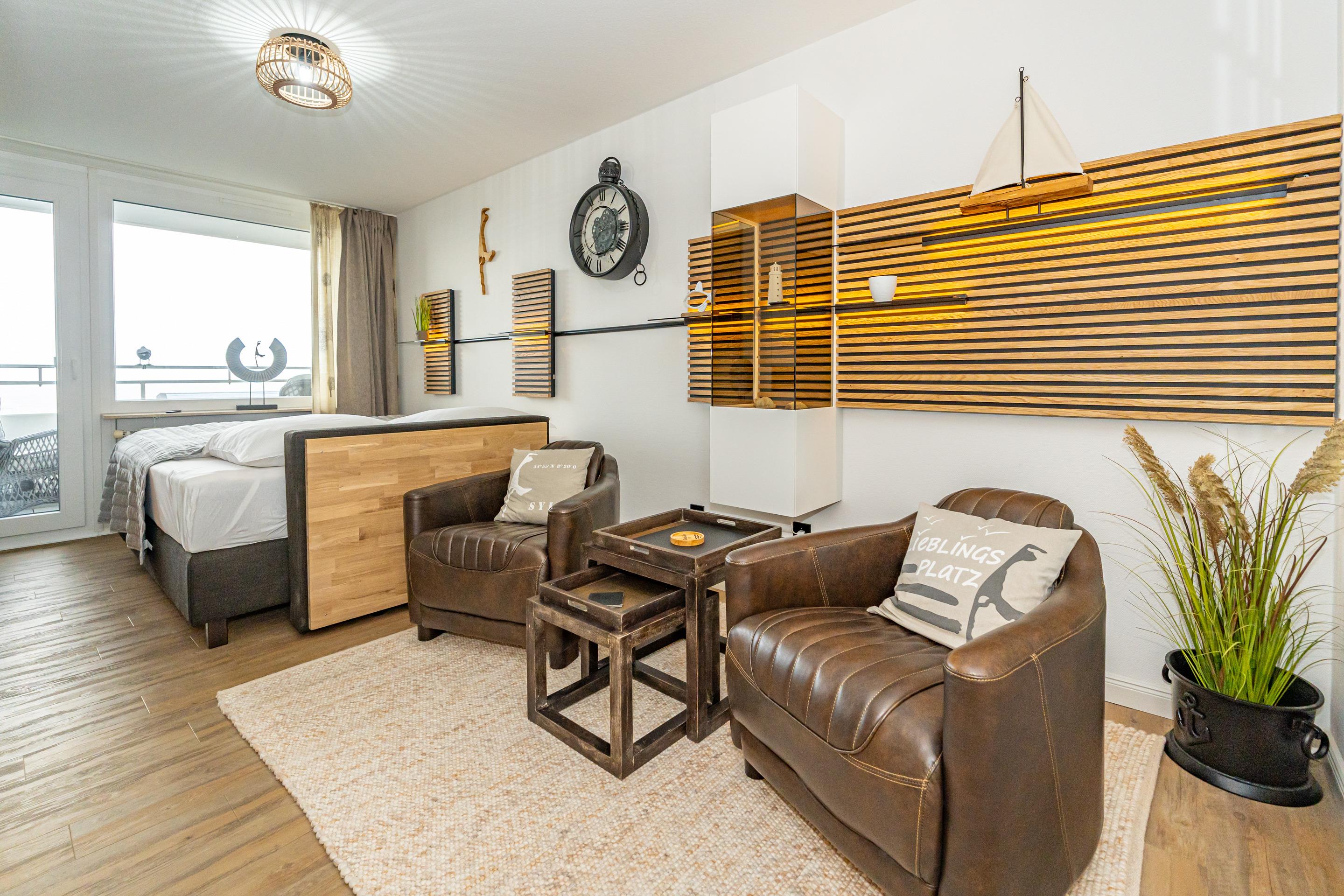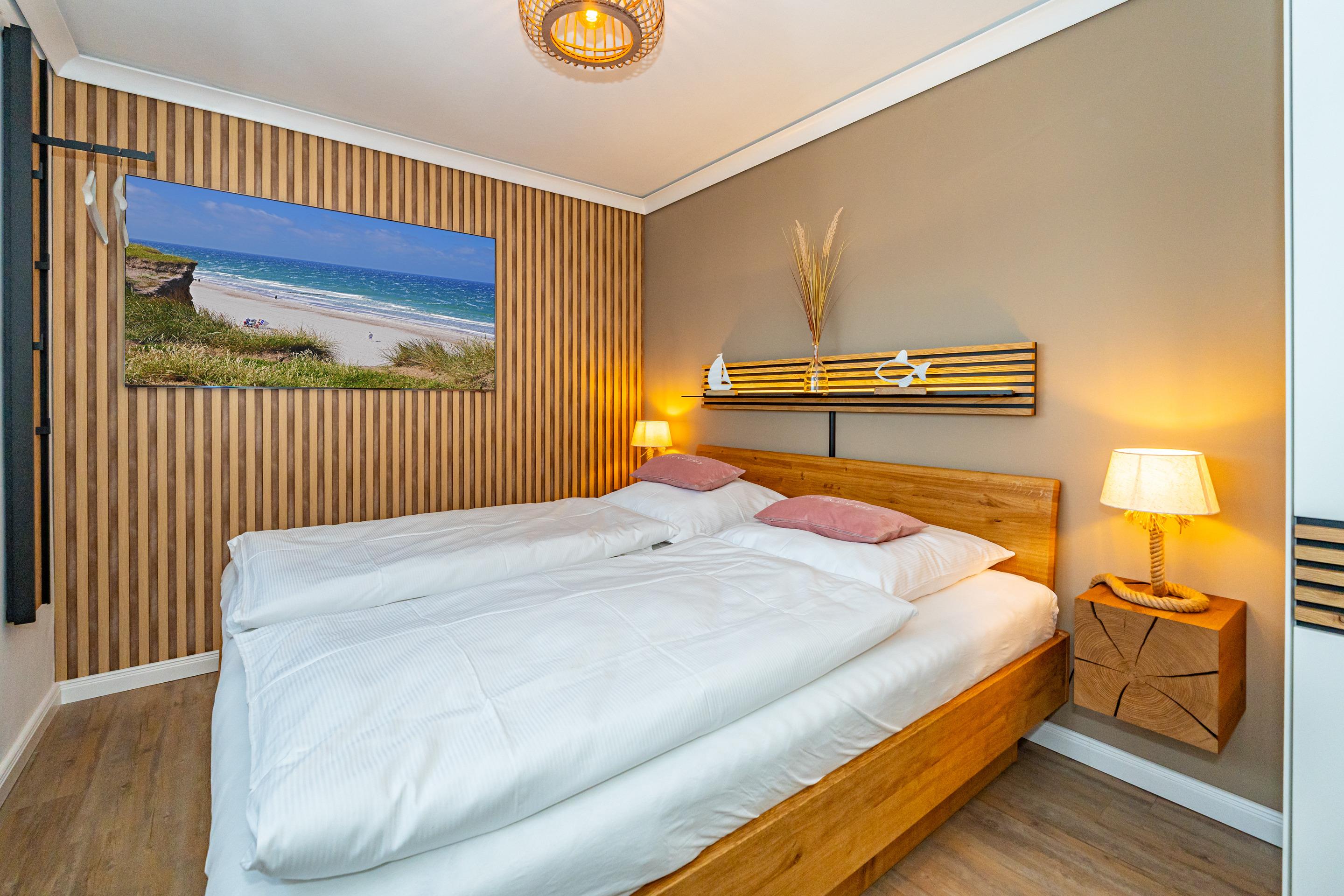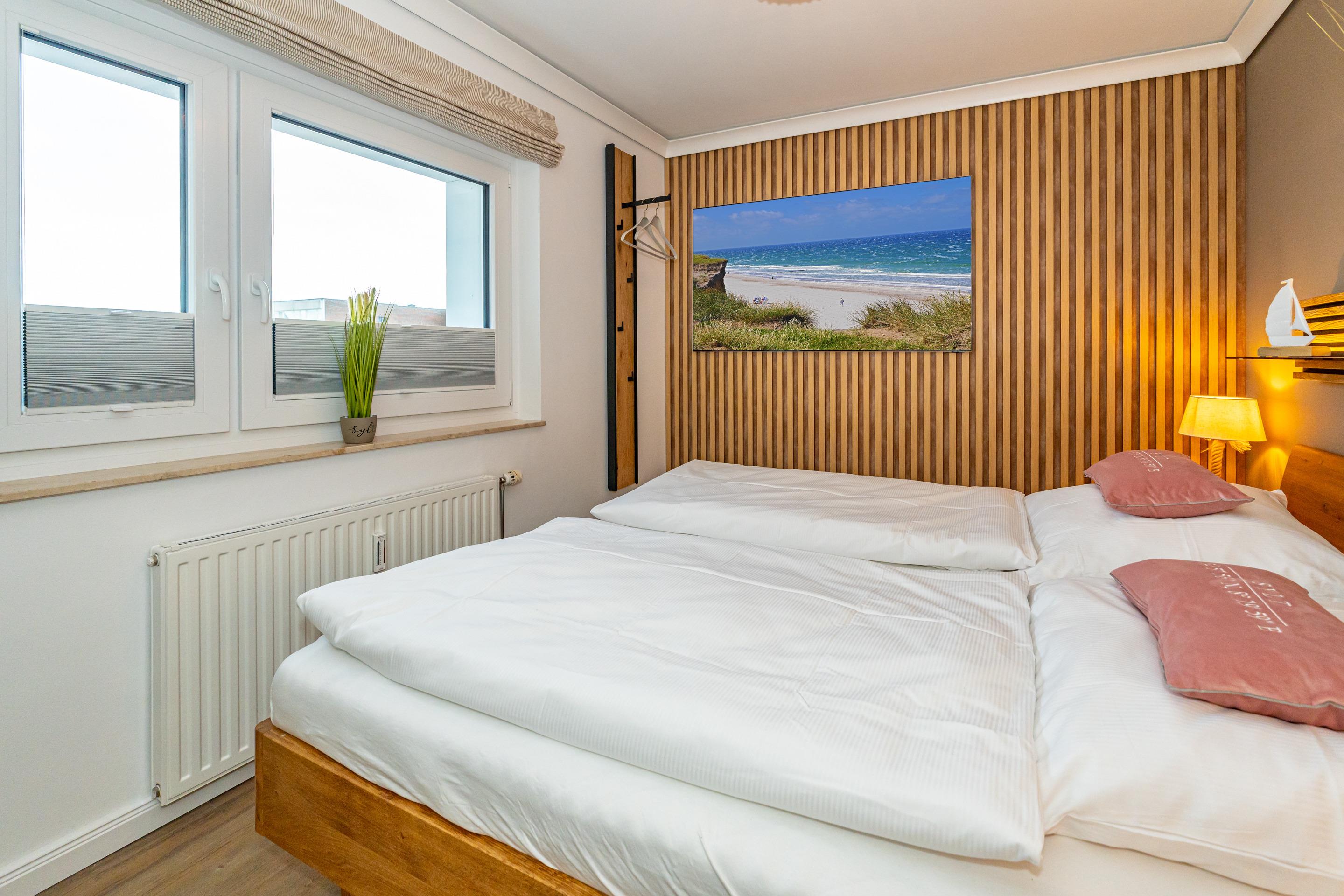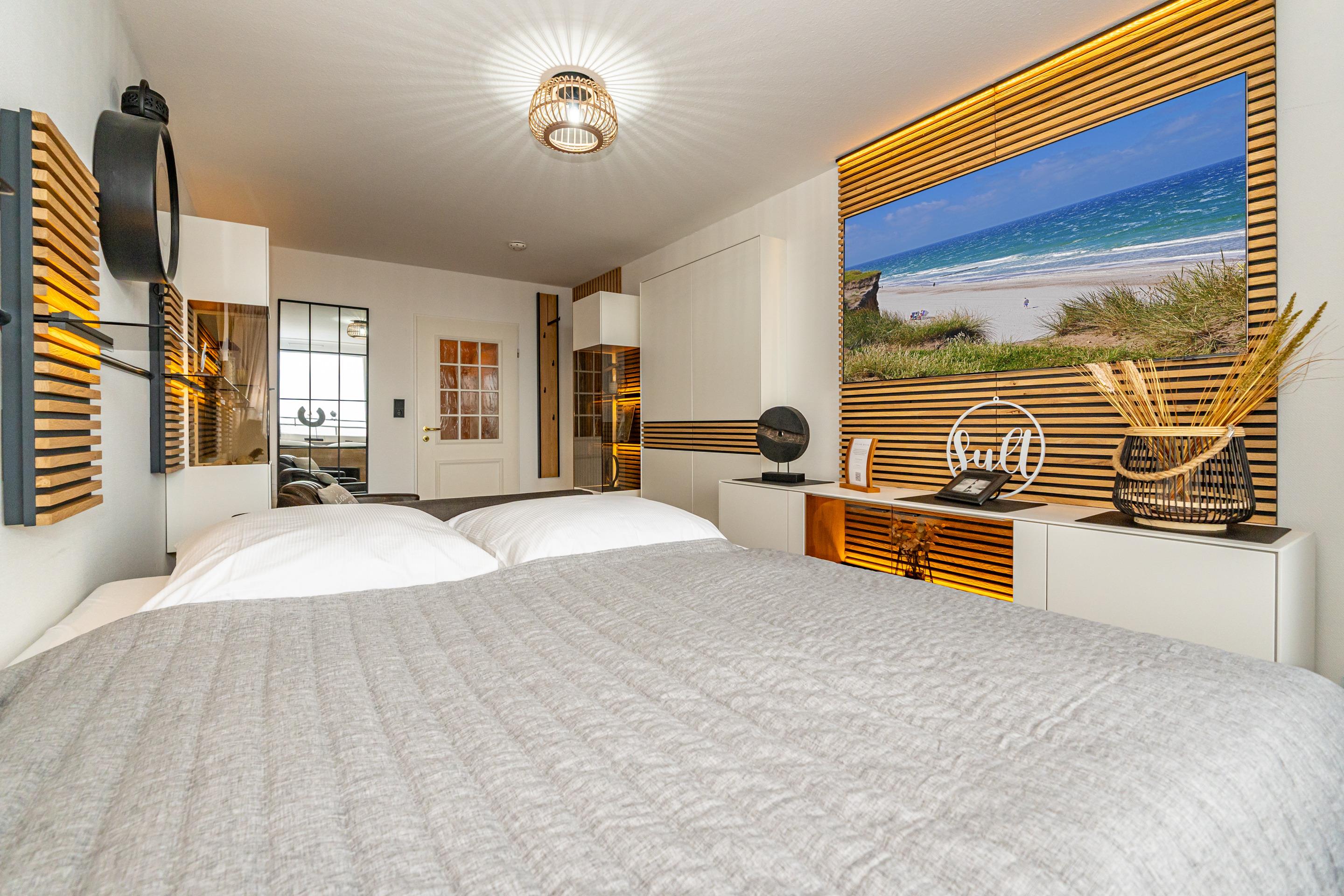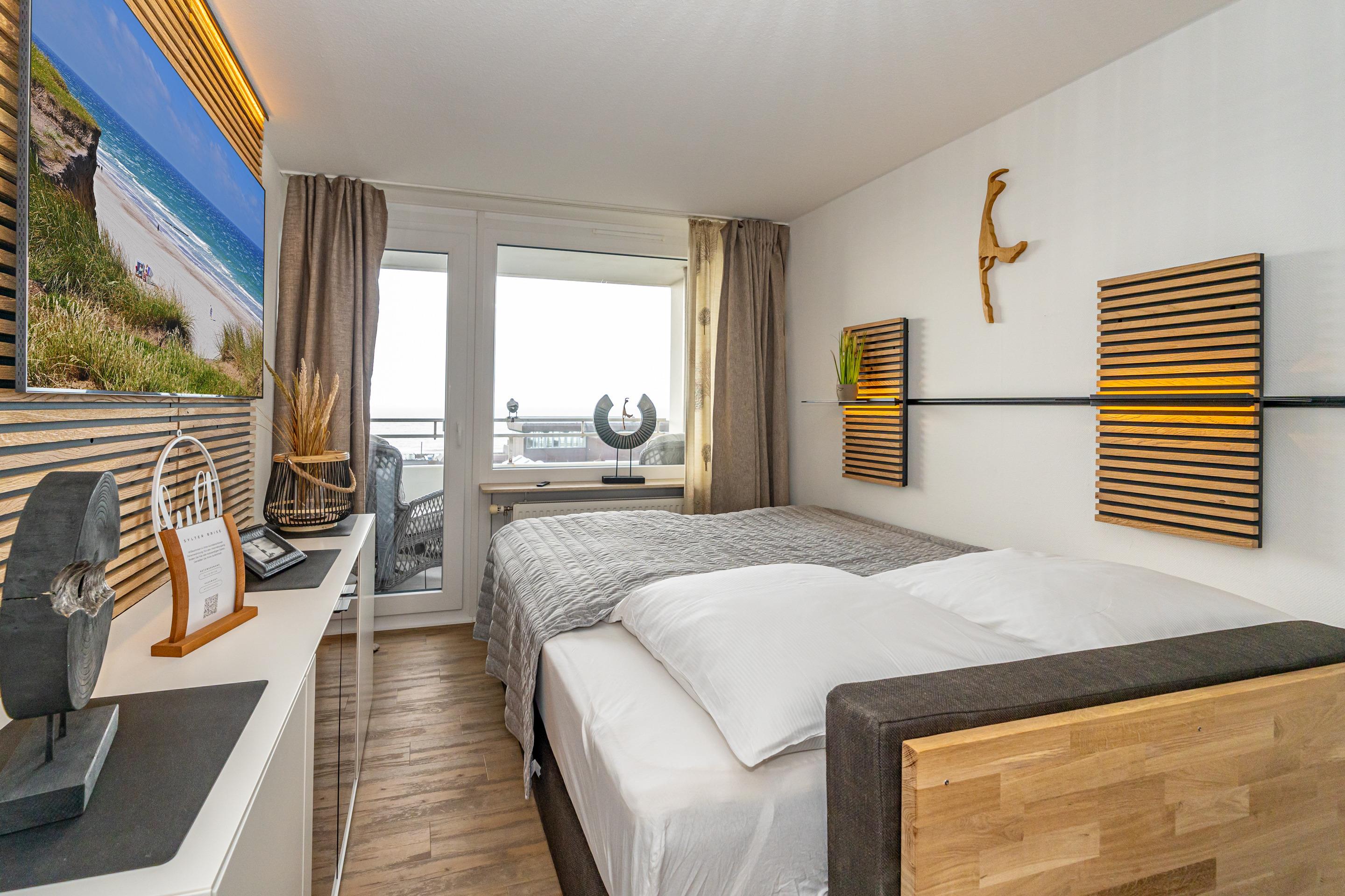Das lichtdurchflutete Ferienapartment „SYLTERBRISE“, mit zwei zum Meer ausgerichteten Balkonen, befindet sich direkt an der Nordsee und ist Richtung Osten und Westen ausgerichtet. Der phänomenale Meerblick lässt sogar die Erdkrümmung erkennen. Diese traumhafte Konstellation gewährleistet unzählige Sonnenstunden aus der 5. Etage mit einem bezaubernden Blick auf die Nordsee, inkl. phänomenaler Sonnenuntergänge, die zum festen Bestandteil am Abend werden. Sie wohnen in einem großzügigen geschnittenen 3-Zimmer-Apartment (ca. 80 qm) für bis zu 4 Personen, dass modern ausgestattet ist. Zwei Schlafzimmer mit einem hochwertigen Doppelbett (Einzelmatratzen, Liegefläche 1,80 x 2,00 m) und einem Boxspringbett (Einzelmatratzen, Liegefläche 1,80 x 2,00 m) und jeweils 65 Zoll Smart TV, ein Wohnraum mit 65 Zoll Smart TV, Essplatz, voll ausgestattetem Küchenbereich (Kochen mit Meerblick), ein Badezimmer mit Regendusche und WC, ein weiteres Badezimmer mit Wanne und WC. Ein Schlafzimmer bietet einen Businessarbeitsplatz mit LAN und WLAN für Homeoffice, ein weiterer Businessarbeitsplatz befindet sich im großzügigen Flur. Sie können hier sogar während Ihrer Arbeitszeit Urlaub machen. Der direkt an das Wohnzimmer angrenzende Essbereich bietet eine offene Einbauküche im gehobenen Standard und Zugang auf den angrenzenden Balkon. In der „SYLTERBRISE“ wird ein unvergesslicher und erholsamer Urlaub garantiert. Vom Wohnzimmer aus gelangt man über den Flur in die einladenden Schlafzimmer, eines davon mit einem herrlichen Meerblick. Besonders an Sommertagen ist das Lichtspiel des Himmels zum Abend hin wunderschön und der Sonnenuntergang lässt sich auf den gemütlichen Balkonmöbeln genießen. Durch die großen Fensterflächen gelangt sehr viel Licht in jedes einzelne Zimmer, sodass diese zu jeder Tageszeit hell und einladend wirken und dem Bewohner sofort ein Gefühl von Urlaub vermitteln. Die „SYLTERBRISE“ liegt sehr zentral zum Strand und Zentrum. Ein gemeinschaftlicher Waschraum mit Waschmaschine und Trockner (über einen Münzautomaten) steht unseren Gästen ebenfalls zur Verfügung. Bei Anreise mit dem Auto gibt es die Möglichkeit, einen Parkplatz vor dem Haus zu nutzen (Parkplatz der Gemeinde, Münzeinwurf).