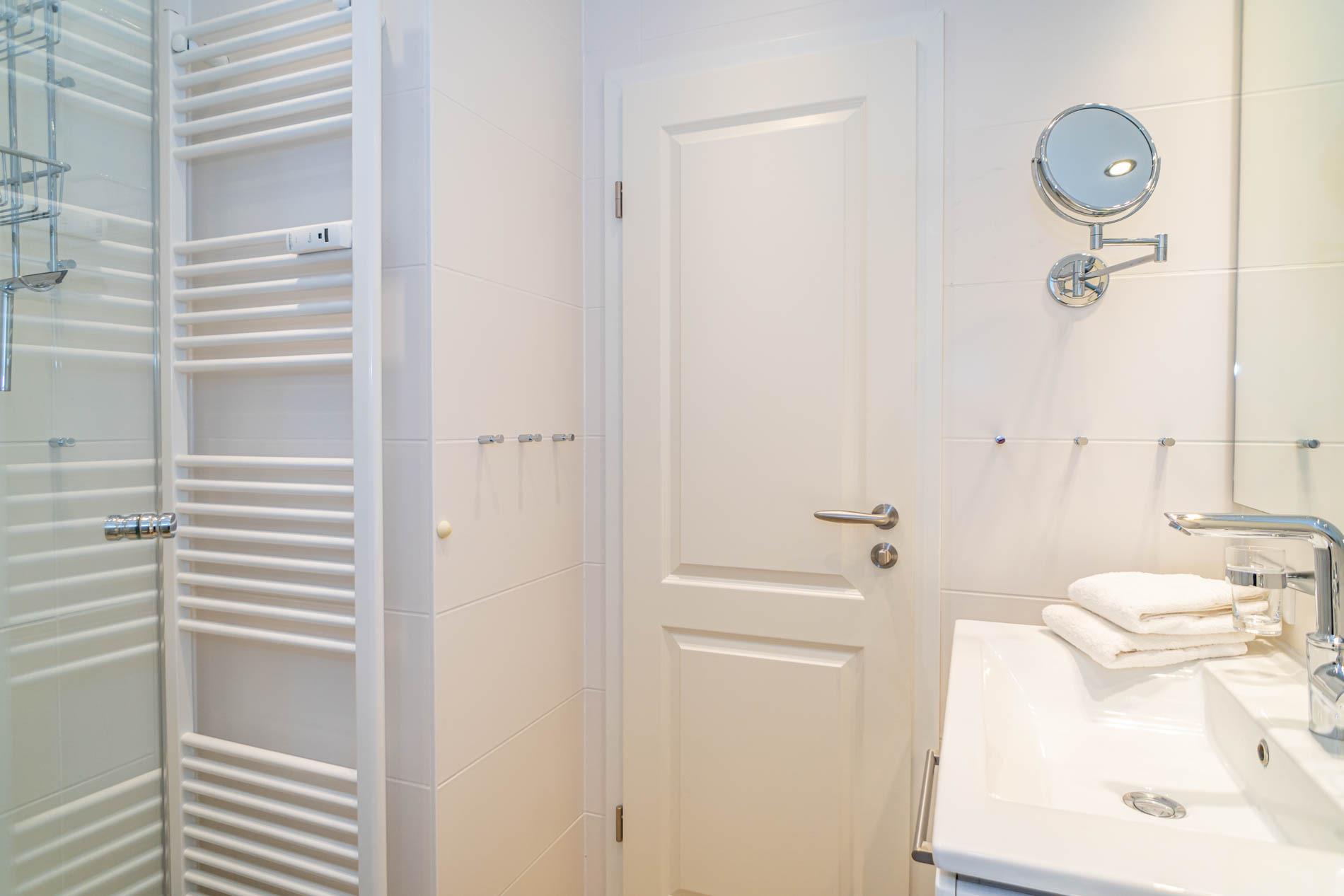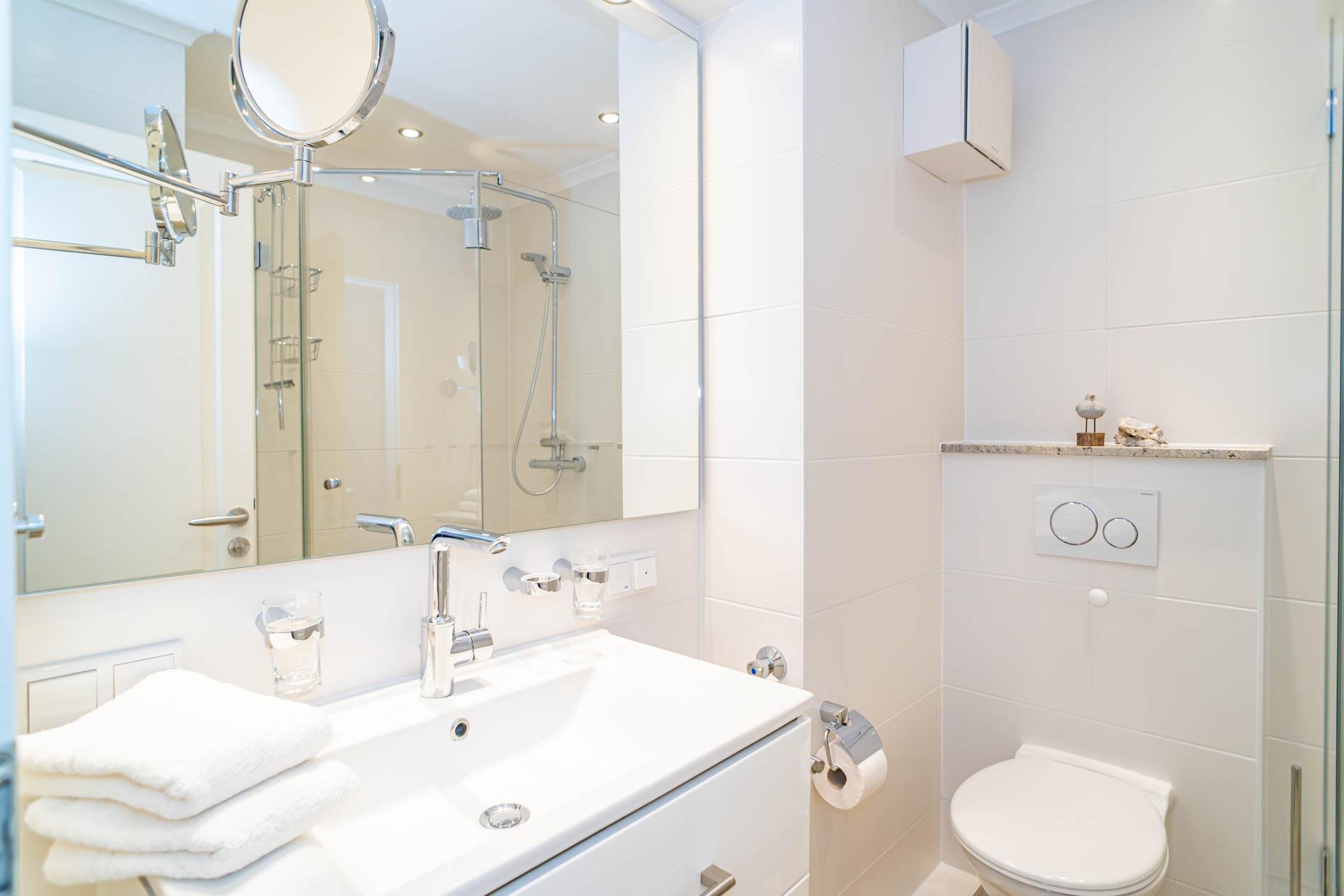 Das neue Badezimmer ist mit Dusche mit extraflachem Einstieg, WC, Waschtisch, Kosmetikspiegel und Handtuchtrockner ausgestattet.