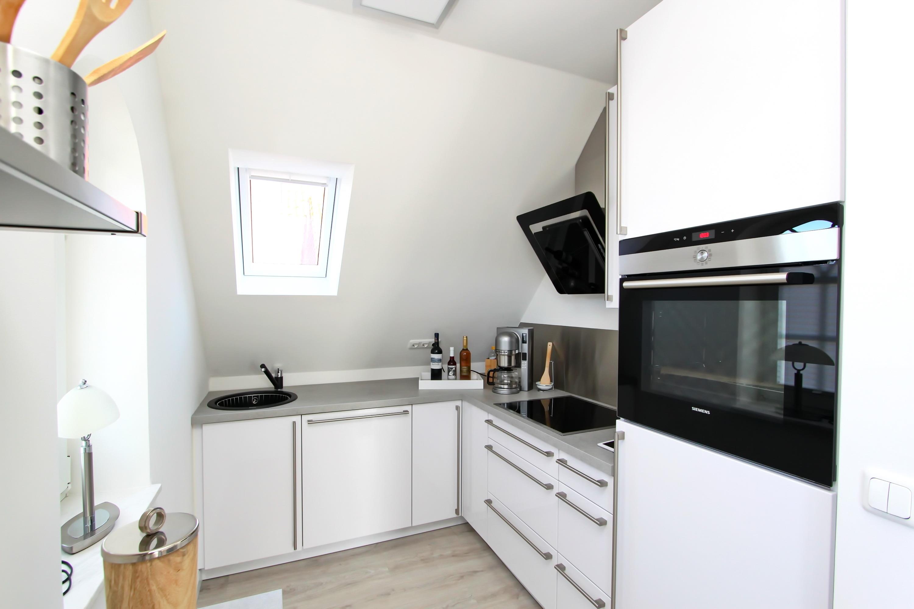 Im Wohnraum befindet sich ein großes Sofa, Couchtisch, Sideboard, Flatscreen-TV, eine Blue Tooth Music Box, Esstisch für 4 Personen, Zugang zum möblierten Süd- und Westbalkon sowie die offene Einbauküche, in der Sie sich selbst verpflegen können. Sie ist mit einem Cerankochfeld, Backofen, Geschirrspüler, Kühlschrank mit Gefrierfach, etc. vollausgestattet.