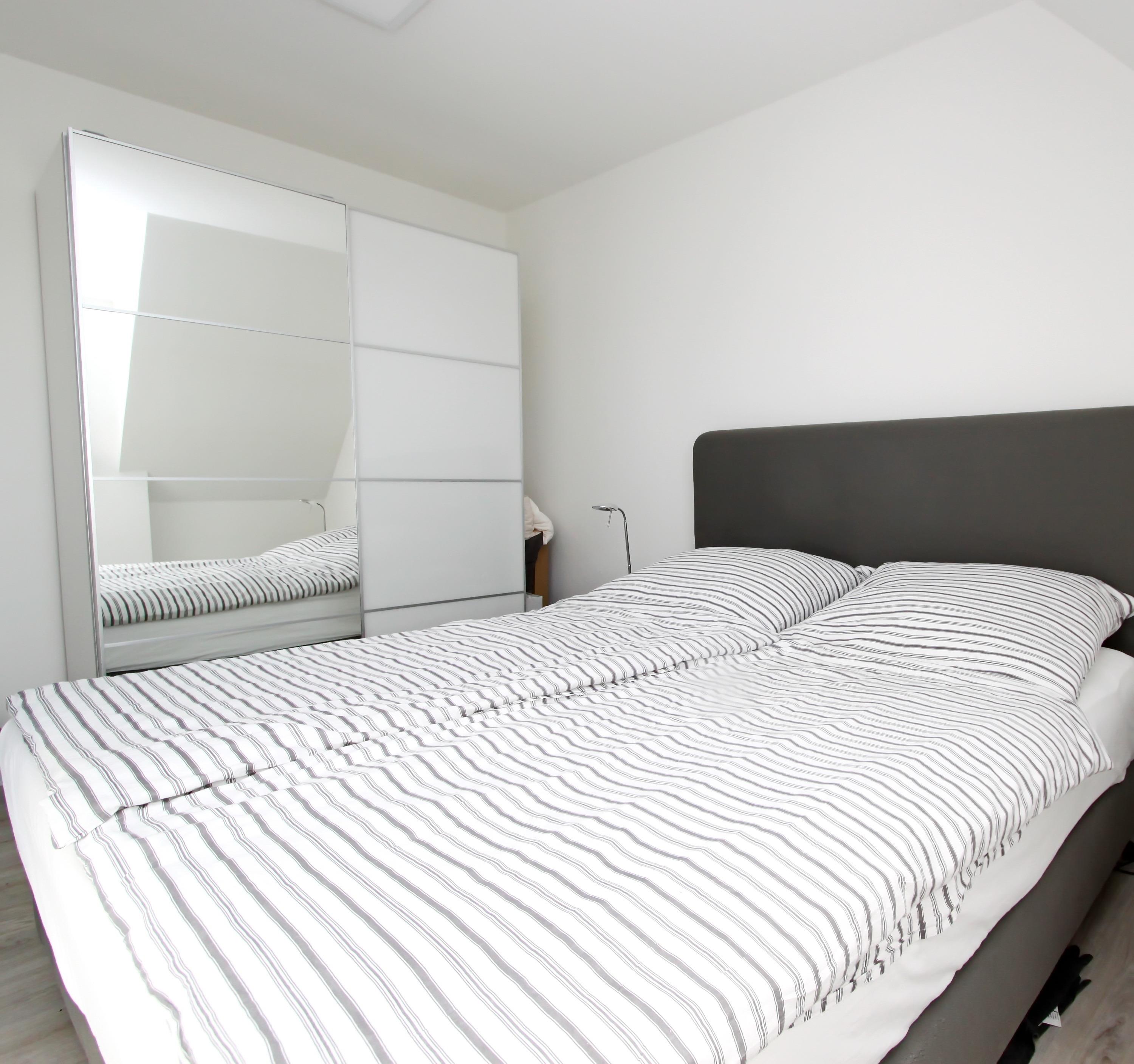 Das separate Schlafzimmer verfügt über ein Doppelbett, Nachttische, Flatscreen-TV und einem großen Kleiderschrank, der ausreichend Stauraum bietet. Flur mit kleinem Schreibtisch und Garderobe. Duschbad/WC mit ebenerdiger Dusche. Über eine Treppe gelangen Sie ins Dachgeschoss. Dort ist ein weiteres Schlafzimmer mit einem Doppelbett, Nachttische, Flatscreen-TV, Einbauspiegelschrank, kl. Schaukelstuhl, Tisch und viel Stauraum in den kleinen Sideboards entlang der Wand. Das Appartement ist komplett mit hochwertigen Vinyl Boden ausgelegt. Bei Anreise sind die Betten bezogen, auch Handtücher sind inklusive.