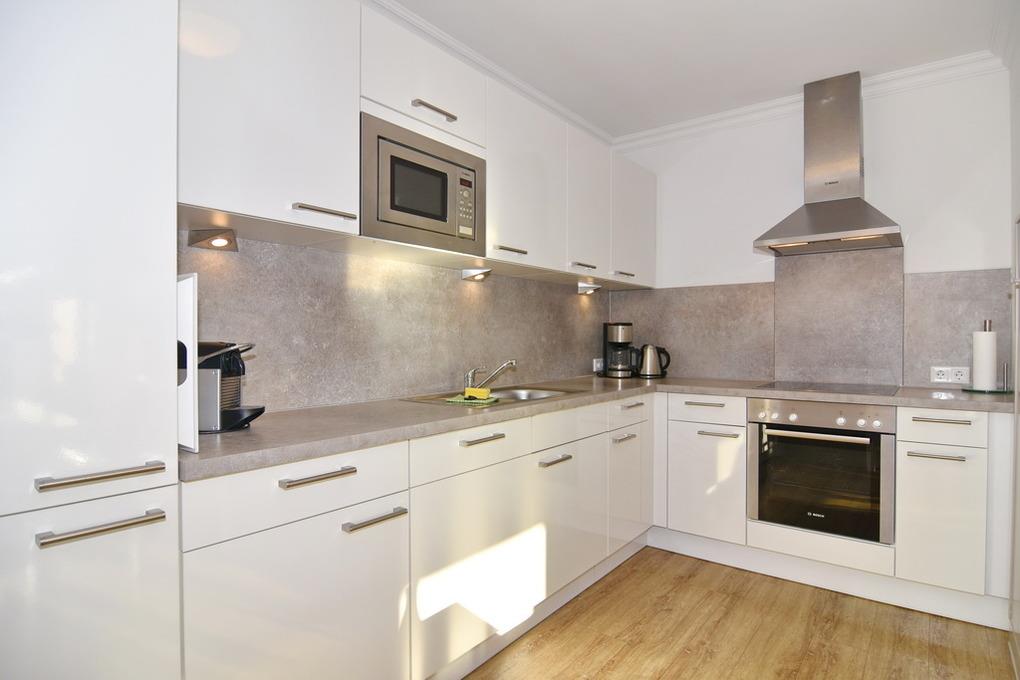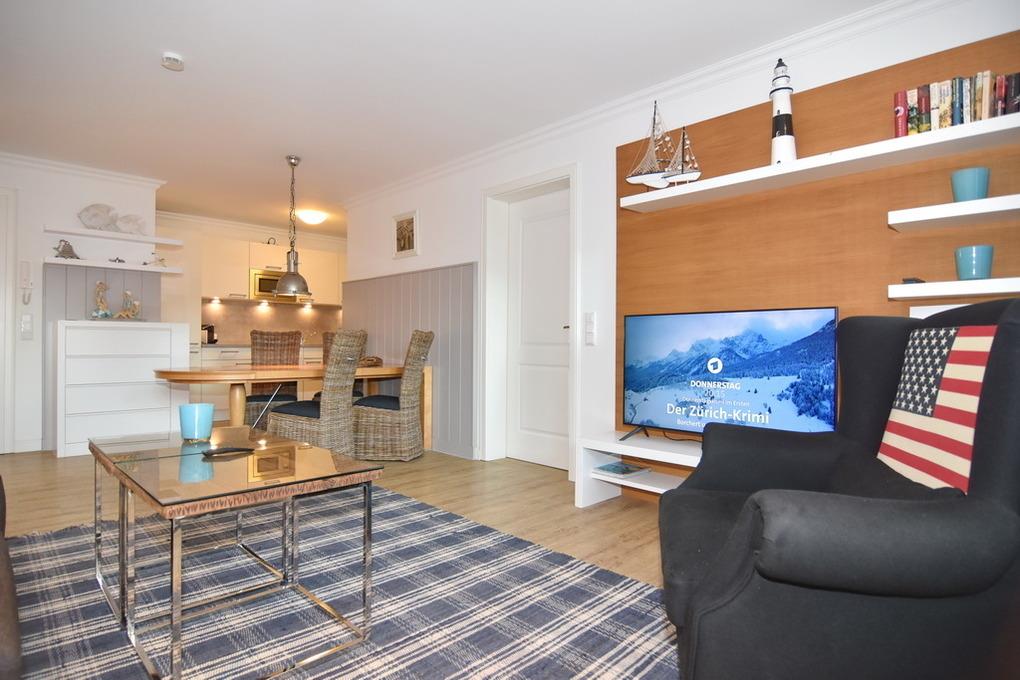 Moderne 2- Zimmer-Ferienwohnung im Erdgeschoss, ca. 68 m², Nichtraucher. Wohnzimmer mit Schlafcouch, Sessel, Esstisch mit 4 Stühlen, TV, Stereoanlage, W-LAN (ohne Gewähr), offene Küche mit Geschirrspüler, Mikrowelle und Backofen, Nespresso-Maschine, Schlafzimmer mit Doppelbett, Einbauschrank und TV (mit Netflix-Funktion), Südterrasse und kleiner Grünstreifen, Duschbad/ WC, Flur mit Garderobe. Fußboden mit Design Belag. Tierhaltung ist nicht gestattet. Ab 2026 ist Tierhaltung gestattet und muss kostnepflichtig angemeldet werden. Garagen- Parkbox Nr. 16 ( nicht für jeden PKW geeignet, max. Höhe 1,50m, max. Gewicht 2t, Breite 1,9, Länge 5 m, vor Nutzung muss die Bedienanleitung gelesen werden. Anleitung befindet sich vor Ort!). Bettwäsche und Handtücher sind zur Anreise aufgezogen.