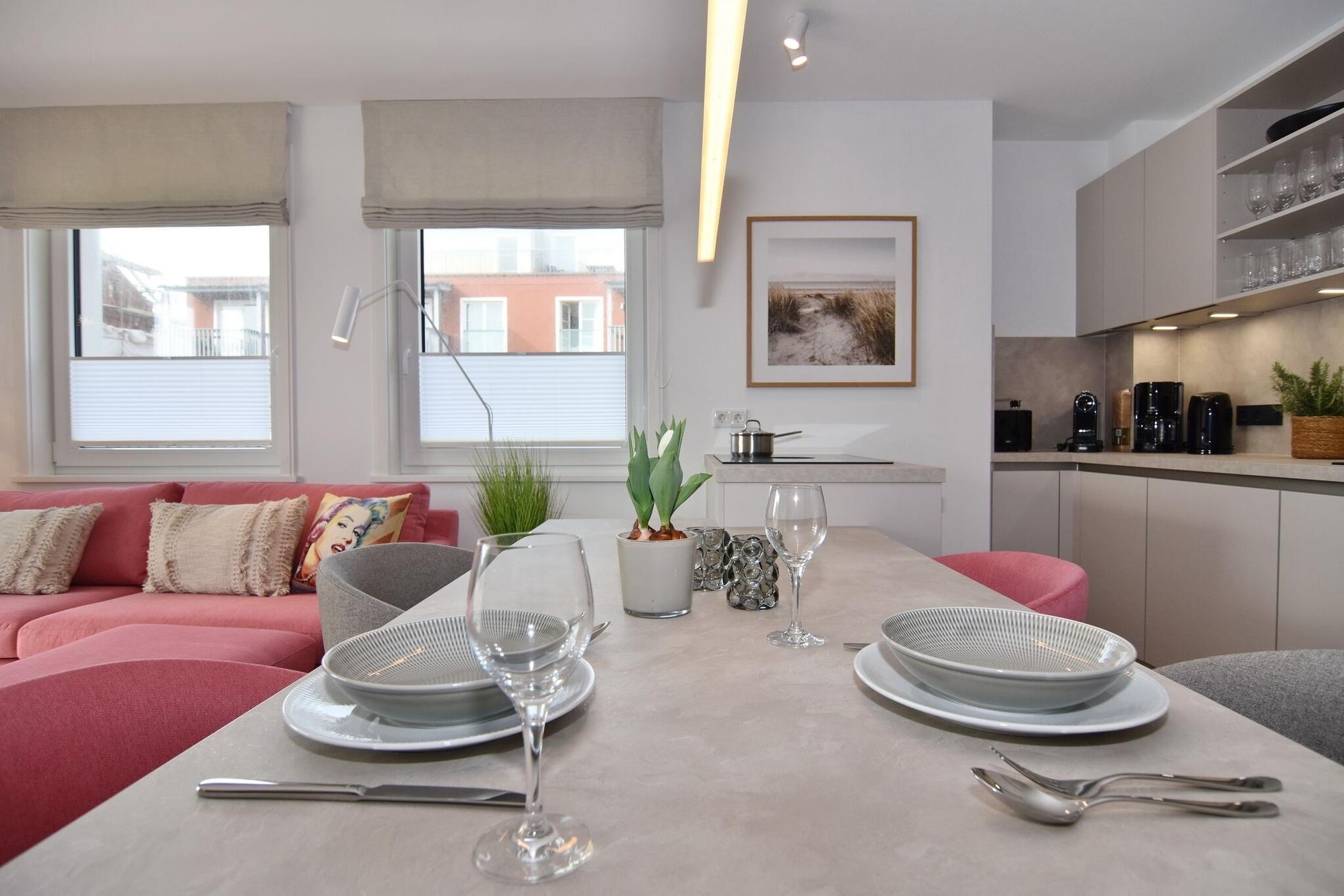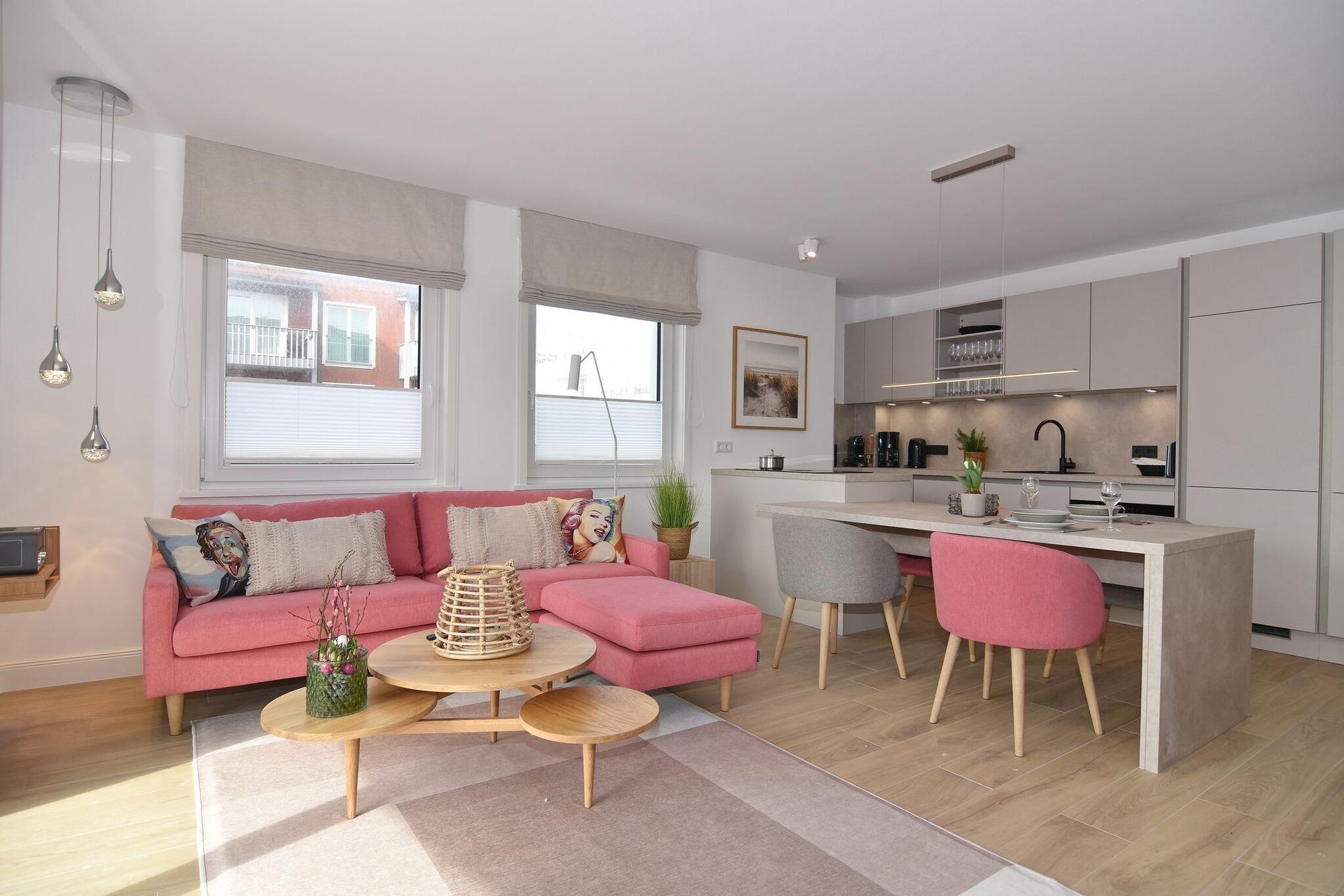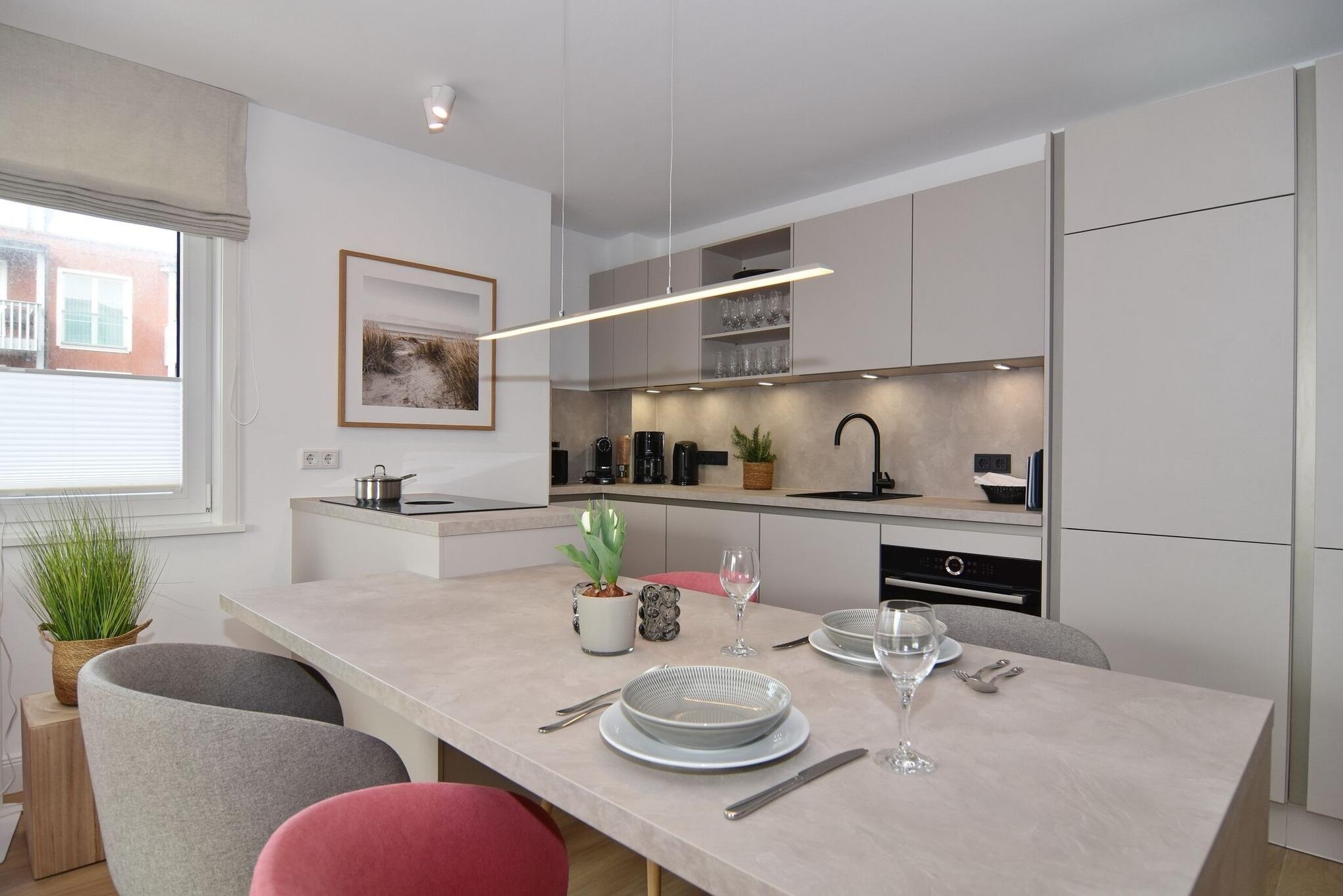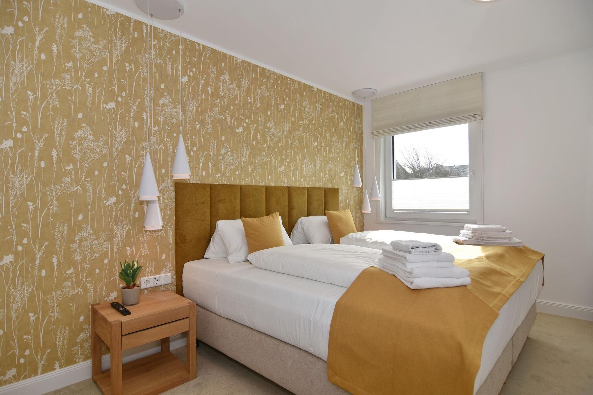 Die hochwertige 3-Zimmer-Wohnung im 1. OG mit ca. 81 qm ist für maximal 4 Personen. Vom geräumigen Flur mit Garderobe gelangen Sie in das Wohnzimmer mit offener Küche und möblierten Südbalkon. Die hochwertige Küche bietet neben Bora Induktionsherd auch Geschirrspüler, Tiefkühlschrank und Backofen mit integrierter Mikrowelle. Beide Schlafräume bieten mit Boxspringbetten (180x200 und 200x200) der Marke FBF hochwertigen Schlafkomfort und verfügen über Einbauschrank und TV (1 Kinderbett im gelben Schlafzimmer zubuchbar). Die Wohnung verfügt über 2 moderne Duschbäder mit Haar- und Handtuchtrockner. Die Wohnung ist mit großformatigen Fliesen ausgelegt und verfügt über Fußbodenheizung. Lediglich die Schlafräume sind mit Teppichware versehen. Internet (ohne Gewähr) und Smart-TV sind vorhanden.
