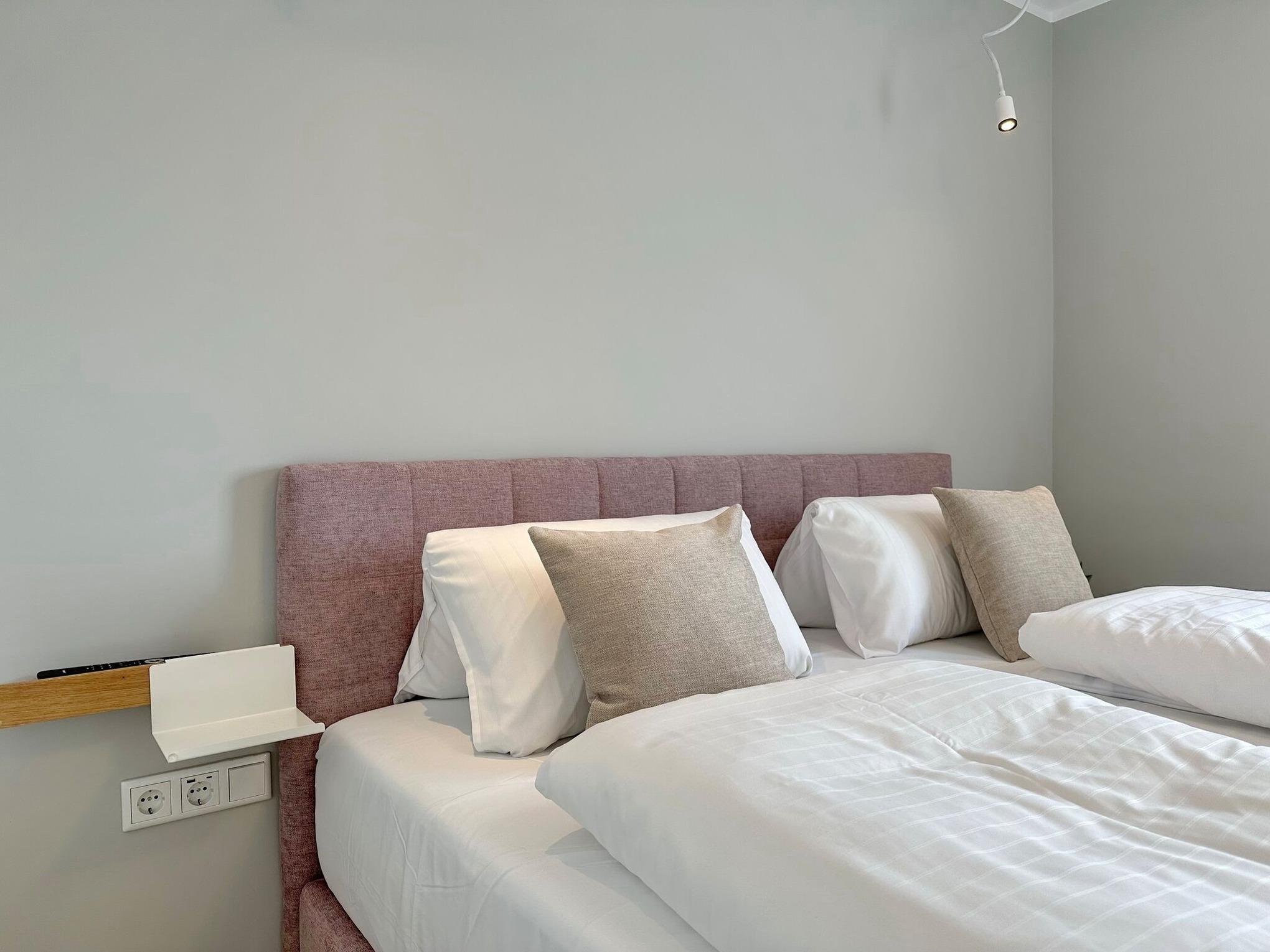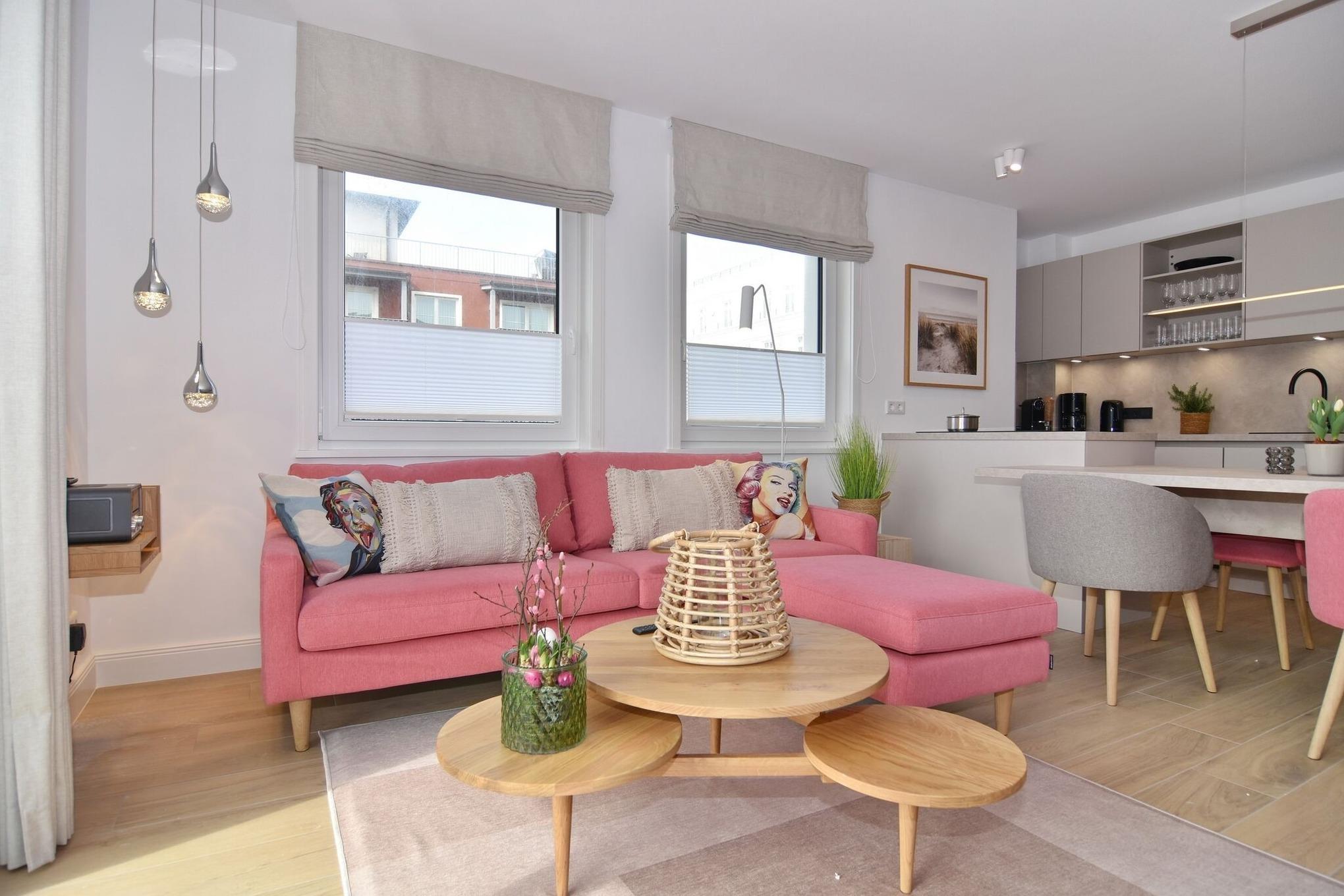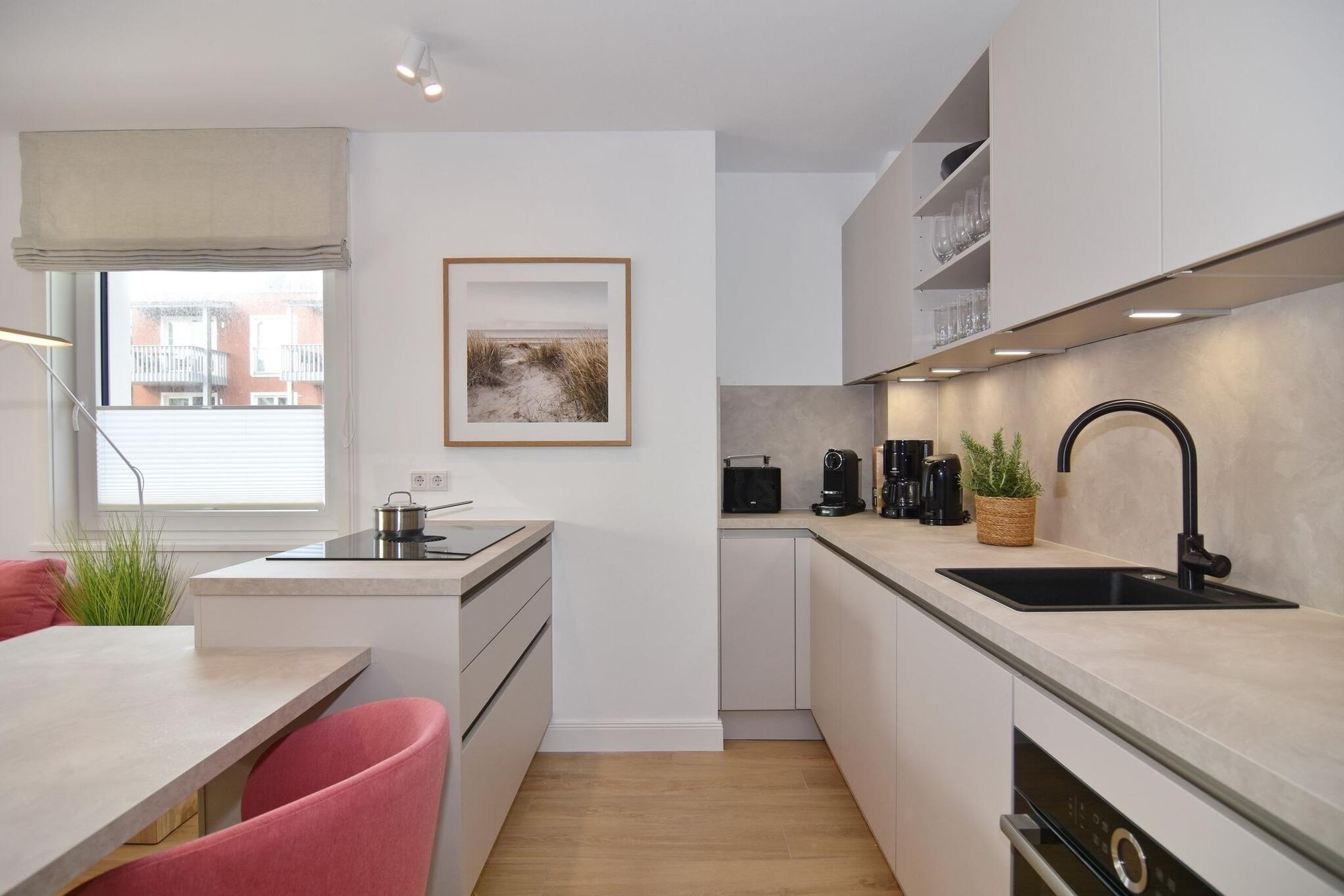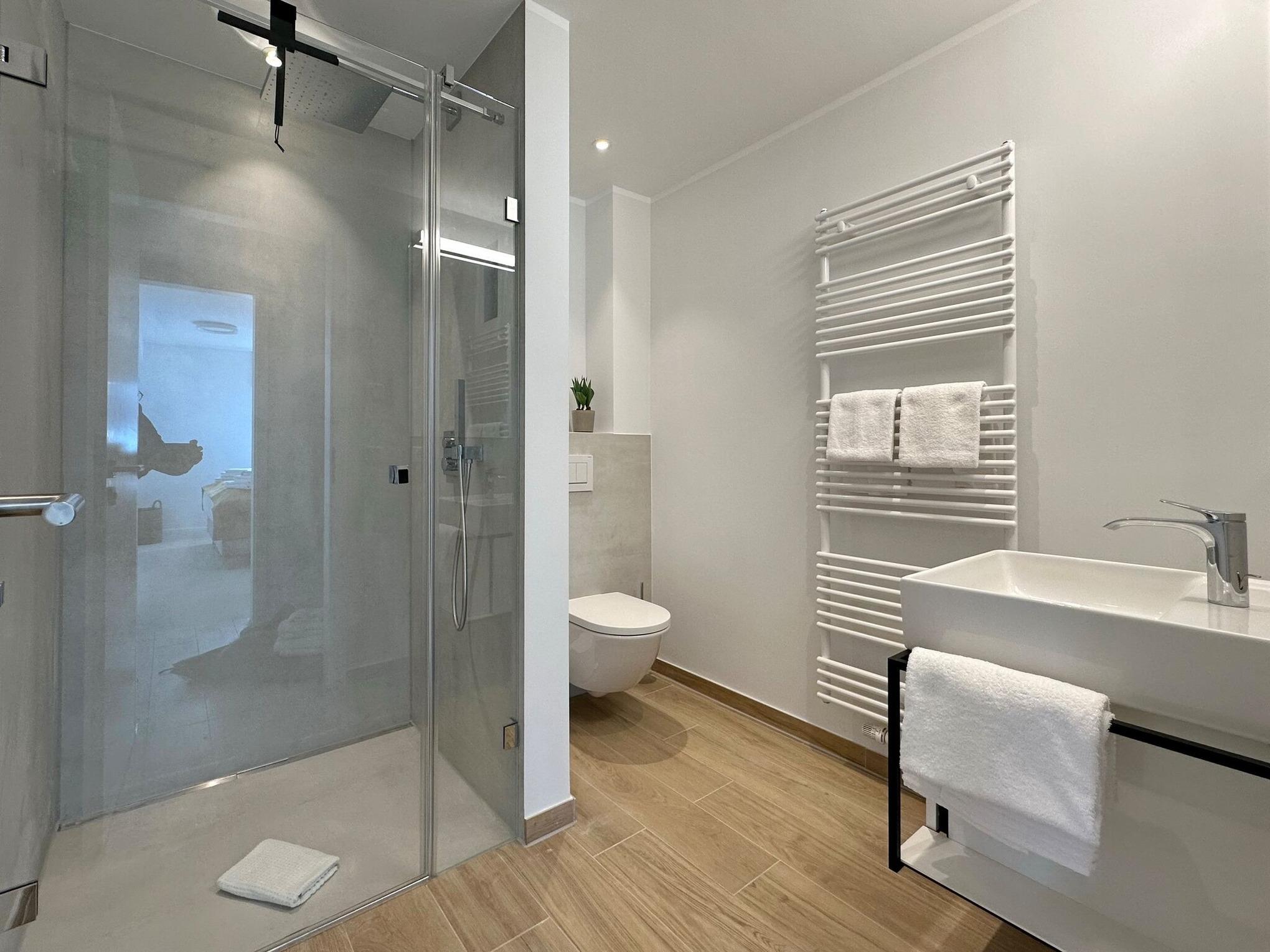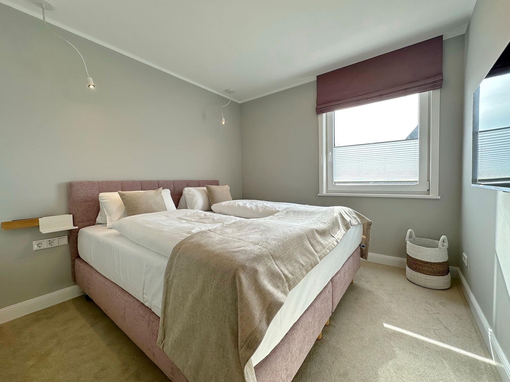 Die hochwertige 3-Zimmer-Wohnung im 1. OG mit ca. 81 qm ist für maximal 4 Personen. Vom geräumigen Flur mit Garderobe gelangen Sie in das Wohnzimmer mit offener Küche und möblierten Südbalkon. Die hochwertige Küche bietet neben Bora Induktionsherd auch Geschirrspüler, Tiefkühlschrank und Backofen mit integrierter Mikrowelle. Beide Schlafräume bieten mit Boxspringbetten (180x200 und 200x200) der Marke FBF hochwertigen Schlafkomfort und verfügen über Einbauschrank und TV (1 Kinderbett im gelben Schlafzimmer zubuchbar). Die Wohnung verfügt über 2 moderne Duschbäder mit Haar- und Handtuchtrockner. Die Wohnung ist mit großformatigen Fliesen ausgelegt und verfügt über Fußbodenheizung. Lediglich die Schlafräume sind mit Teppichware versehen. Internet (ohne Gewähr) und Smart-TV sind vorhanden.