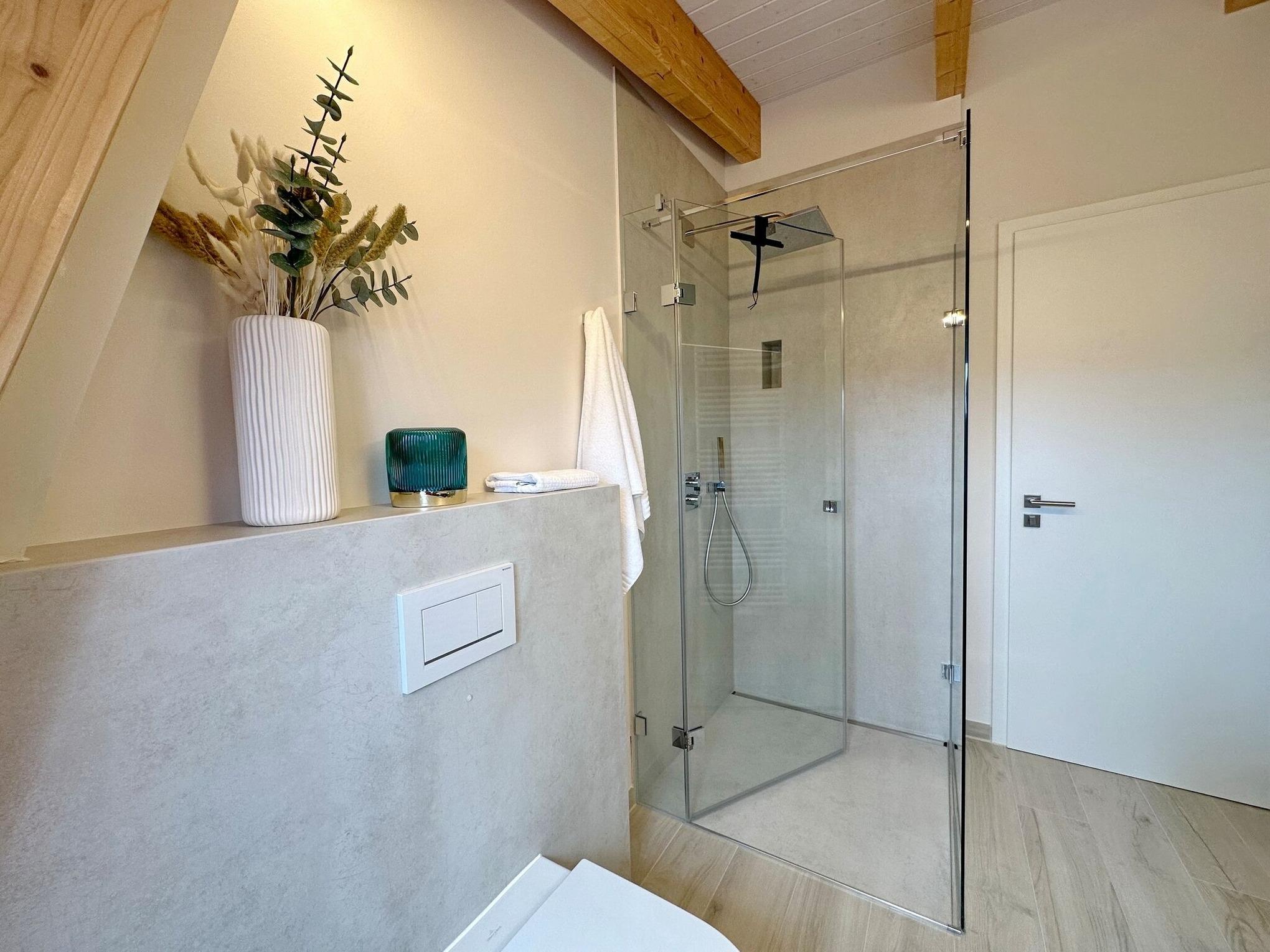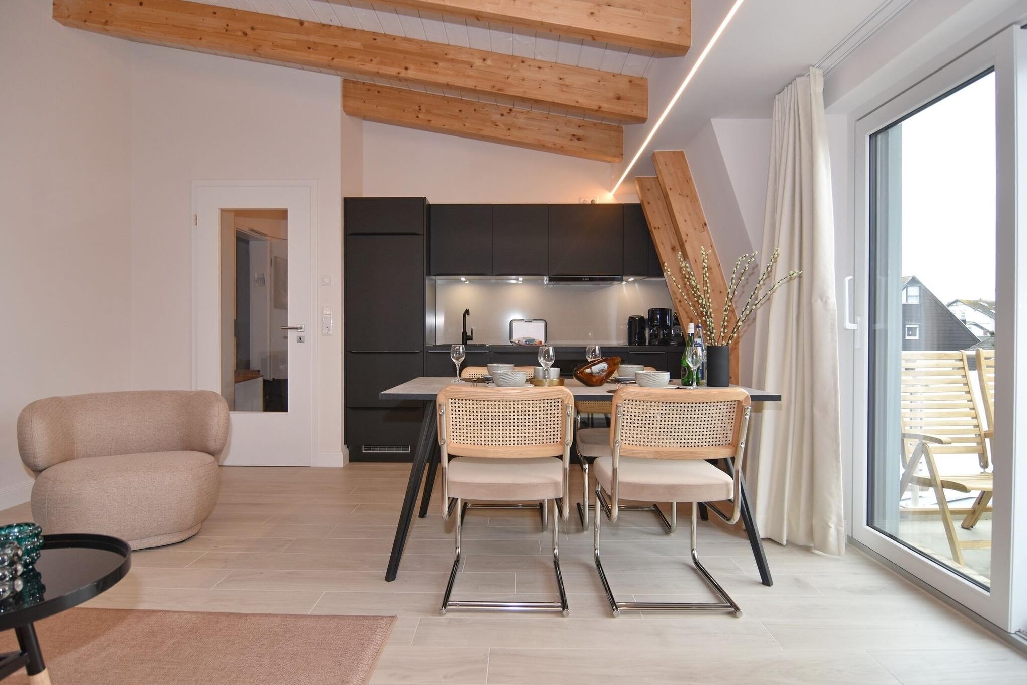 Die hochwertige 2-Zimmer-Wohnung im 2. OG mit ca. 54 qm ist für maximal 3 Personen ausgestattet. Vom Flur mit Garderobe gelangen Sie in das Wohnzimmer mit offener Küche und möbliertem Südbalkon. Die hochwertige Küche bietet neben Induktionsherd auch Geschirrspüler, Kühlschrank mit Gefrierfach und Backofen mit integrierter Mikrowelle. Die Wohnung bietet Ihnen ein Schlafzimmer und ein Duschbad /WC mit Haar- und Handtuchtrockner. Das Schlafzimmer ist mit einem Boxspringbett (180x200) der Marke FBF, Flat-TV und Einbauschrank ausgestattet (1 Kinderbett zubuchbar). Bis auf das Schlafzimmer sind die Räume mit großformatigen Fliesen versehen.