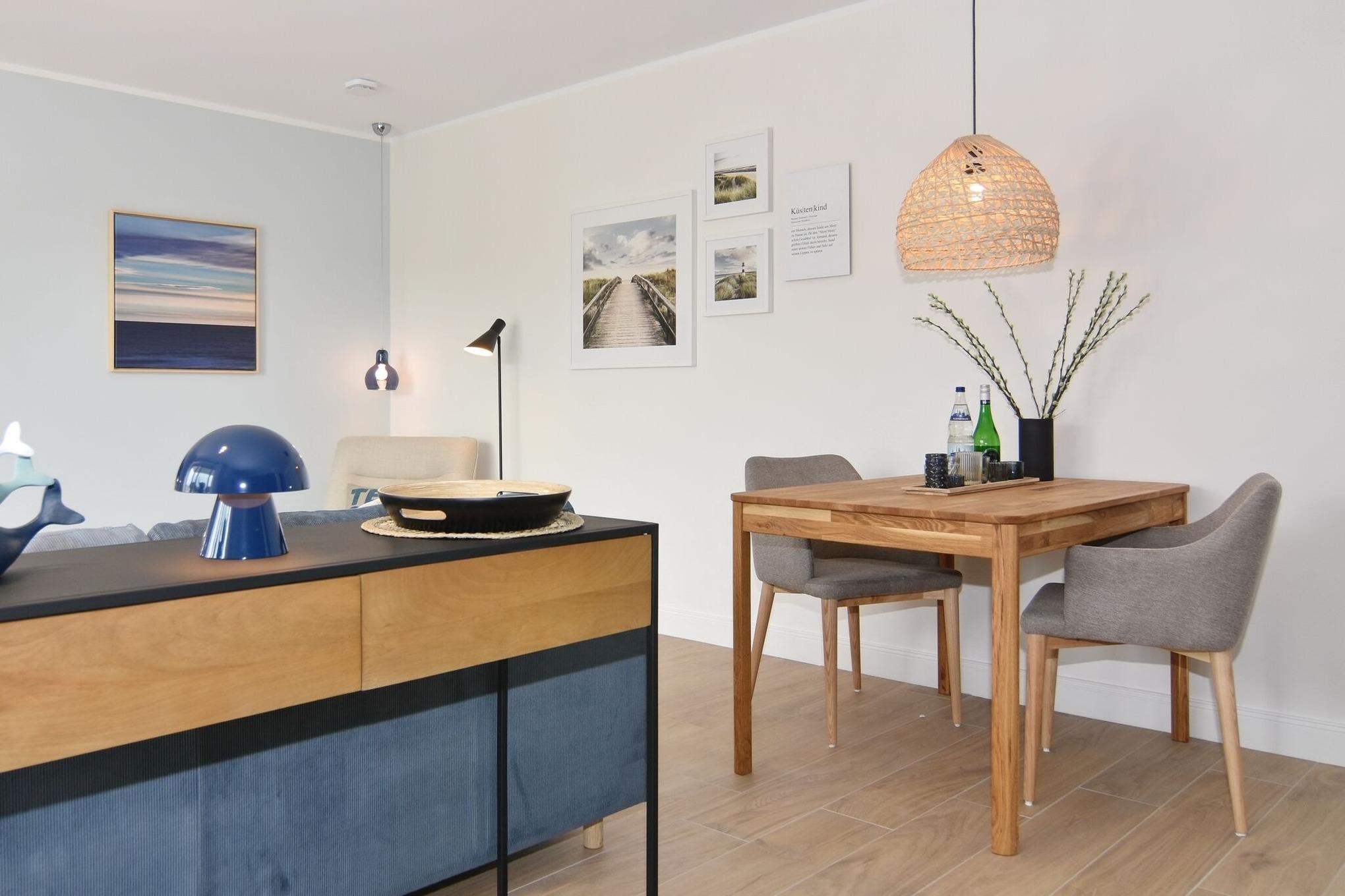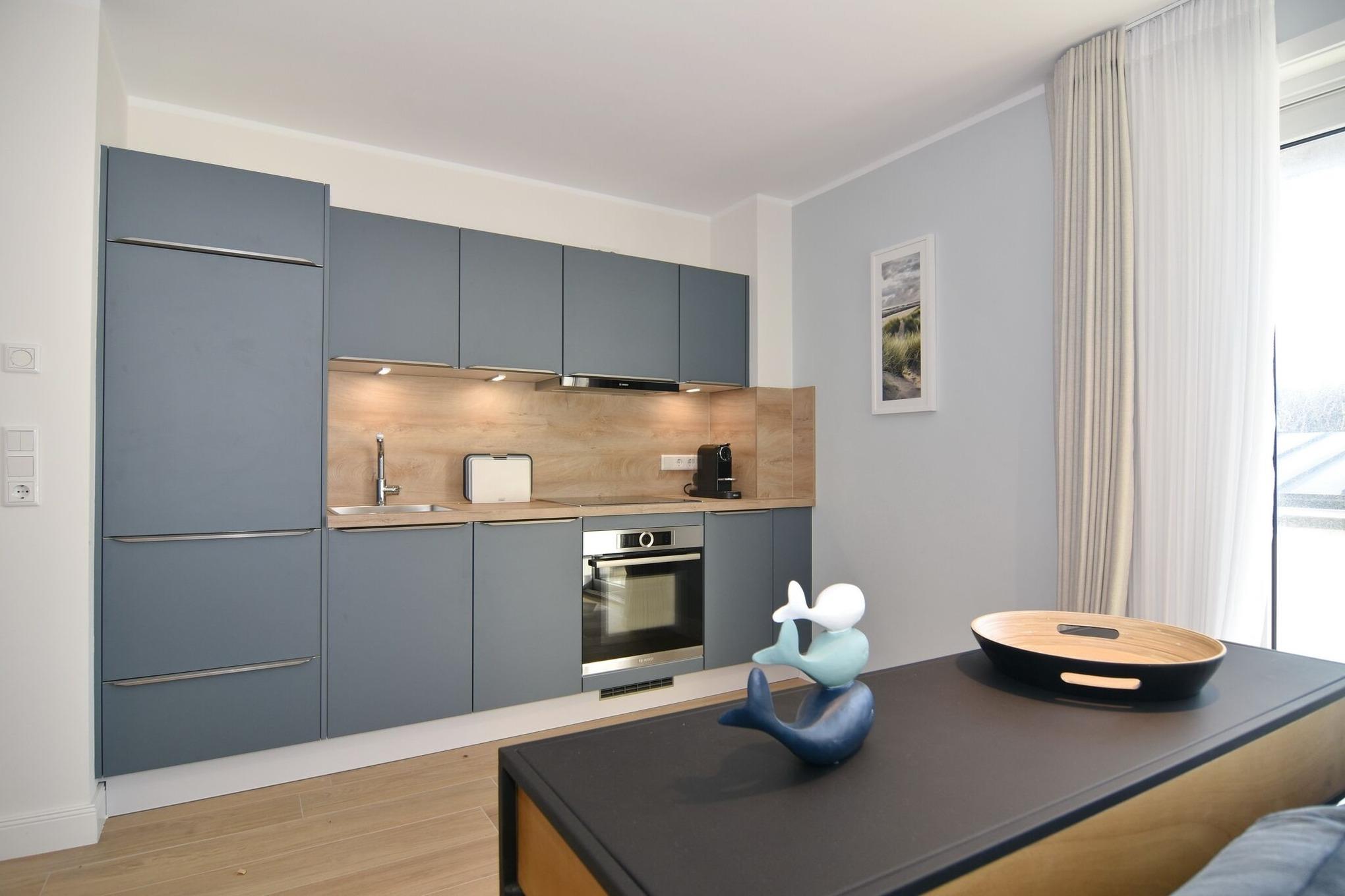 Die exklusive 2-Zimmer-Wohnung im 1. OG misst ca. 54 qm ist für 2 Personen ausgestattet. Vom Flur mit Garderobe gelangen Sie in das Wohnzimmer mit offener Küche und möbliertem Südbalkon. Die hochwertige Küche bietet neben Induktionsherd auch Geschirrspüler, Kühlschrank mit Gefrierfach und Backofen mit integrierter Mikrowelle. Die Wohnung bietet Ihnen ein Schlafzimmer und ein Duschbad /WC mit Haar- und Handtuchtrockner. Das Schlafzimmer ist mit einem Boxspringbett (200x200) der Marke FBF, Smart-TV, Safe und Einbauschrank ausgestattet, 1 Kinderbett zubuchbar. Bis auf das Schlafzimmer sind die Räume mit großformatigen Fliesen versehen.