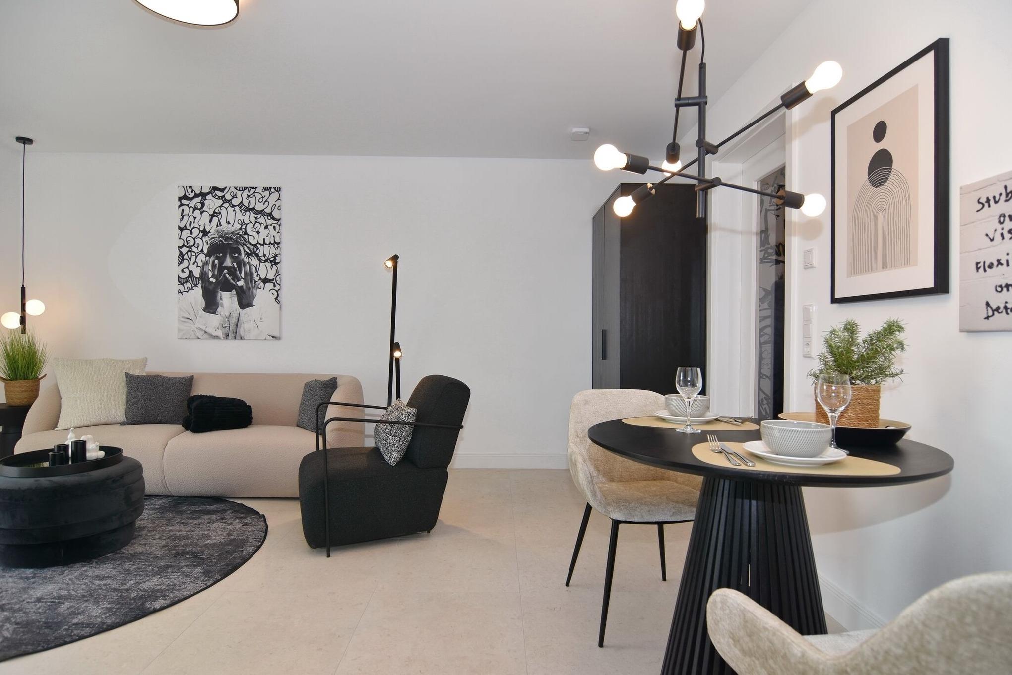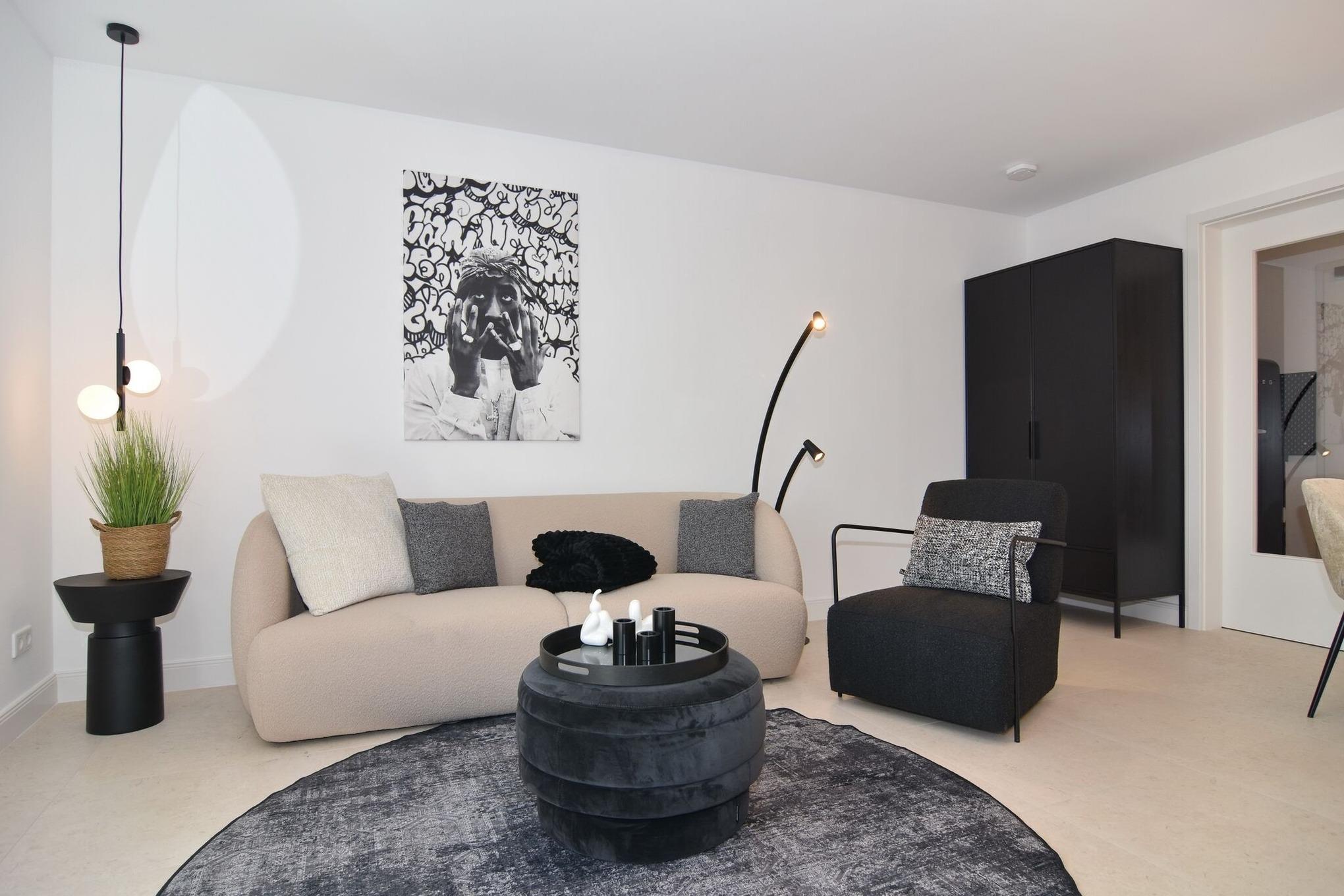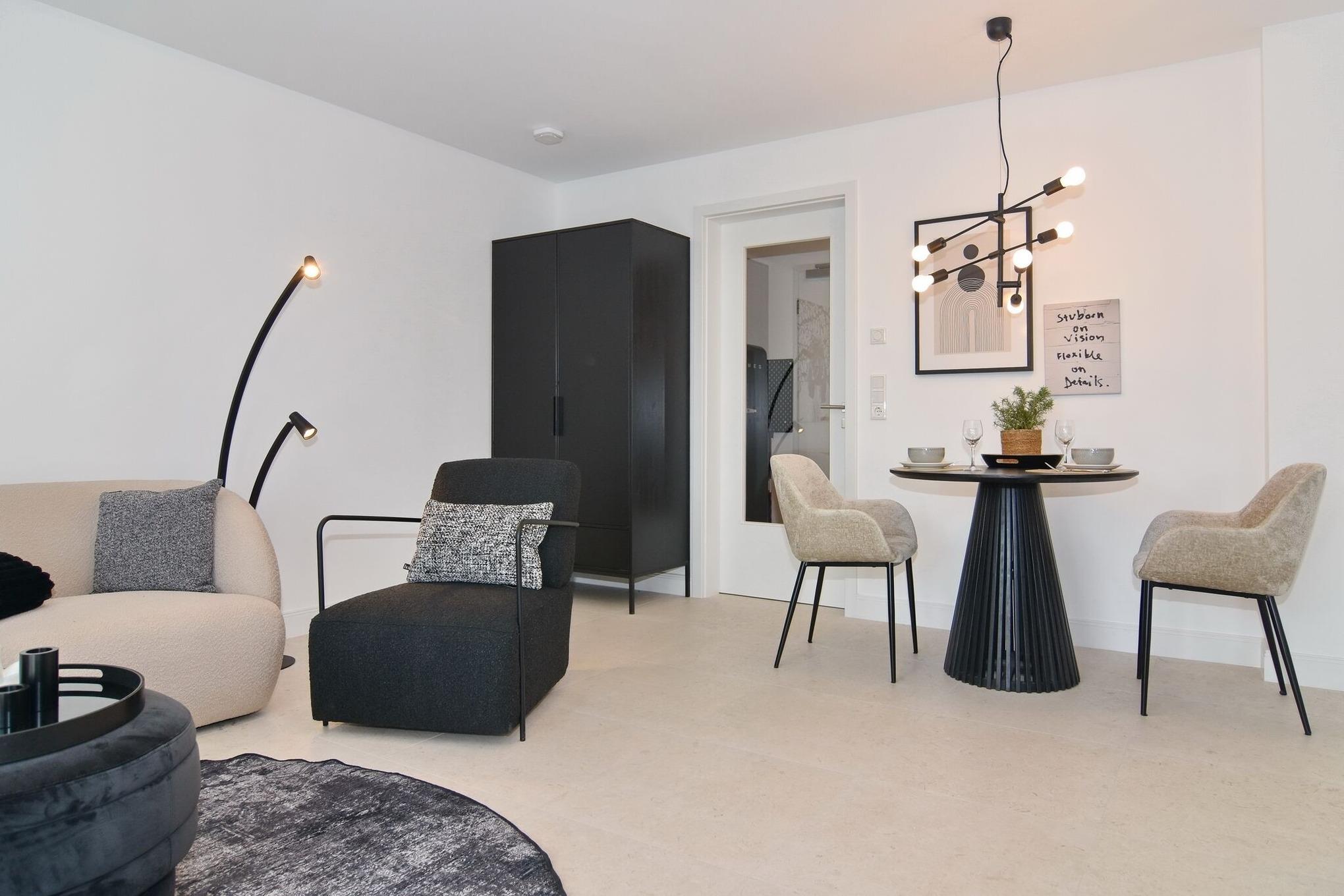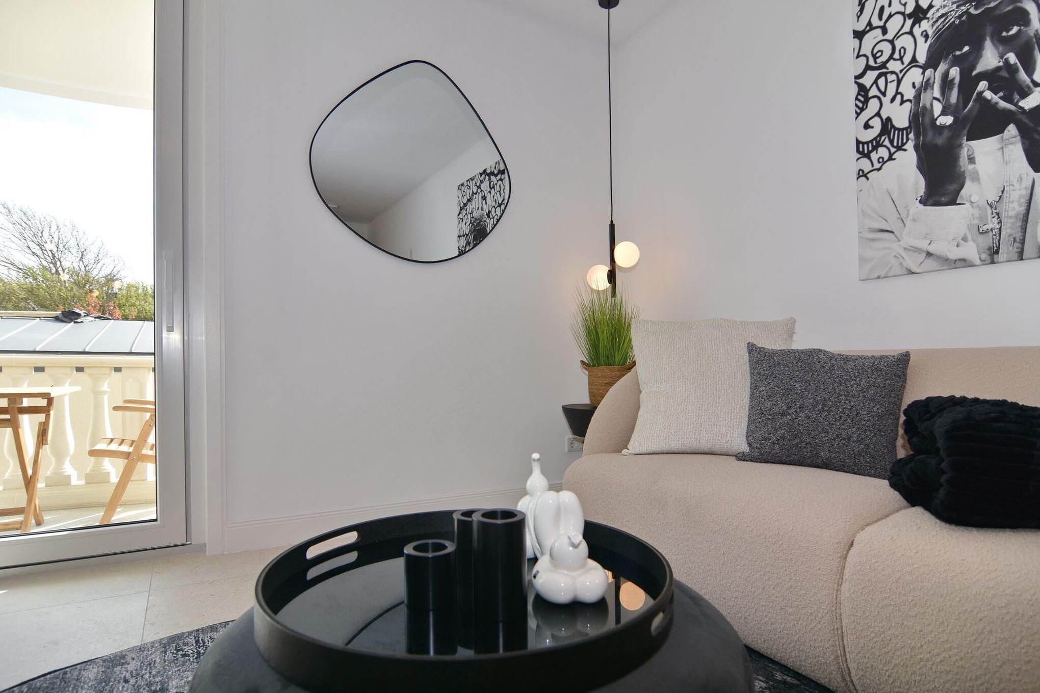 Die hochwertige 2-Zimmer-Wohnung im 1.OG mit ca. 47 qm ist für maximal 2 Personen ausgestattet. Vom Flur mit Küche gelangen Sie in das Wohnzimmer mit möbliertem Südbalkon. Die kleine, aber hochwertige Küche bietet neben Induktionsherd auch Geschirrspüler, Smeg Kühlschrank mit Gefrierfach und Mikrowelle. Die Wohnung bietet Ihnen ein Schlafzimmer und ein Duschbad /WC mit Haar- und Handtuchtrockner. Das Schlafzimmer ist mit einem Boxspringbett (180x200) der Marke FBF, Flat-TV und Einbauschrank ausgestattet. Bis auf das Schlafzimmer sind die Räume mit großformatigen Fliesen versehen.