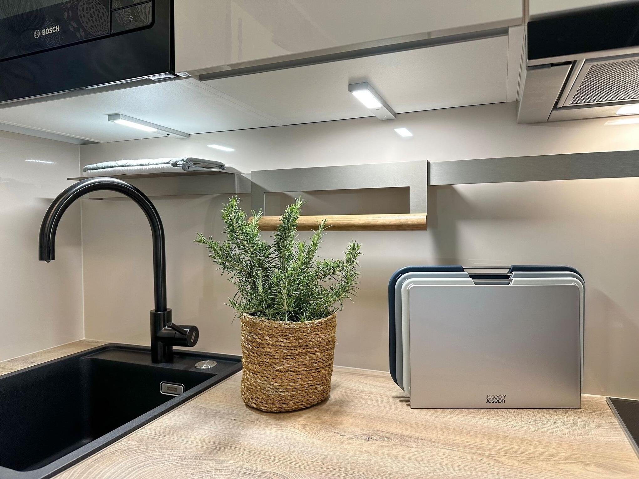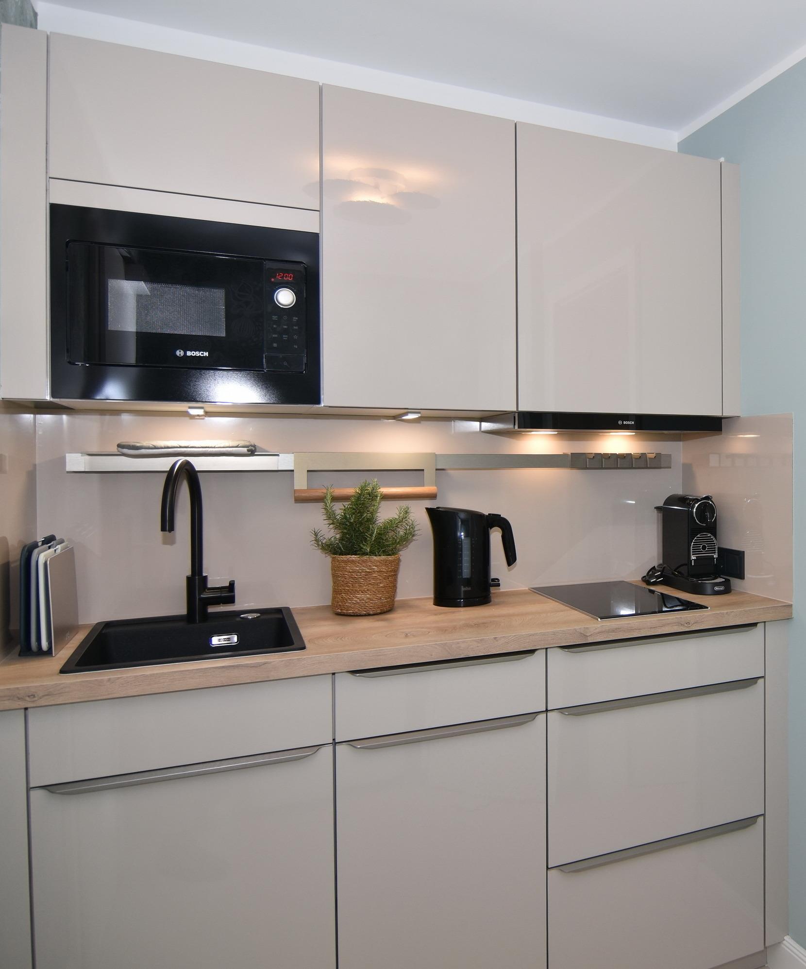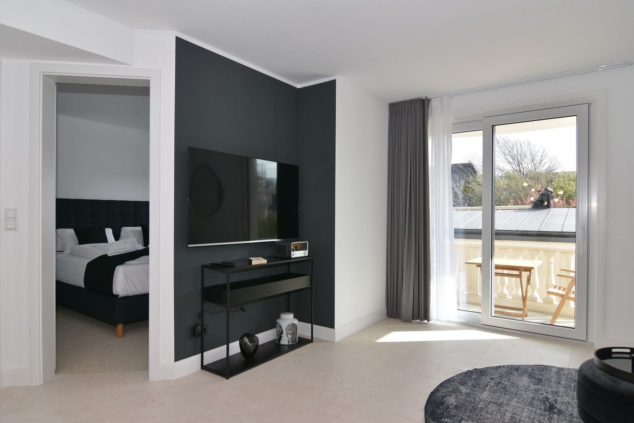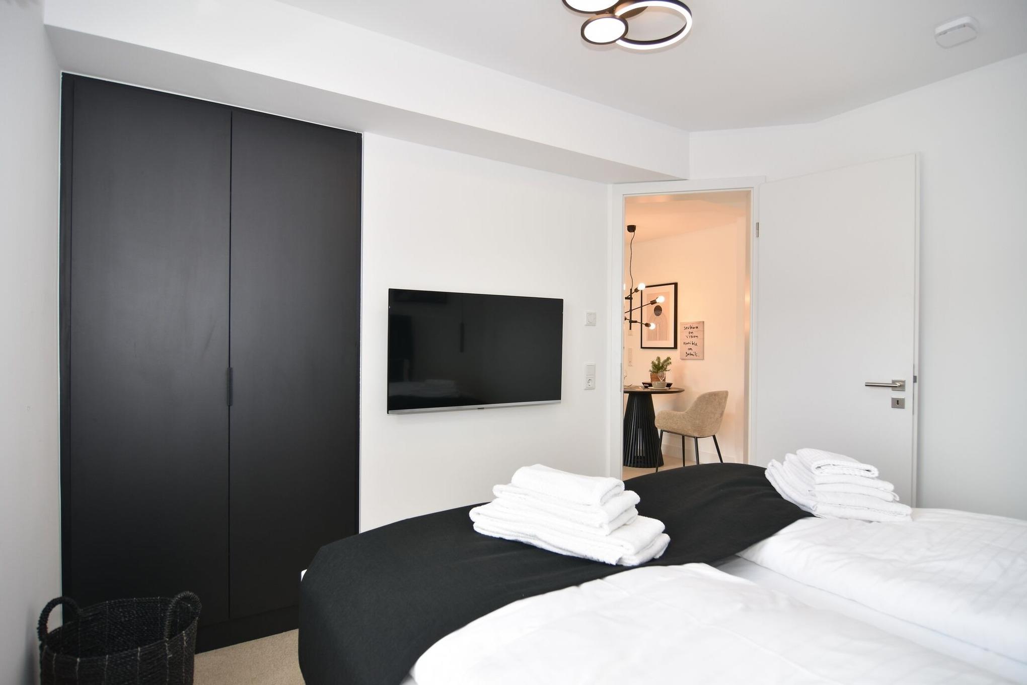 Die hochwertige 2-Zimmer-Wohnung im 1.OG mit ca. 47 qm ist für maximal 2 Personen ausgestattet. Vom Flur mit Küche gelangen Sie in das Wohnzimmer mit möbliertem Südbalkon. Die kleine, aber hochwertige Küche bietet neben Induktionsherd auch Geschirrspüler, Smeg Kühlschrank mit Gefrierfach und Mikrowelle. Die Wohnung bietet Ihnen ein Schlafzimmer und ein Duschbad /WC mit Haar- und Handtuchtrockner. Das Schlafzimmer ist mit einem Boxspringbett (180x200) der Marke FBF, Flat-TV und Einbauschrank ausgestattet. Bis auf das Schlafzimmer sind die Räume mit großformatigen Fliesen versehen.