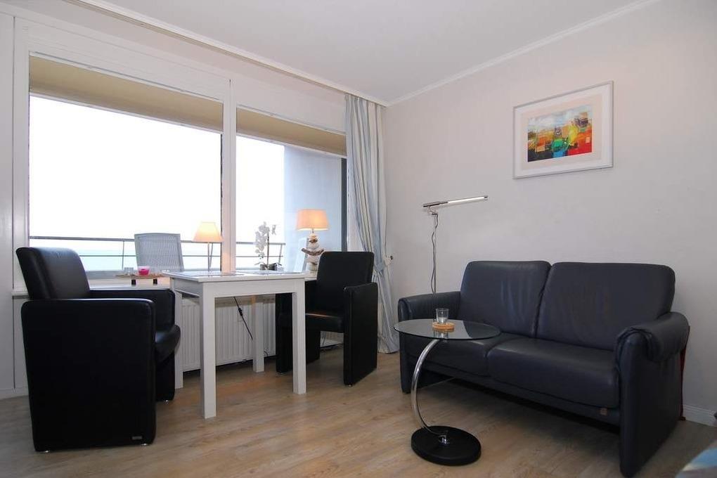 Exklusive 1-Zi.-Ferienwohnung im 2.OG zur Seeseite, ca. 34 m², "Haus am Meer". Nichtraucher![ Wohn-/Schlafraum mit Doppelbett (160x200, 2 Matratzen á 80 cm), Zweisitzercouch, Tisch, 2 Sessel, Essplatz am Fenster mit Blick aufs Meer, Radio, Flat-TV, DVD, W-LAN ( ohne Gewähr ). Westbalkon mit Balkonmöbel, Duschbad/WC, Küchenzeile mit Geschirrspüler u. Mikrowelle im Flurbereich! Tierhaltung ist nicht gestattet! Bettwäsche und Handtücher sind zur Anreise aufgezogen. Ein PKW-Stellplatz kann kostenpflichtig zugebucht werden. Beginnend vom 15.10.2025 bis 5.4.2026 (Ostern) findet die Fassandensanierung der Landseite (Osten) sowie des Südgiebels statt. Mit Baulärm ist in dieser Zeit zu rechnen.