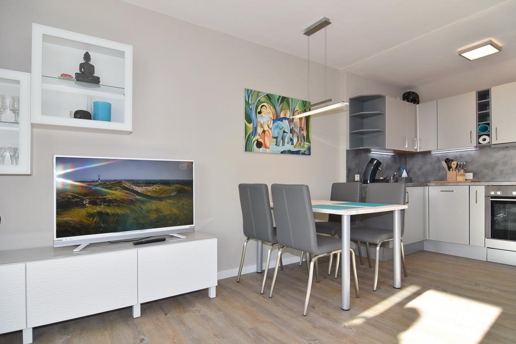 In unmittelbarer Strandnähe bieten wir Ihnen diese 2-Zimmer-Ferienwohnung für 2 Personen im Haus Käptn Christiansen. Die Wohnung überzeugt nicht nur durch Ihre super Lage und den geschützten Balkon, sondern auch durch eine moderne Ausstattung. Vom großzügigen Eingangsbereich mit Einbauschränken und Garderobe gelangen Sie in ein modernes Duschbad mit Handbrause, Regendusche und Sitzplatz in der Dusche. Der Wohnbereich hat eine moderne Sitzecke mit Eckcouch und Sessel und einen großzügigen Essplatz. WLAN (ohne Gewähr) vorhanden. Die offene Küche bietet neben dem Ceranherd einen Backofen und Geschirrspüler. Die Küche ist vollständig ausgestattet. Vom Wohnraum aus gelangen Sie auf den großzügigen Südbalkon. Hier lässt es sich wunderbar aushalten - selbst bei starkem Westwind sitzen Sie hier geschützt. Das Schlafzimmer verfügt über ein Boxspringbett (160x200) und Flat-TV. Rauchen und Tierhaltung ist in dieser Wohnung nicht erlaubt. Bettwäsche und Handtücher sind zur Anreise aufgezogen. Parken ist auf dem Grundstück gestattet - hier haben Sie freie Platzwahl. Fahrradkeller und Waschkeller (mit Münzautomaten) vorhanden.