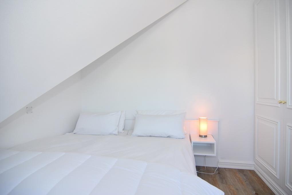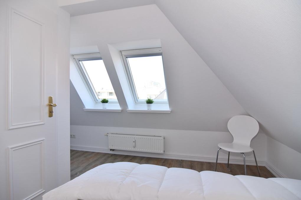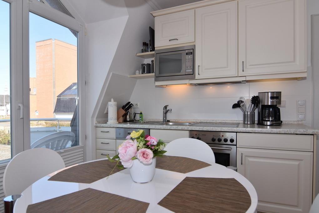 Moderne 2-Zimmer-Ferienwohnung für bis zu 4 Personen in strandnaher Lage. Die Wohnung erstreckt sich über das 1. OG und DG und hat ca. 43qm. Im Obergeschoß befindet sich der helle Wohnraum mit einer Doppelschlafcouch (160cm Liegefläche), Sessel, Essplatz und offener Küche - diese verfügt über einen Geschirrspüler, Backofen und Mikrowelle. Die Wohnung hat sowohl einen West- als auch Nordbalkon. Des weiteren finden Sie hier den Flur mit Garderobe und das Vollbad/WC. Eine Duschvorrichtung und Duschabtrennung sind vorhanden. Eine Treppe aus dem Wohnzimmer ins DG führt Sie zum separaten Schlafzimmer mit Doppelbett und Einbauschränken. Ein großer TV, Internetanschluß, Wasch-Trocken-Kombigerät und ein Pkw-Aussenstellplatz gehören selbstverständlich zur Wohnung. Tierhaltung und Rauchen sind in der Wohnung nicht gestattet. Bettwäsche und Handtücher sind zur Anreise aufgezogen.