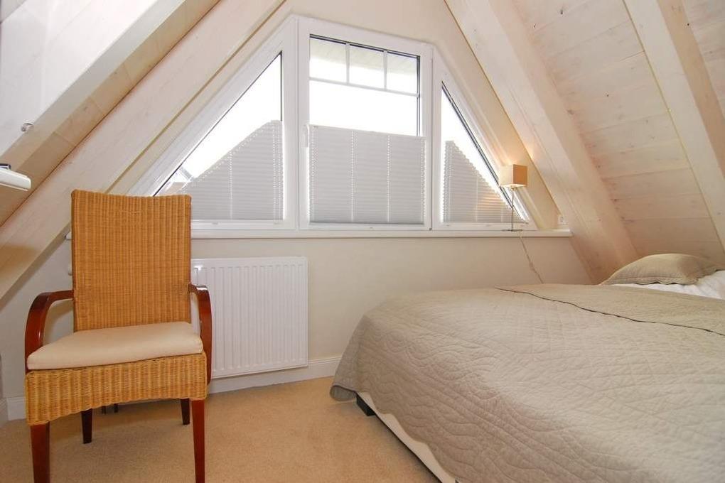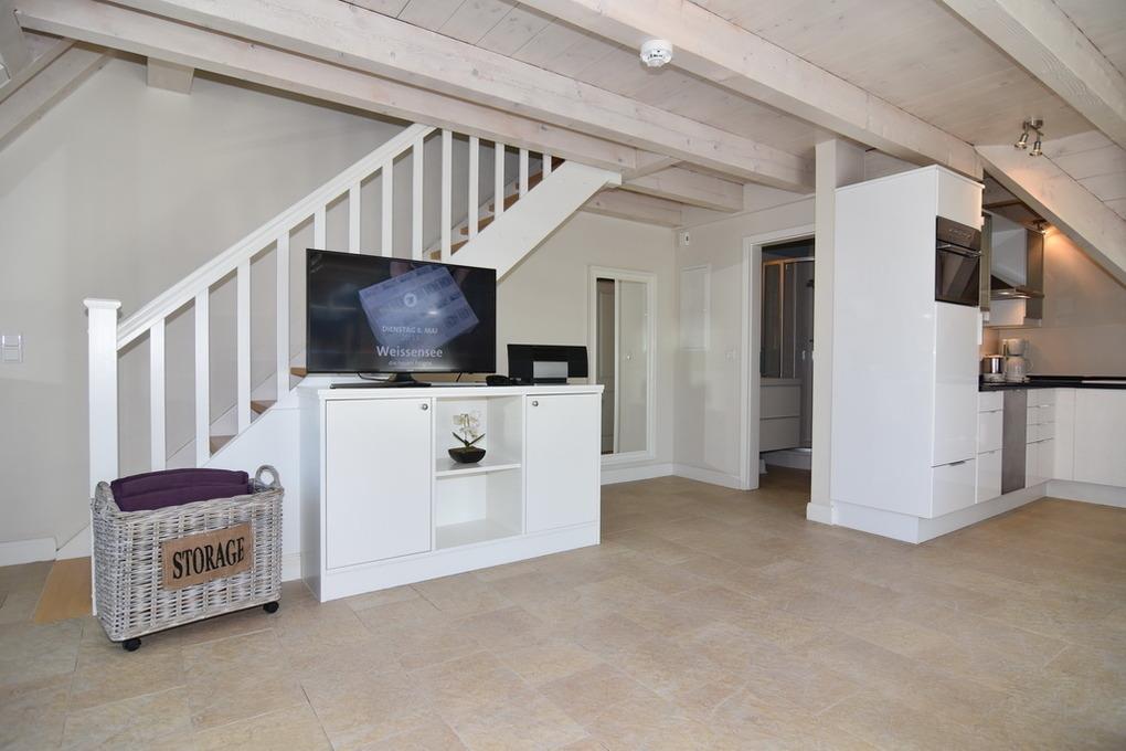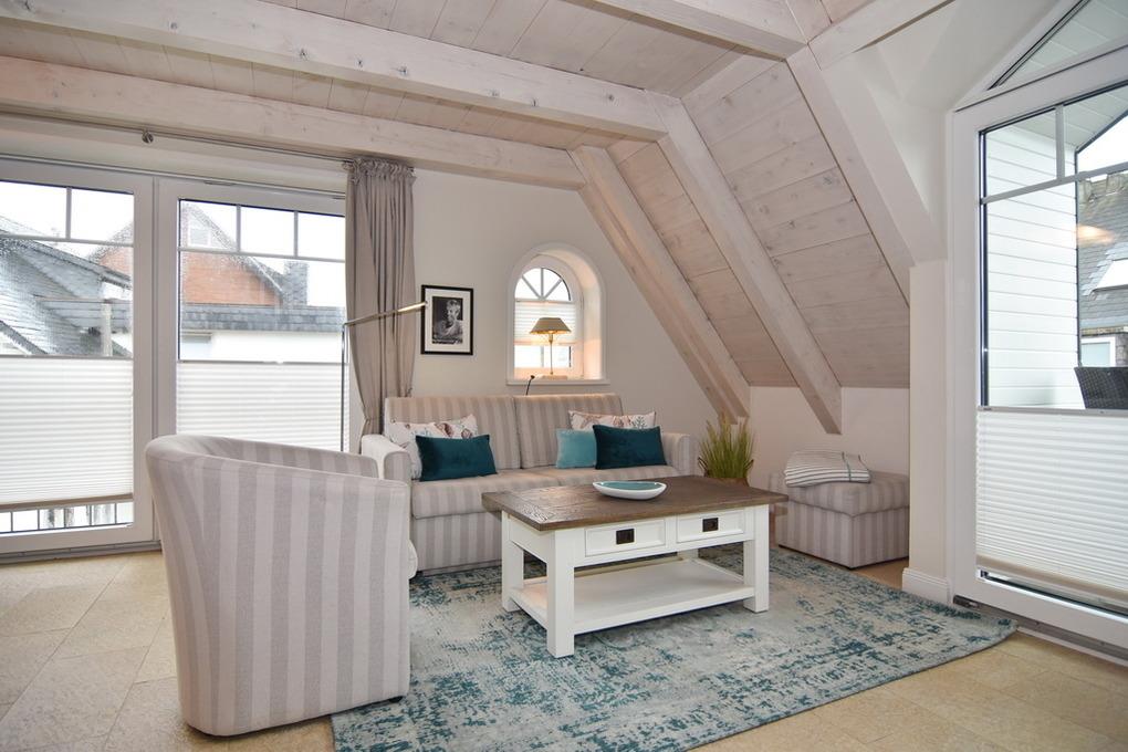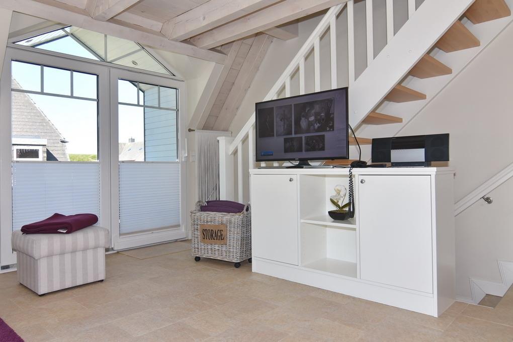 Die Ferienwohnung bietet auf ca. 60m² Platz für 2 Personen. Beim Betreten der Wohnung gelangt man in den Vorflur, der eine Garderobe bietet. Eine offene Treppe führt in das Obergeschoss. Im sonnigen Wohnzimmer befinden sich eine gemütliche Couchecke, ein Essplatz am Fenster und eine integrierte Küche. Diese ist mit einem Geschirrspüler, einer Mikrowelle und einem Backofen ausgestattet. Auf dieser Ebene befindet sich zudem das Duschbad/WC als auch der geschützte Westbalkon. Über eine Treppe aus dem Wohnzimmer gelangt man in das Dachgeschoss, wo sich das Schlafzimmer befindet. Dieses ist mit einem Doppelbett und einem Flatscreen ausgestattet. Hier steht ein WC mit Handwaschbecken zur Verfügung. Ein kostenloser Stellplatz steht zur Verfügung, muss jedoch gebucht werden. Bei der Anreise sind bereits Bettwäsche und Handtücher aufgezogen.