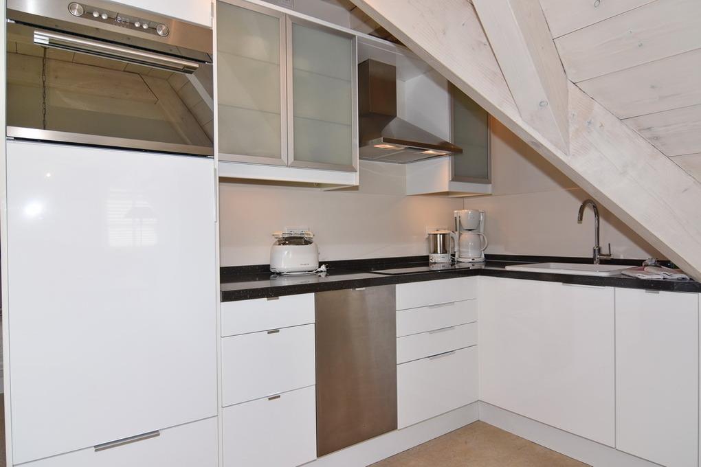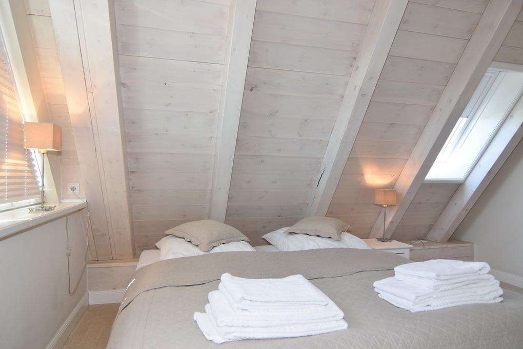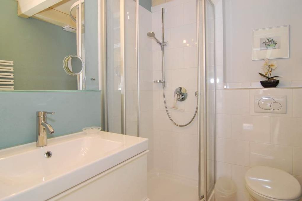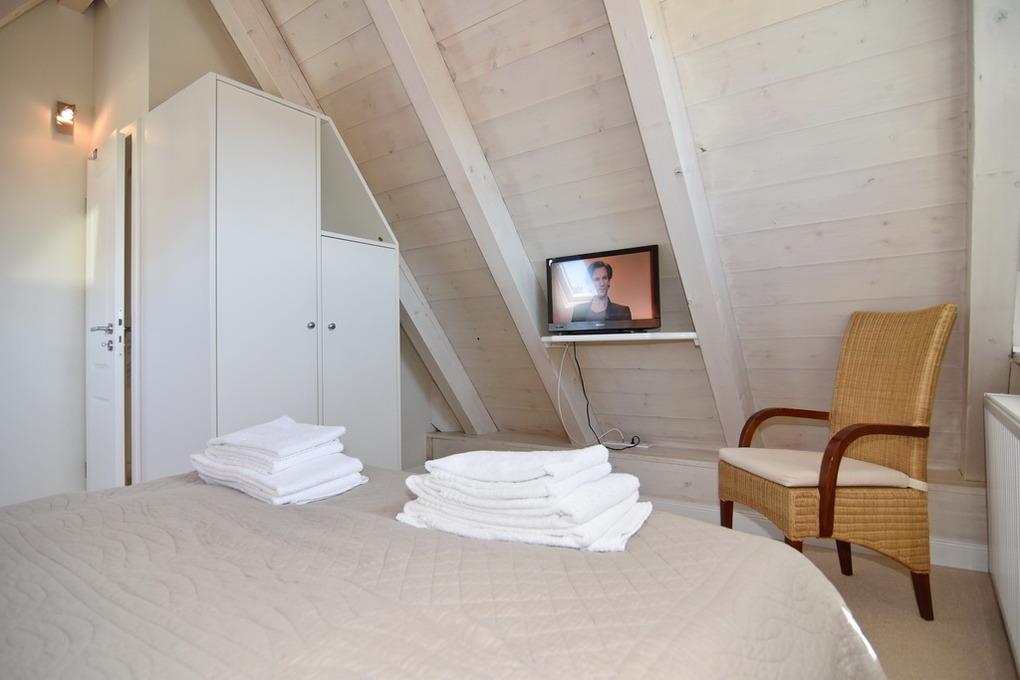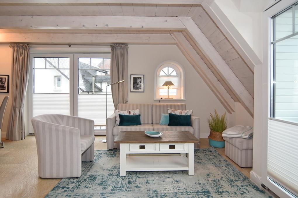 Die Ferienwohnung bietet auf ca. 60m² Platz für 2 Personen. Beim Betreten der Wohnung gelangt man in den Vorflur, der eine Garderobe bietet. Eine offene Treppe führt in das Obergeschoss. Im sonnigen Wohnzimmer befinden sich eine gemütliche Couchecke, ein Essplatz am Fenster und eine integrierte Küche. Diese ist mit einem Geschirrspüler, einer Mikrowelle und einem Backofen ausgestattet. Auf dieser Ebene befindet sich zudem das Duschbad/WC als auch der geschützte Westbalkon. Über eine Treppe aus dem Wohnzimmer gelangt man in das Dachgeschoss, wo sich das Schlafzimmer befindet. Dieses ist mit einem Doppelbett und einem Flatscreen ausgestattet. Hier steht ein WC mit Handwaschbecken zur Verfügung. Ein kostenloser Stellplatz steht zur Verfügung, muss jedoch gebucht werden. Bei der Anreise sind bereits Bettwäsche und Handtücher aufgezogen.