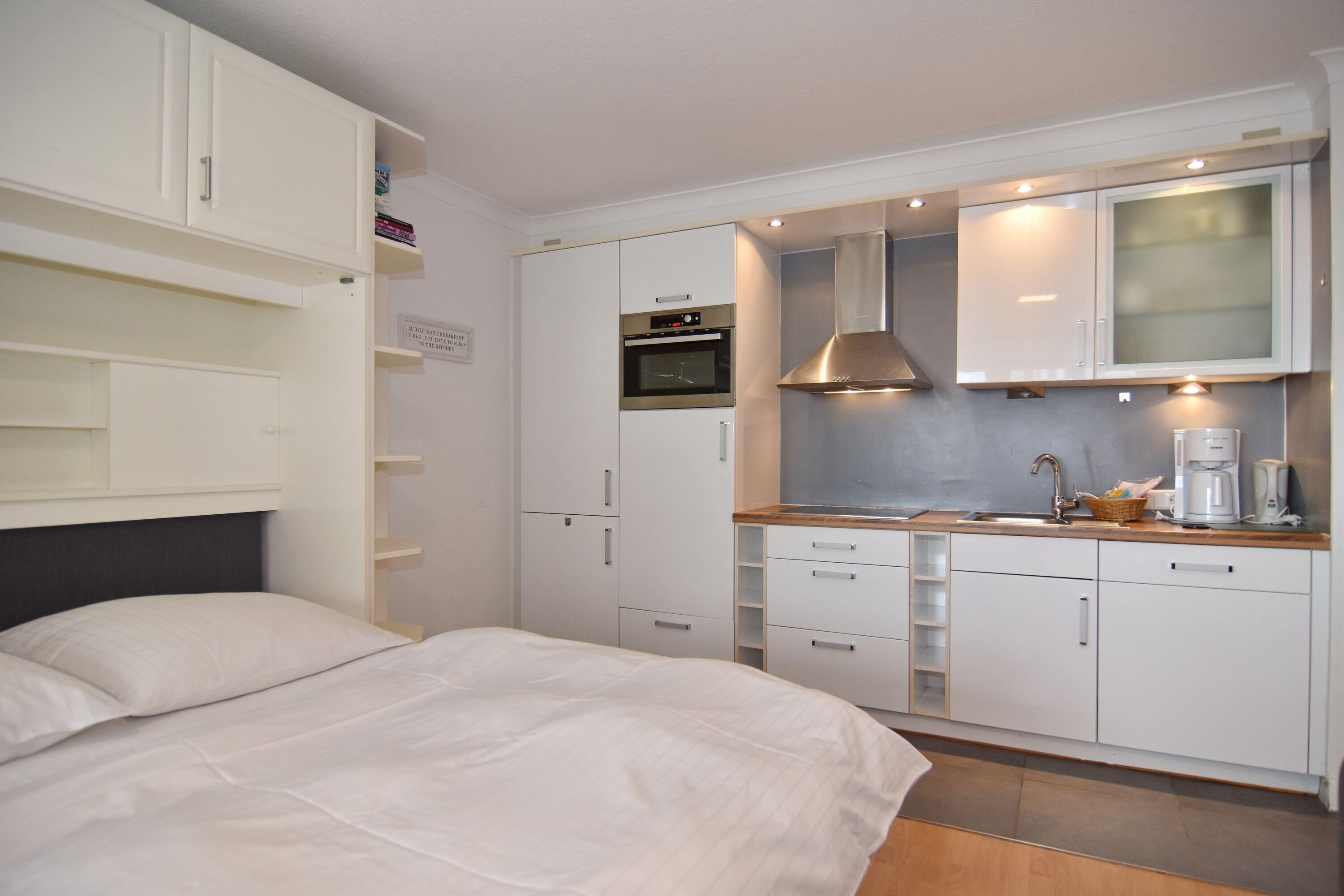 Moderne 1,5-Zi.-Ferienwohnung, ca. 45m², 1.OG, max. 2 Erwachsene und 2 Kinder. Nichtraucher-Whg.! [nbsp]Wohnzimmer mit Boxspringbett (160x200) - (Neu ab Juni 2025), Couch, 1 Sessel, Essplatz, Küchenzeile mit Geschirrspüler und Mikrowelle, Radio, Westaustritt (ohne Sitzmöglichkeit) mit teilweisen Meeresblick. Kleines Zimmer mit Etagenbetten (0,90x2m), Duschbad mit Doppelwaschbecken und Fußbodenheizung. Whg. ist mit Laminat ausgelegt. Fahrstuhl ist vorhanden - 4 Stunden sind dennoch zu gehen. Anschluß WLAN vorhanden, Zugangscode im Büro erfragen. Tierhaltung verboten. Pkw-Stellplatz kann kostenpflichtig hinzugebucht werden. Bettwäsche und Handtücher sind zur Anreise aufgezogen!