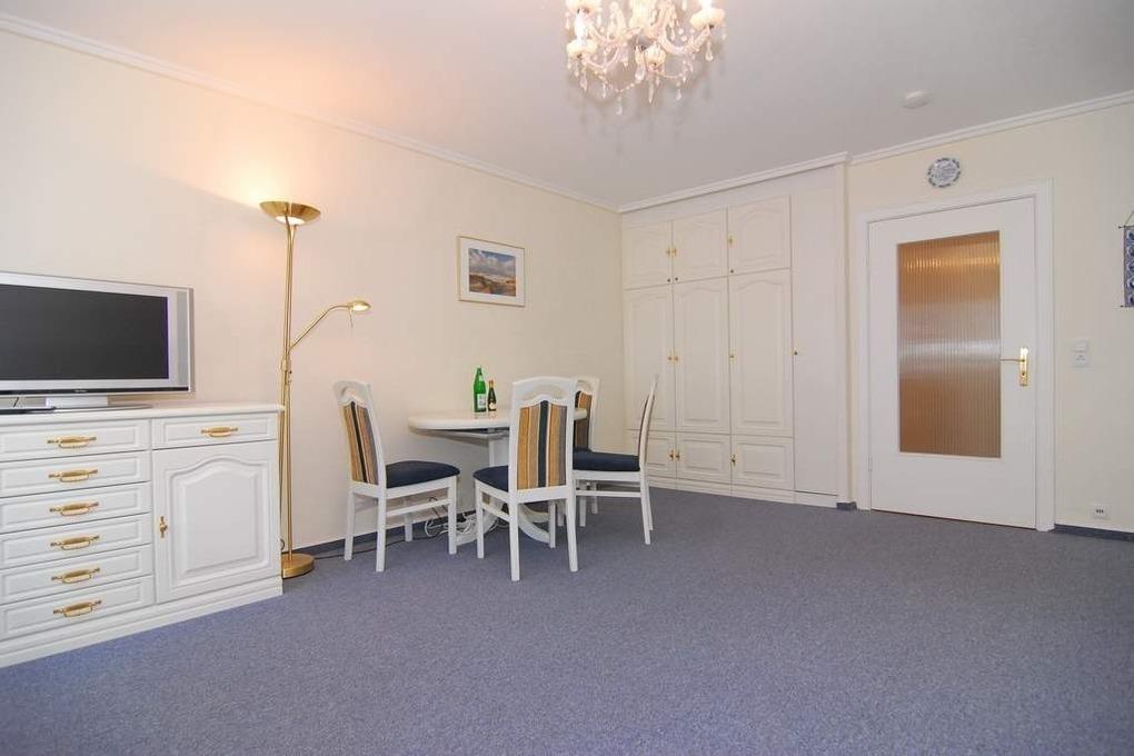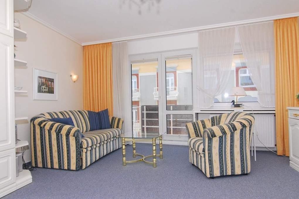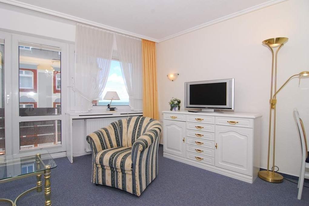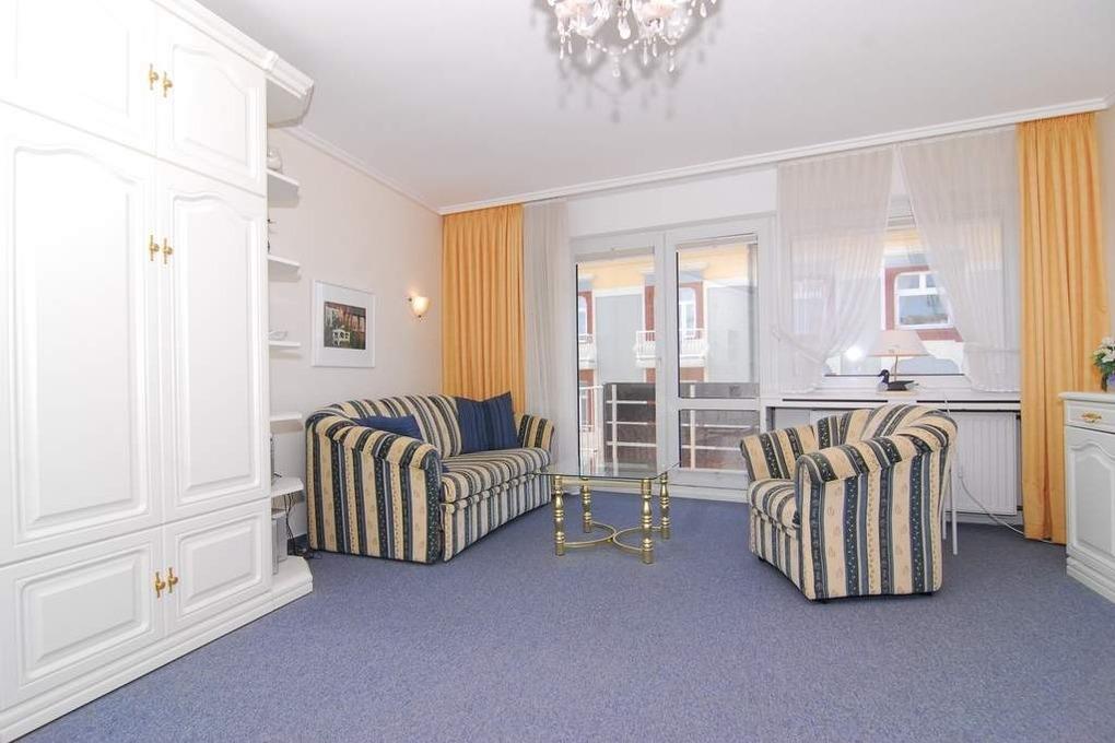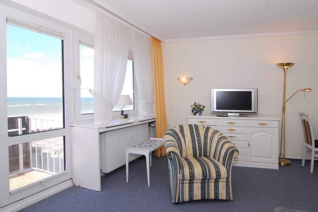 1-Zimmer-Ferienwohnung, ca. 40 m², 4. OG. "Nichtraucher". Wohn-/Schlafraum mit kleinem Westbalkon und teilweisem Meeresblick, Schrankwand mit Einzelschrankbetten, Eßtisch mit 3 Stühlen, 2 Sitzer-Couch, Sessel und Couchtisch, Sideboard, Kabel-Flat-TV, Radio, separate Küche mit 2 Platten Cerankochfeld, Mikrowelle und Geschirrspüler, Duschbad mit kleiner Runddusche, Fön und WC. Fahrstuhl vorhanden. Tierhaltung ist nicht gestattet. Pkw-Stellplatz kann kostenpflichtig hinzugebucht werden. Bettwäsche und Handtücher sind zur Anreise aufgezogen!