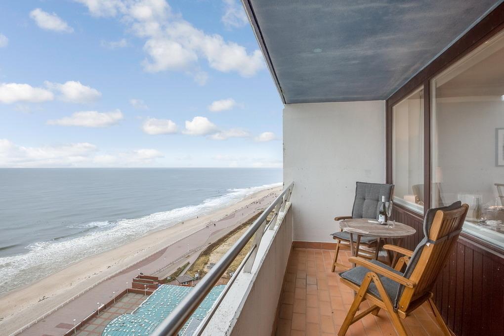 Exklusive 1-Zimmer-Ferienwohnung im 12.OG des Haus "Metropol" mit einmaligem Blick auf die Nordsee. Ca. 43m². Wohn- und Schlafzimmer mit eingebautem Doppelbett (2x80x200cm), Essplatz am Fenster und Couchecke mit Beistelltisch. Kabel-TV, Radio, WLAN (ohne Gewähr). Separate Küche mit Geschirrspüler, Mikrowelle und Cerankochfeld. Schickes Badezimmer mit Dusche. Garderobe im Flurbereich. Großer Westbalkon. Nichtraucherwohnung. Keine Tierhaltung.Bettwäsche und Handtücher sind zur Anreise aufgezogen. Ein PKW-Stellplatz kann kostenpflichtig zugebucht werden.