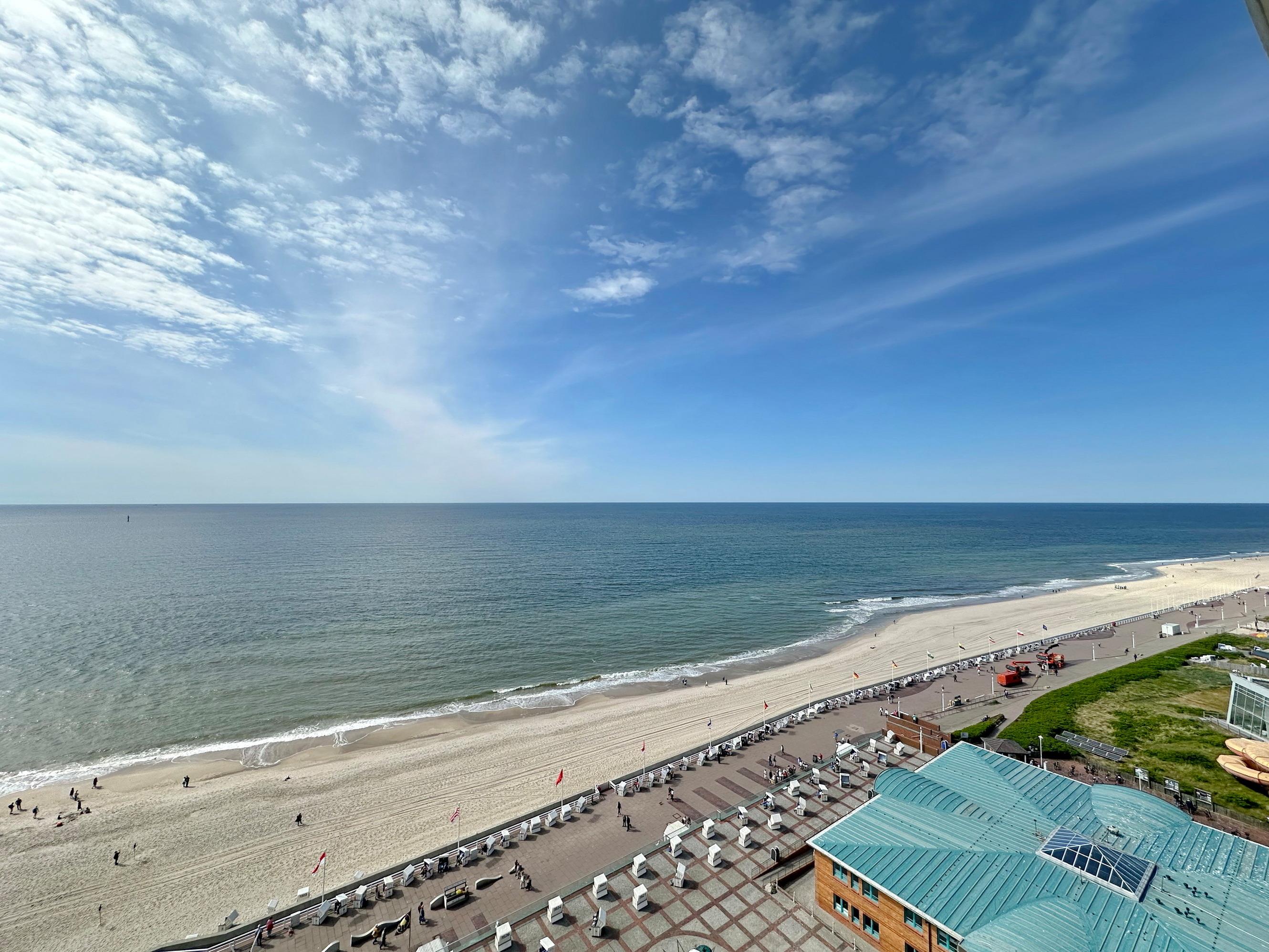 1-Zimmer-Apartment im 13. OG im Haus "Metropol" mit freiem Meeresblick, ca. 34 m², Nichtraucher. Großer Westbalkon mit Balkonmöbeln. Die Wohnung ist komplett gefliest. Wohn- und Schlafzimmer mit Podestdoppelbett (2x80x200), Essplatz am Fenster und 2-Sitzercouch und Sessel, Beistelltisch, TV, Radio. W-Lan (ohne Gewähr). Küchenzeile im Flurbereich mit Mikrowelle, Geschirrspüler und Cerankochfeld. Duschbad/WC. Tierhaltung ist nicht gestattet. Bettwäsche, Handtücher und ein PKW-Stellplatz können kostenpflichtig gebucht werden.