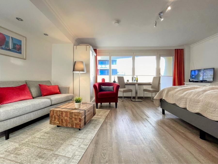 Das großes, moderne 1-Zimmer-Eck-Apartment im 1.OG vom Haus "Metropol" mit ca. 40 m² überzeugt durch sein großes gefliestes Wohn-/Schlafzimmer mit Doppel-Boxspringbett (160x200), Couchecke und Essplatz direkt am Fenster. Zudem finden Sie im Wohnbereich einen Flat-TV, ein Radio und WLAN (ohne Gewähr). Die zum Wohnzimmer offene Küchenzeile mit Backofen, Geschirrspüler und Cerankochfeld ist voll ausgestattet.[nbsp] Im Flur befindet sich der Zugang zum Duschbad mit WC. Der geschützter Ostbalkon mit Balkonmöbeln bietet die Möglichkeit auch draußen zu sitzen. Tierhaltung nach Anmeldung erlaubt. Bettwäsche und Handtücher sind zur Anreise aufgezogen. Ein PKW-Stellplatz kann kostenpflichtig zugebucht werden.