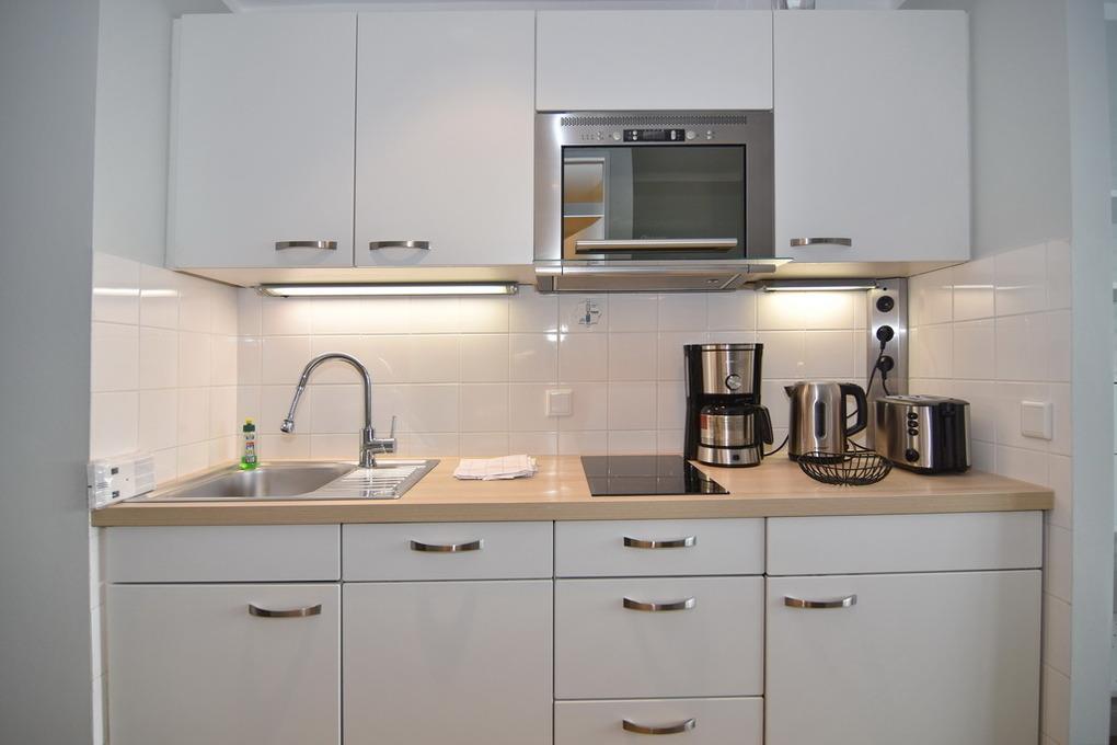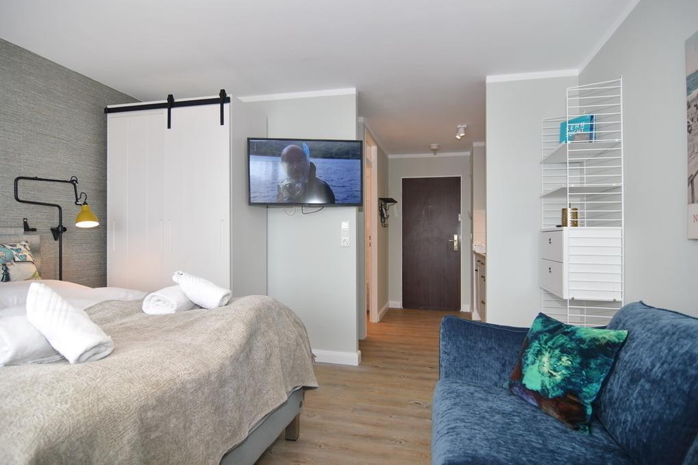 Modernes 1-Zimmer-Appartement im Haus Metropol, 3. OG mit Ostbalkon und Balkonmöbeln, ca. 30 m², Nichtraucher-Appartement. Wohn-/Schlafraum mit Doppelbett (Boxspringbett, 160x200) und Essplatz am Fenster, Sofa, Flat-TV, Radio und W-LAN ( ohne Gewähr ), Küchenzeile im Flurbereich mit Mikrowelle, Geschirrspüler und 2 Platten-Ceranfeld, Duschbad/WC. Tierhaltung ist nicht gestattet. Bettwäsche und Handtücher sind zur Anreise aufgezogen. Ein PKW-Stellplatz kann kostenpflichtig zugebucht werden.