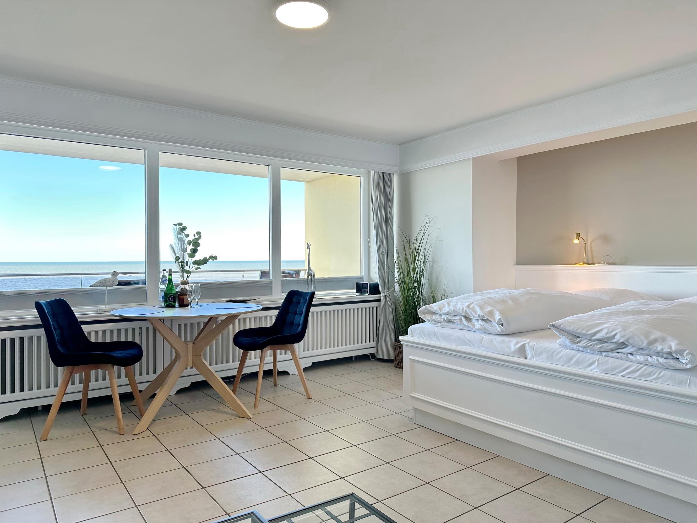 Großes 1-Zimmer-Apartment[nbsp][nbsp]im 1. OG des Haus "Metropol" mit Meeresblick. Ca. 45 m², Nichtraucher. Großes Wohn-/Schlafzimmer mit Doppelbett (2x90x200) und Einbauschrank, Sitzecke bestehend aus Sofa und Sessel, Essplatz am Fenster, Flat-TV, Radio, W-Lan (ohne Gewähr). Separate Küche mit Geschirrspüler, Mikrowelle und 2-Platten-Cerankochfeld. Duschbad/WC und Diele. Sonniger Westbalkon mit Balkonmöbel und Meeresblick. Das Apartment ist komplett gefliest. Tierhaltung ist nicht gestattet. Bettwäsche und Handtücher sind zur Anreise aufgezogen. Ein PKW-Stellplatz kann kostenpflichtig zugebucht werden.