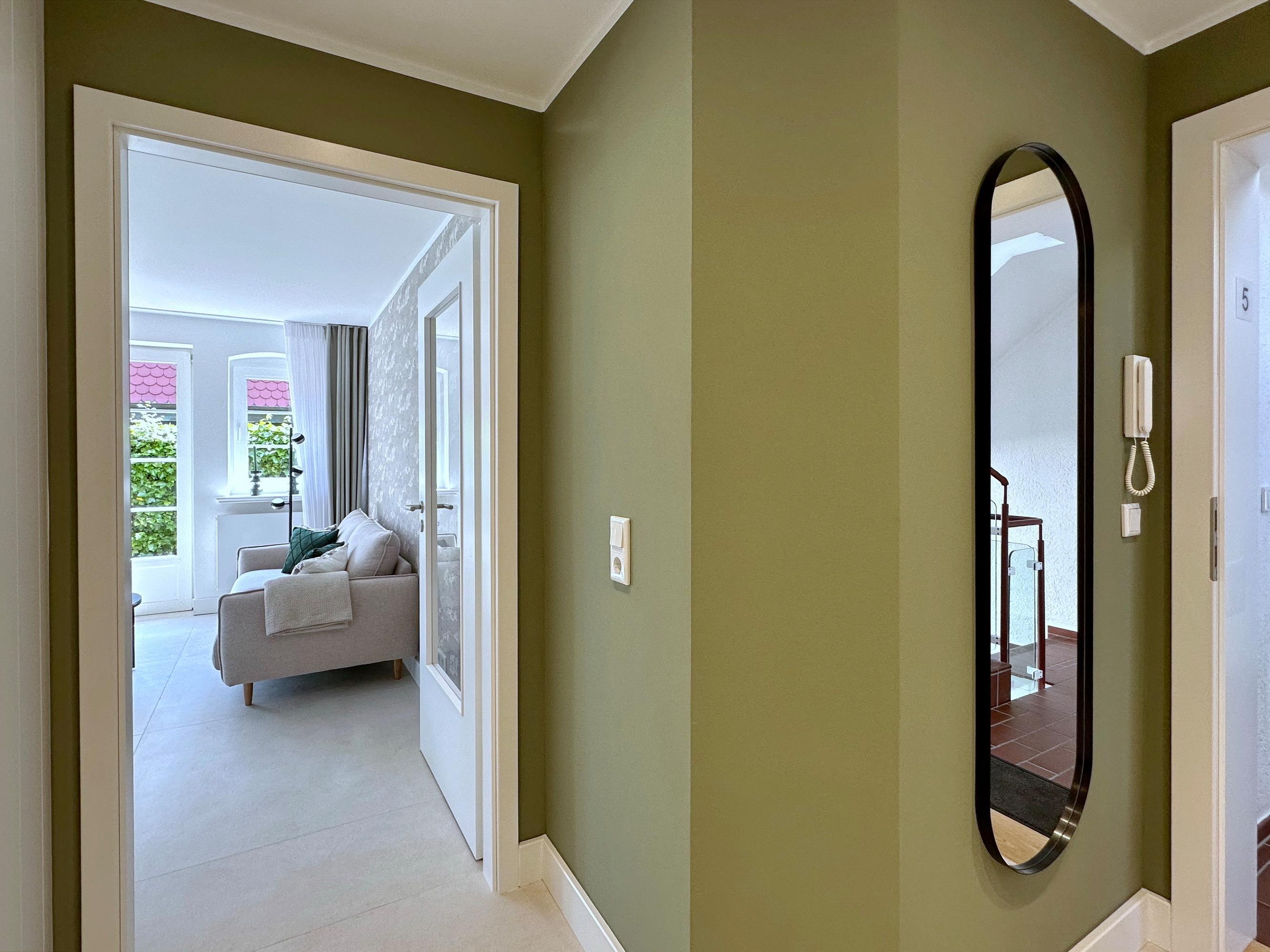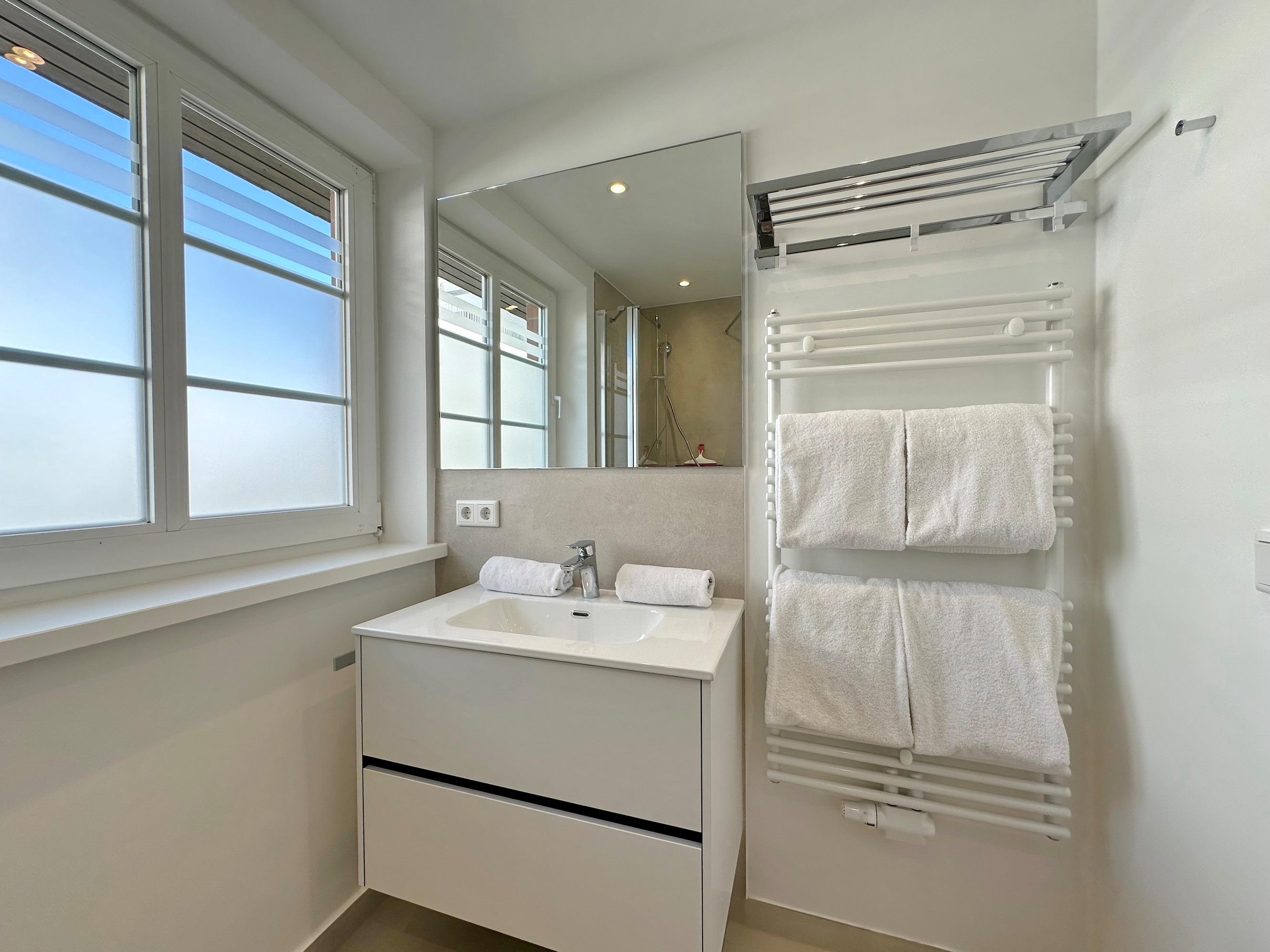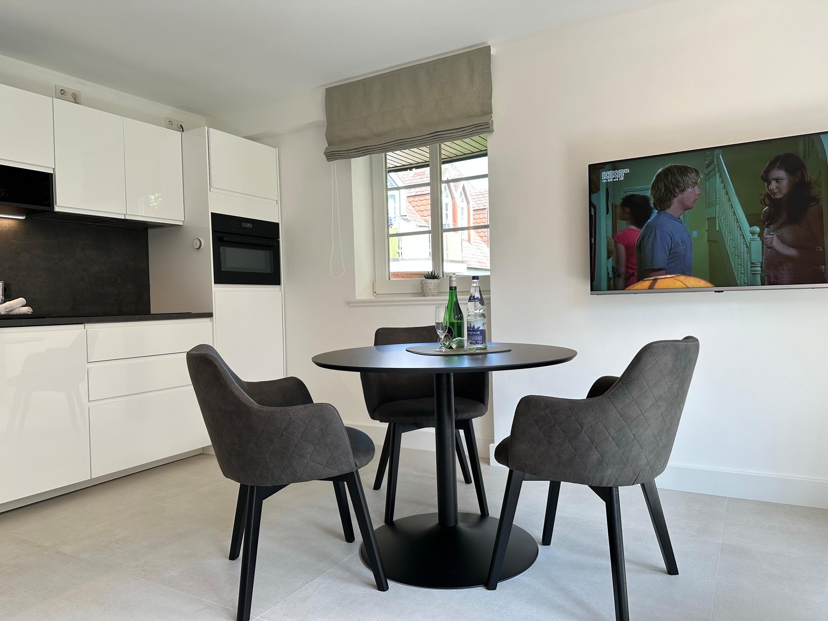 Die Wohnanlage "Olympia" bietet eine zentrale Lage in kurzer Entfernung zur Promenade, dem Badestrand und dem Meer. Auch die Fußgängerzone ist nur wenige Gehminuten entfernt. Die 2-Zimmer-Wohnung wurde im Jahr 2025 renoviert und ist für 2 Personen geeignet. Sie hat eine Größe von ca. 43 m² und besteht aus einem Wohn- und Esszimmer mit Couchecke, Essplatz und integrierter Küche. Die Küche ist mit einem Induktionskochfeld, einem Geschirrspüler und einer Mikrowelle mit Grillfunktion ausgestattet. Vom Wohnzimmer aus gelangt man auf die geschützte und möblierte Südterrasse. Im Schlafzimmer befindet sich ein Box-Spring-Doppelbett, Einbauschränke und ein weiterer Flat-TV. Das moderne Duschbad verfügt über ein Fenster. Im Dielenbereich befinden sich Einbauschränke und eine Garderobe für Jacken und andere Dinge. WLAN steht zur Verfügung, jedoch ohne Gewähr. Das Mitbringen von Haustieren und das Rauchen sind nicht gestattet. Bei Anreise sind Bettwäsche und Handtücher bereits aufgezogen. Die Wohnanlage verfügt über einen Schwimmbad- und Saunabereich sowie einen zusätzlichen Wellnessbereich mit finnischer Sauna, Dampfsauna und Ruhebereich. Fahrzeuge können gegen Gebühr und vorheriger Anmeldung in der Tiefgarage abgestellt werden. Eine Waschmaschine und ein Trockner stehen kostenfrei zur Verfügung. Für Fahrräder gibt es einen Abstellbereich in der Garage.