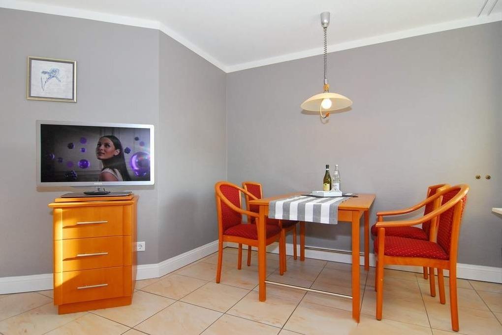 Hübsche 2-Zimmer-Ferienwohnung im Haus "Olympia IV" im 1.OG mit sonnigem Südwestbalkon. Ca. 50m². Nichtraucherwohnung. Wohnzimmer mit Küchenzeile mit Geschirrspüler und Mikrowelle, Doppelschlafcouch und Essplatz für 4 Personen, Duschbad/WC, Schlafzimmer mit Doppelbett, Flur mit Garderobe, TV / Radio. Unter Haus 4 befindet sich das Schwimmbad mit Finnischer Sauna. Unter Haus 2 befindet sich ein separater Wellnessbereich mit Dampfsauna, Finnischer Sauna und Ruhebereich. Eine Waschküche mit Gemeinschaftswaschmaschine/Trockner ist vorhanden. Offenes W-LAN-Netzwerk steht zur Verfügung (ohne Gewähr). Bettwäsche und Handtücher sind zur Anreise aufgezogen. Ein Garagenstellplatz kann kostenpflichtig gebucht werden!