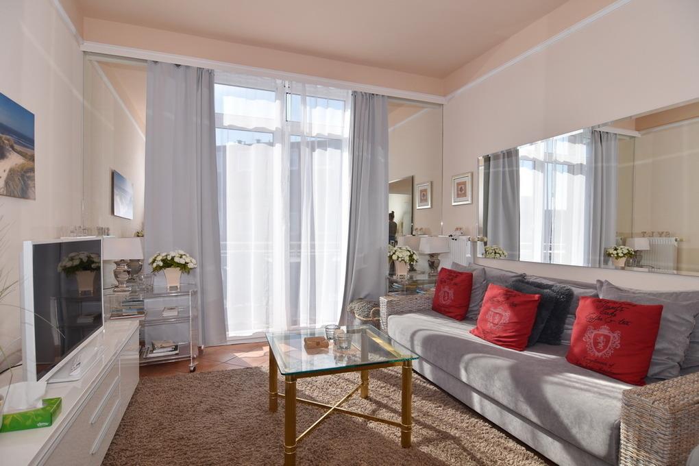 Liebevoll eingerichtete 2-Zimmer-Ferienwohnung im roten Haus der Residenz Mauritius. Auf ca. 39m² im 1. OG. bietet Ihnen diese Wohnung einen Wohnraum mit gemütlicher Sitz- und Essecke sowie eine Küchenzeile mit Mikrowelle und Geschirrspüler. Das Sofa lässt sich mühelos zu einer Schlafmöglichkeit für 2 Personen umwandeln. Vom Wohnzimmer aus gelangen Sie auf den großen Westbalkon mit Strandkorb, Tisch und Stühlen - hier genießen Sie die Sonne bis in die Abendstunden. Das Duschbad/WC und das separate Schlafzimmer mit eigenem TV runden das Angebot ab. Das Apartment ist komplett gefliest. Internetanschluß (ohne Gewähr) ist vorhanden. Eine Waschküche und ein Fahrradkeller befinden sich im Nebenhaus "Mauritius". Tierhaltung ist gestattet und muss bitte angemeldet werden. Pkw-Stellplatz kann kostenpflichtig hinzugebucht werden. Bettwäsche und Handtücher sind zur Anreise aufgezogen!