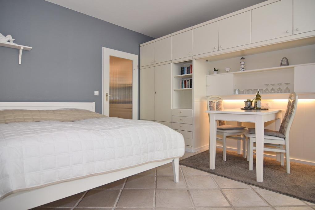 1-Zimmer-Ferienwohnung, ca. 35 qm; Nichtraucher-Whg. Zentrale Lage u. nur 200 m zum Strand![nbsp][nbsp]Wohn-/ Schlafraum mit Doppelbett (2x80x200), Eckcouch, Nordbalkon mit Balkonmöbeln, Radio und Flat-TV, Eßplatz, im Flurbereich weiße Friesenküche mit Geschirrspüler und Microwelle, Dusche / WC. Münz-Waschmaschine und Trockner im Keller, Tierhaltung ist nicht gestattet! v PKW-Garagenstellplatz /Durchfahrtshöhe 1,80m (79/01) kann kostenpflichtig dazu gebucht werden, ist direkt im Haus. Bitte bei der Buchung mitbestellen, ansonsten kein Anspruch