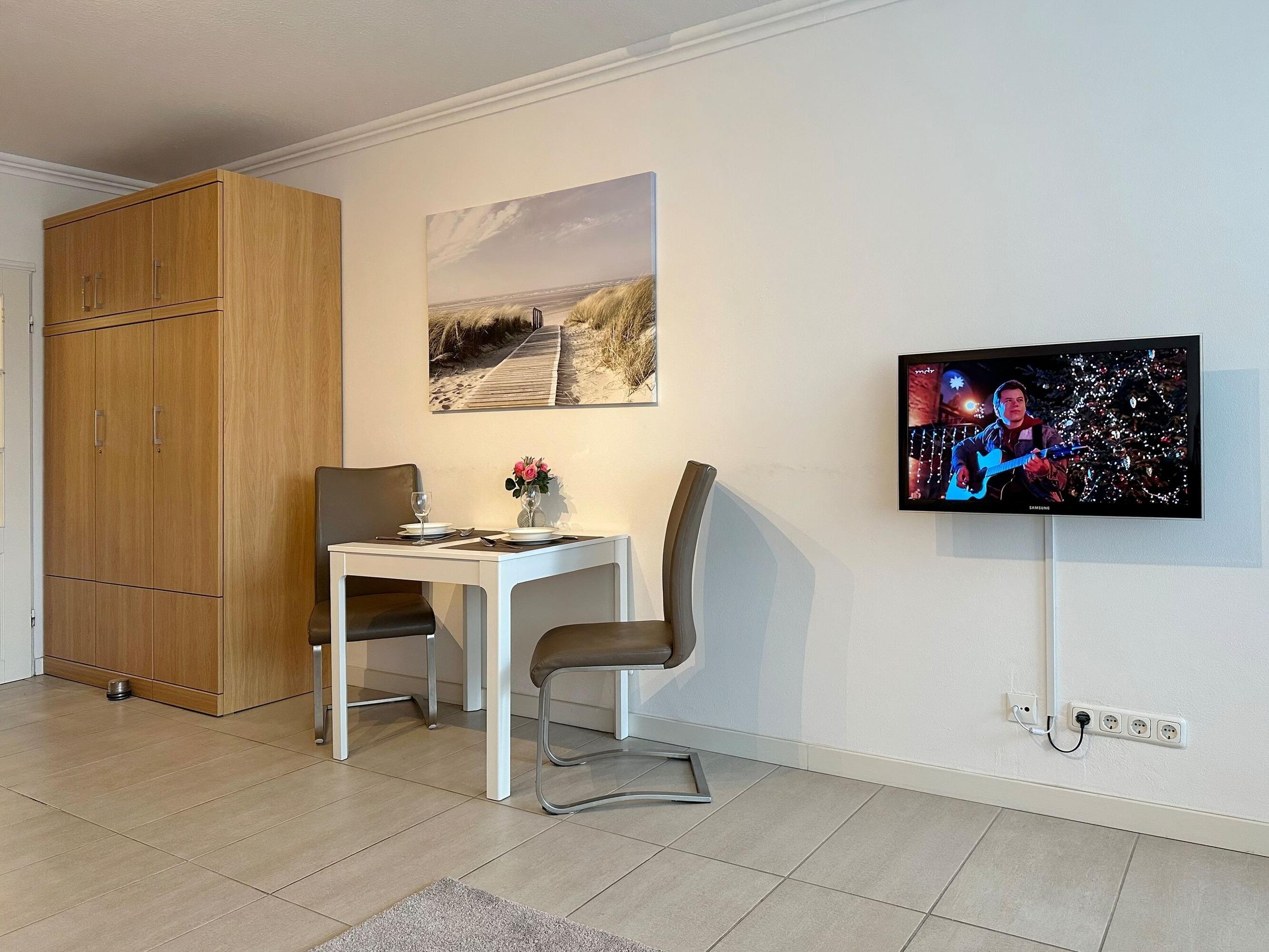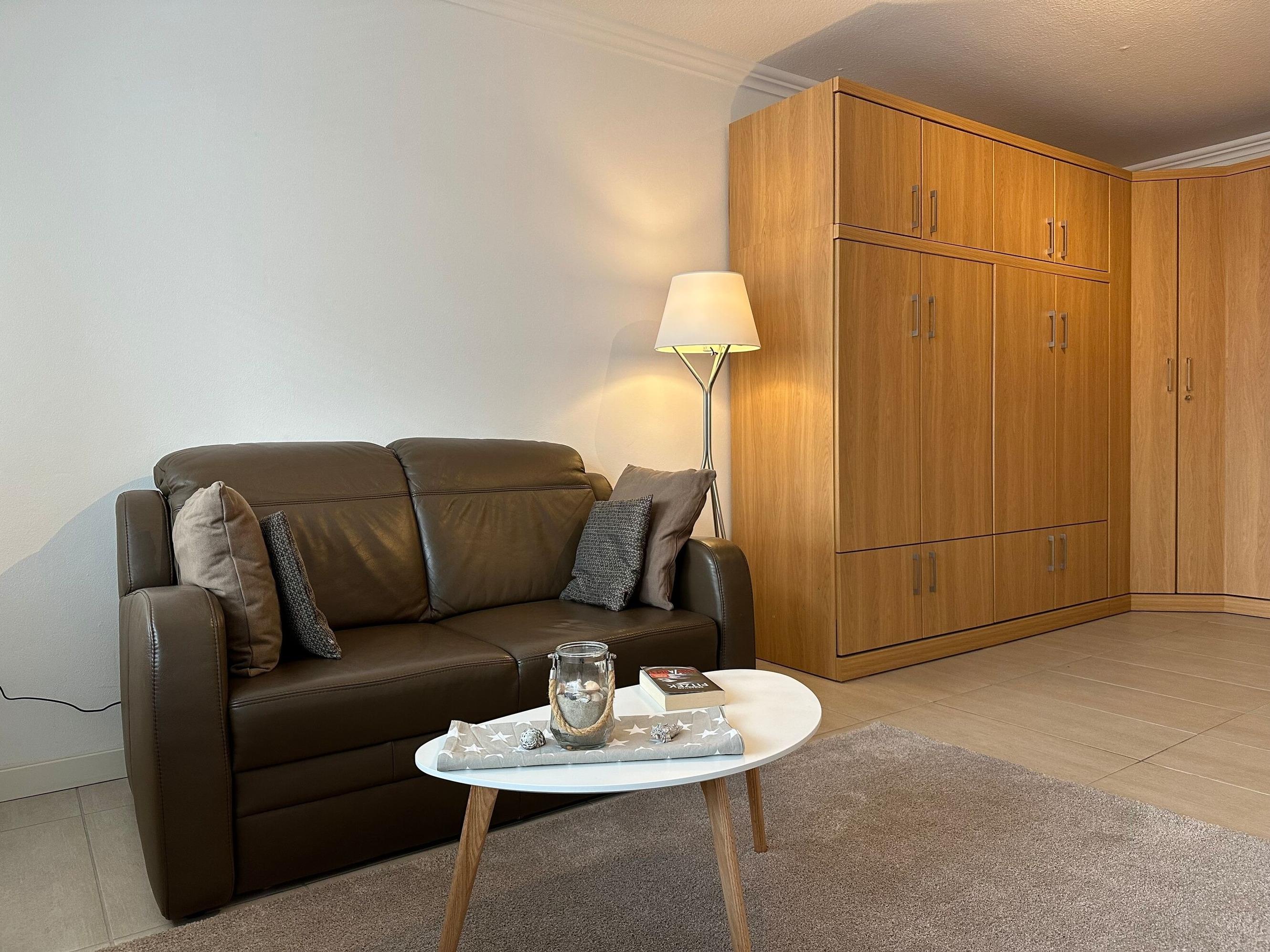 1-Zimmer-Wohnung in zentraler Lage Westerlands, nur wenige Meter bis zum Strandübergang. Kombinierter Wohn-/ Schlafraum mit Einzelschrankbetten, Essplatz und Sofa, TV und WLAN, Zugang zum möblierten Südbalkon. Im Flurbereich der Wohnung befindet sich die Garderobe und die neue Küchenzeile mit Induktionsherd, Geschirrspüler, Backofen und Kühlschrank mit Gefrierfach. Geräumiges Duschbad / WC mit Fenster. Tiefgaragenstellplatz inklusive. Fahrstuhl im Haus vorhanden und ebenerdig zu erreichen. Zur Wohnung gehört der Garagenstellplatz Nr. 139.